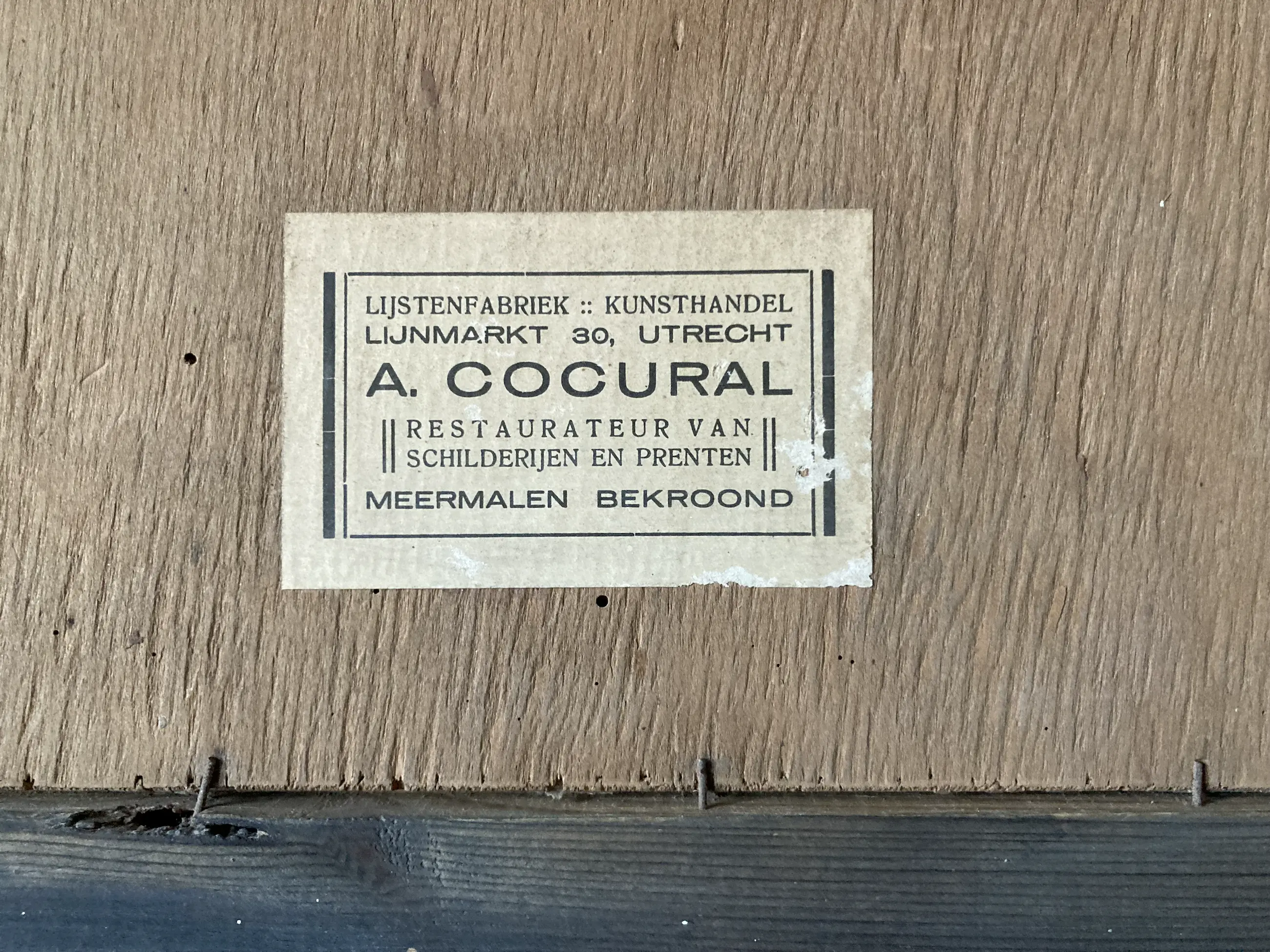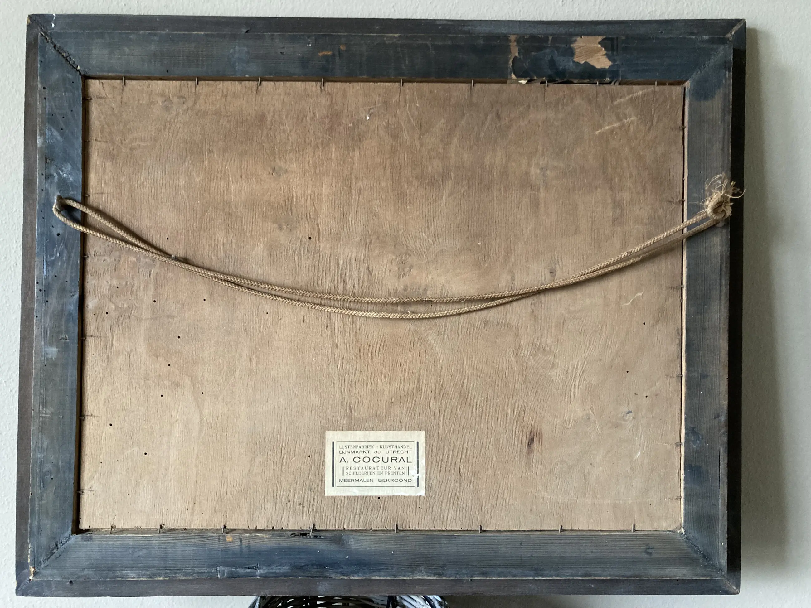 Lijst en achterkant triplex bord vertonen sporen van houtworm. Deze is niet meer actief. Voorkant schildering slechts twee kleine gaatjes zichtbaar naast handtekening. (zie foto). Niet storend, onopvallend.