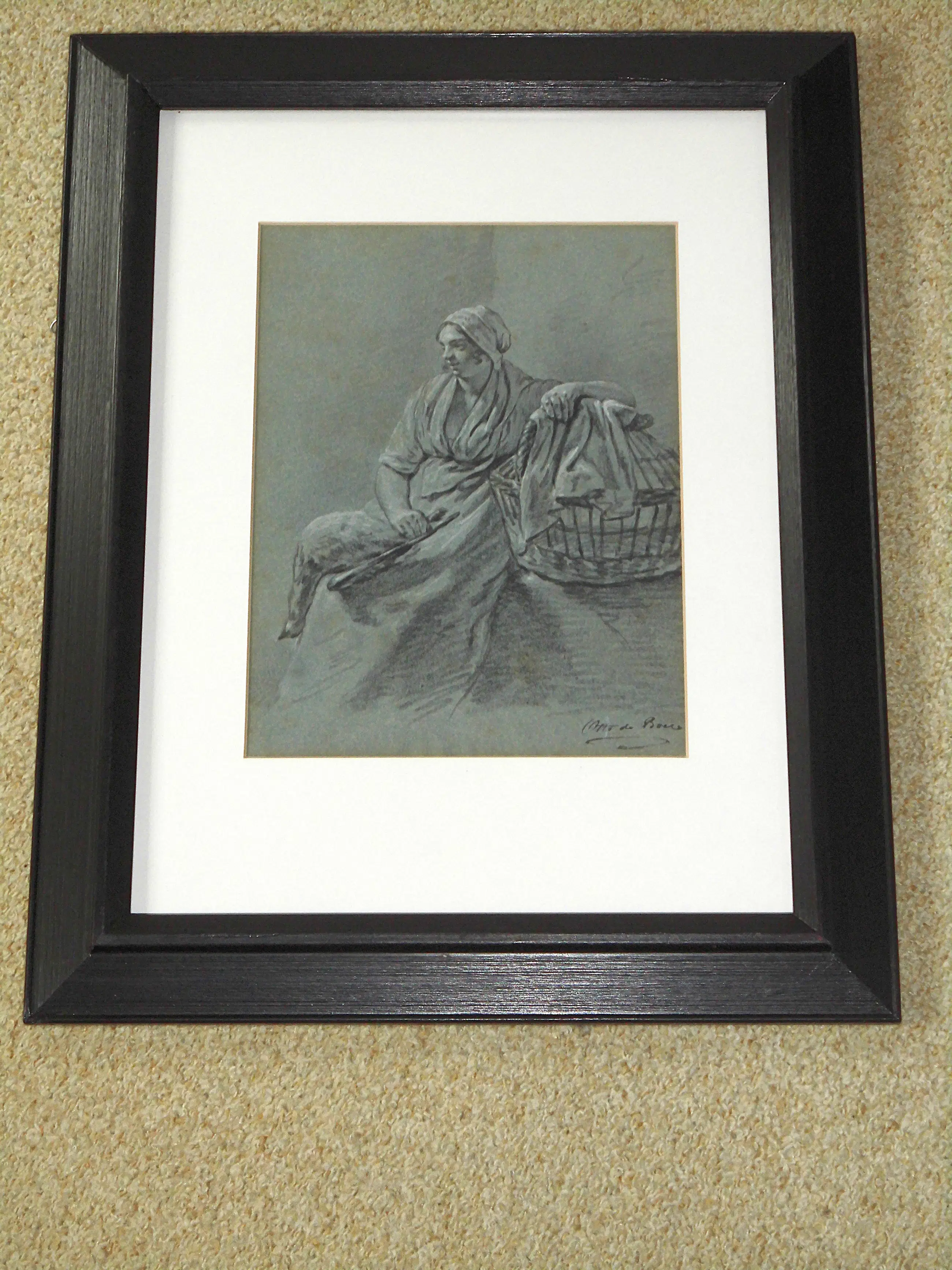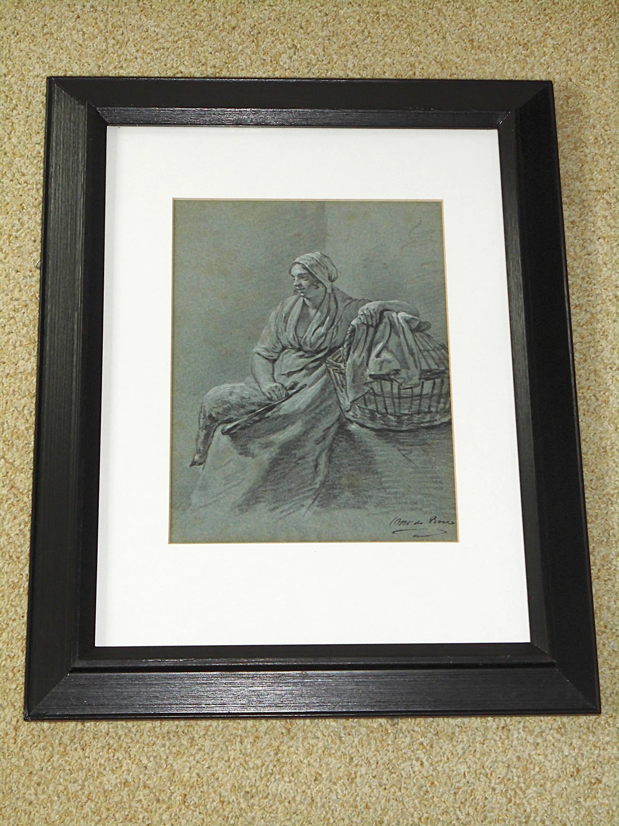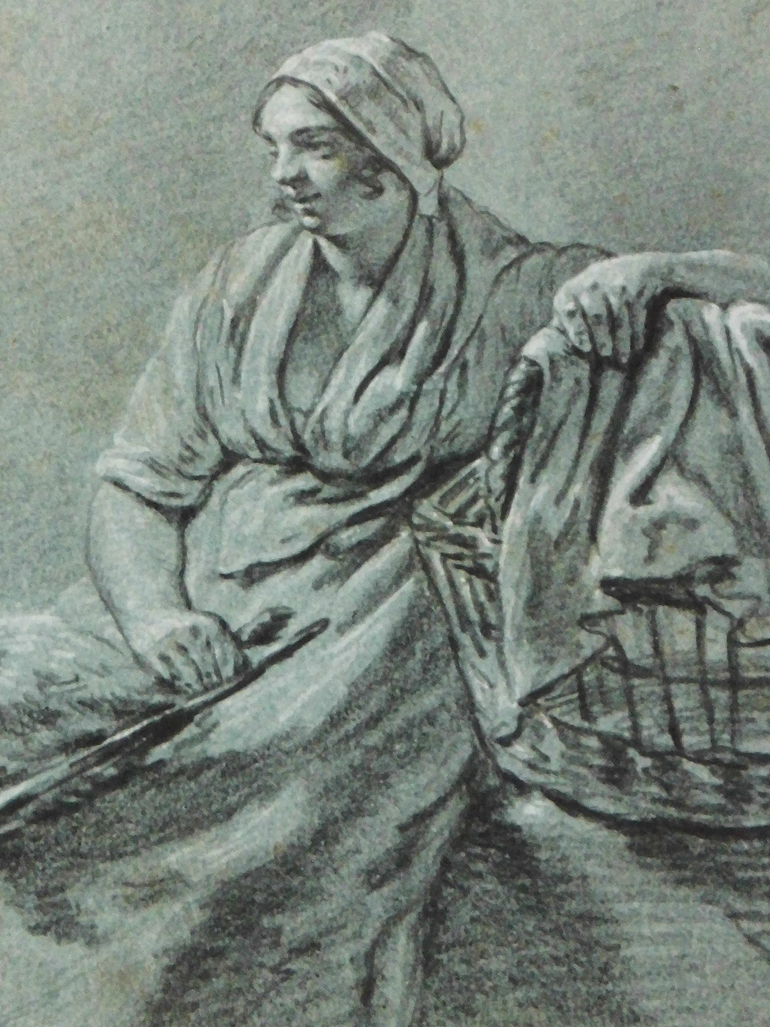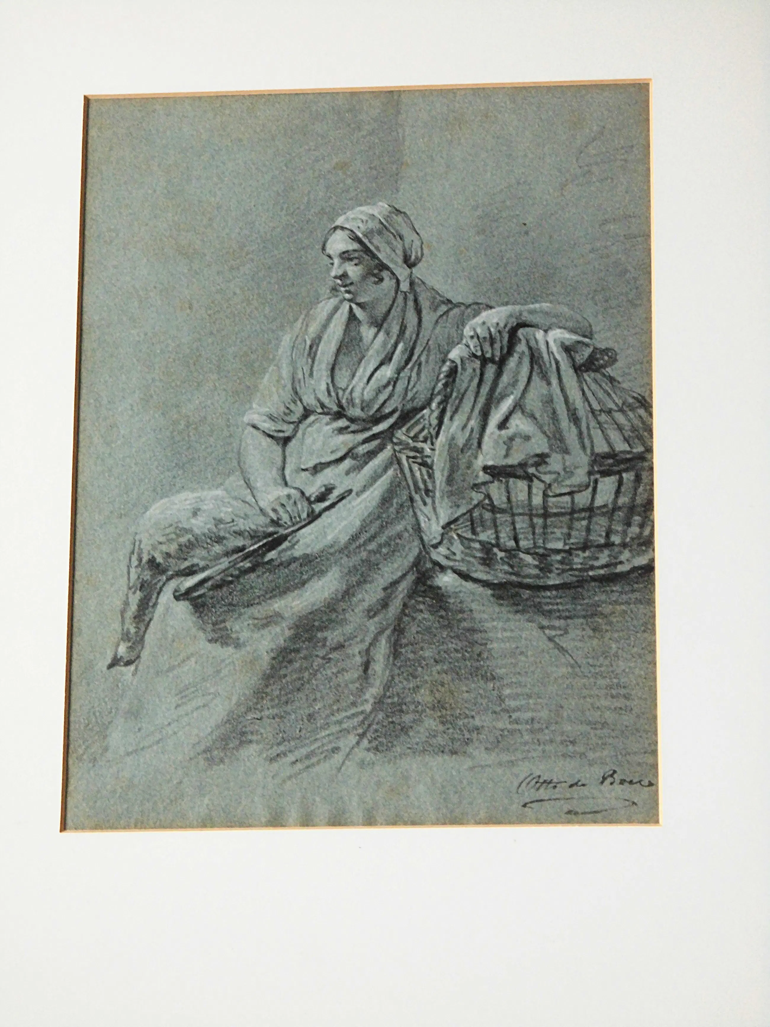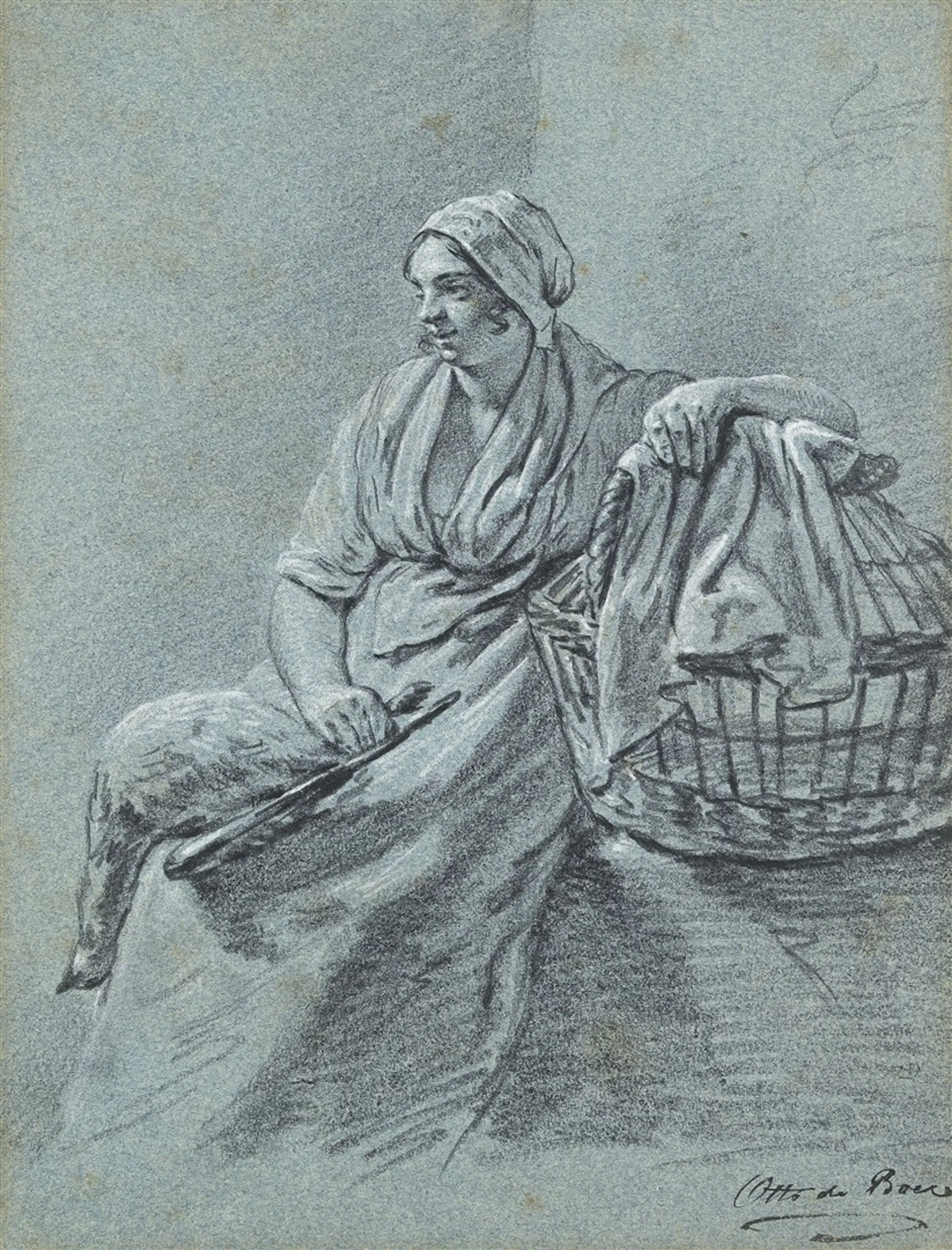 Ganzenmeisje met een gans op haar schoot en een mand, gesigneerd, tekening met witte accenten op grijsblauw papier