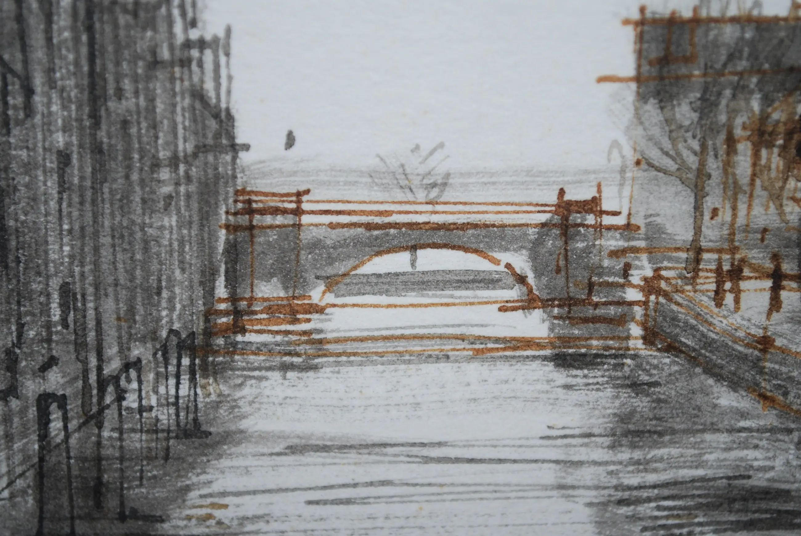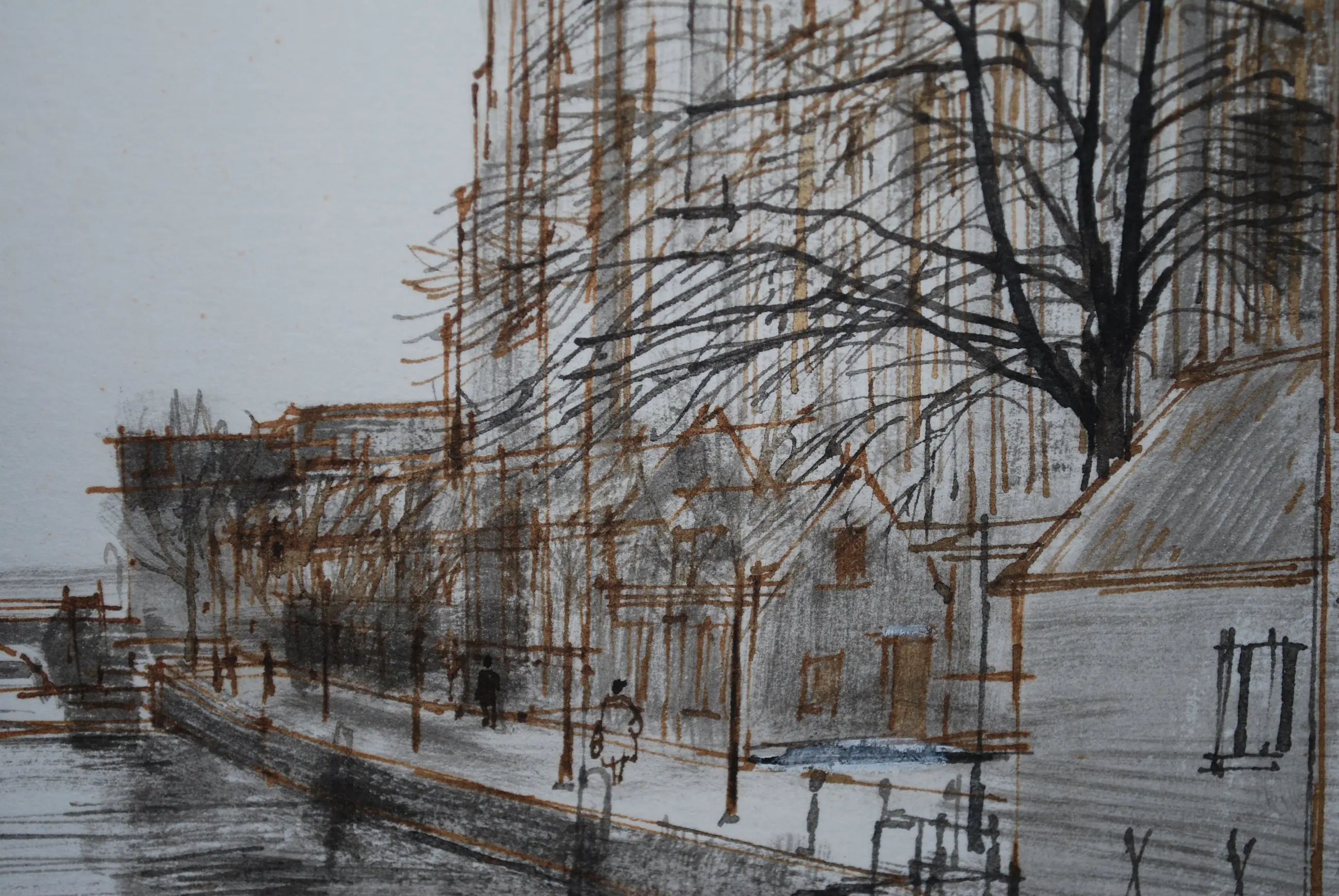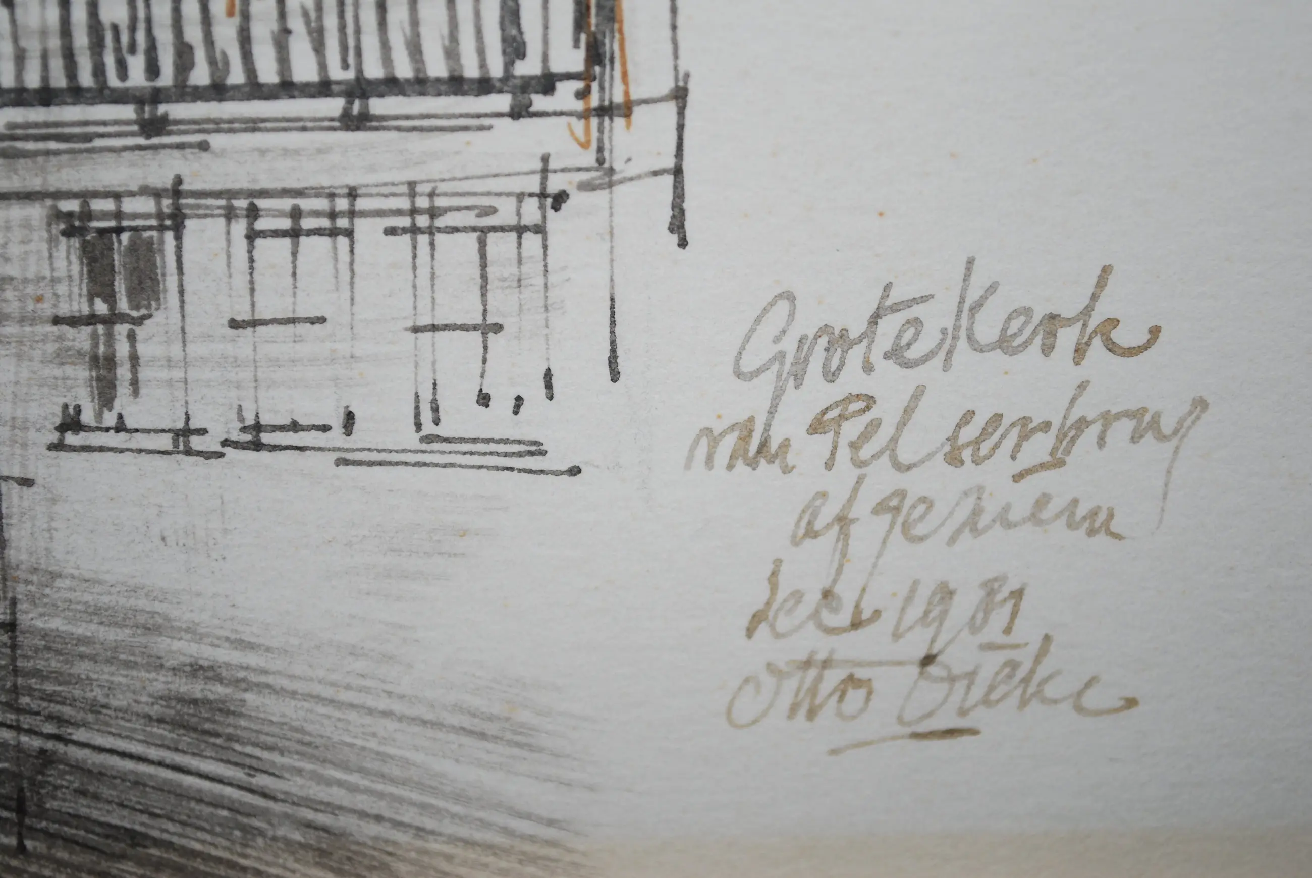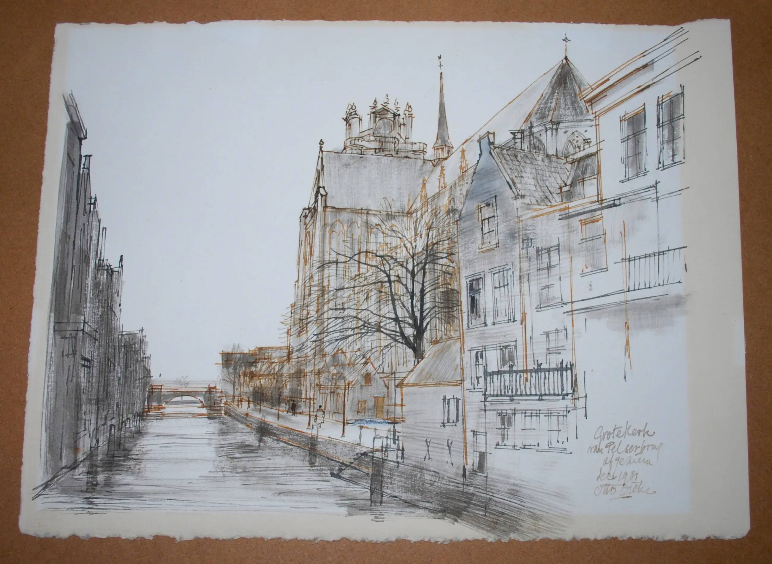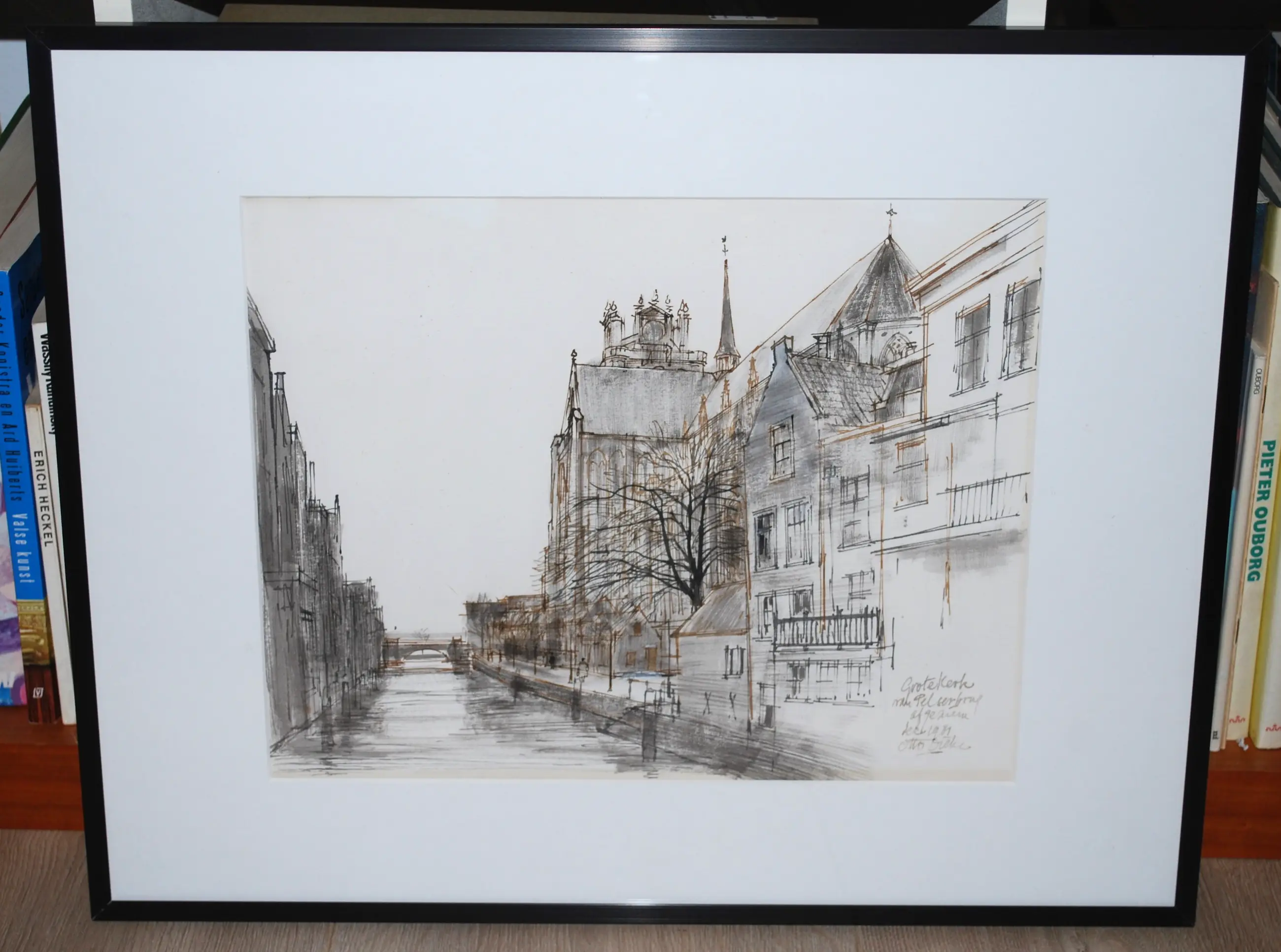 De Grote kerk van Dordt gezien vanaf de Pelserbrug (Voorstraatshaven). Zeer kundige tekening in zwarte en sepia inkt op stevig papier, 28x38 cm. Achter een mooi helder passepartout. Achter glas, in een fraaie smalle zwarte alu lijst met speciaal profiel (zie de laatste foto).