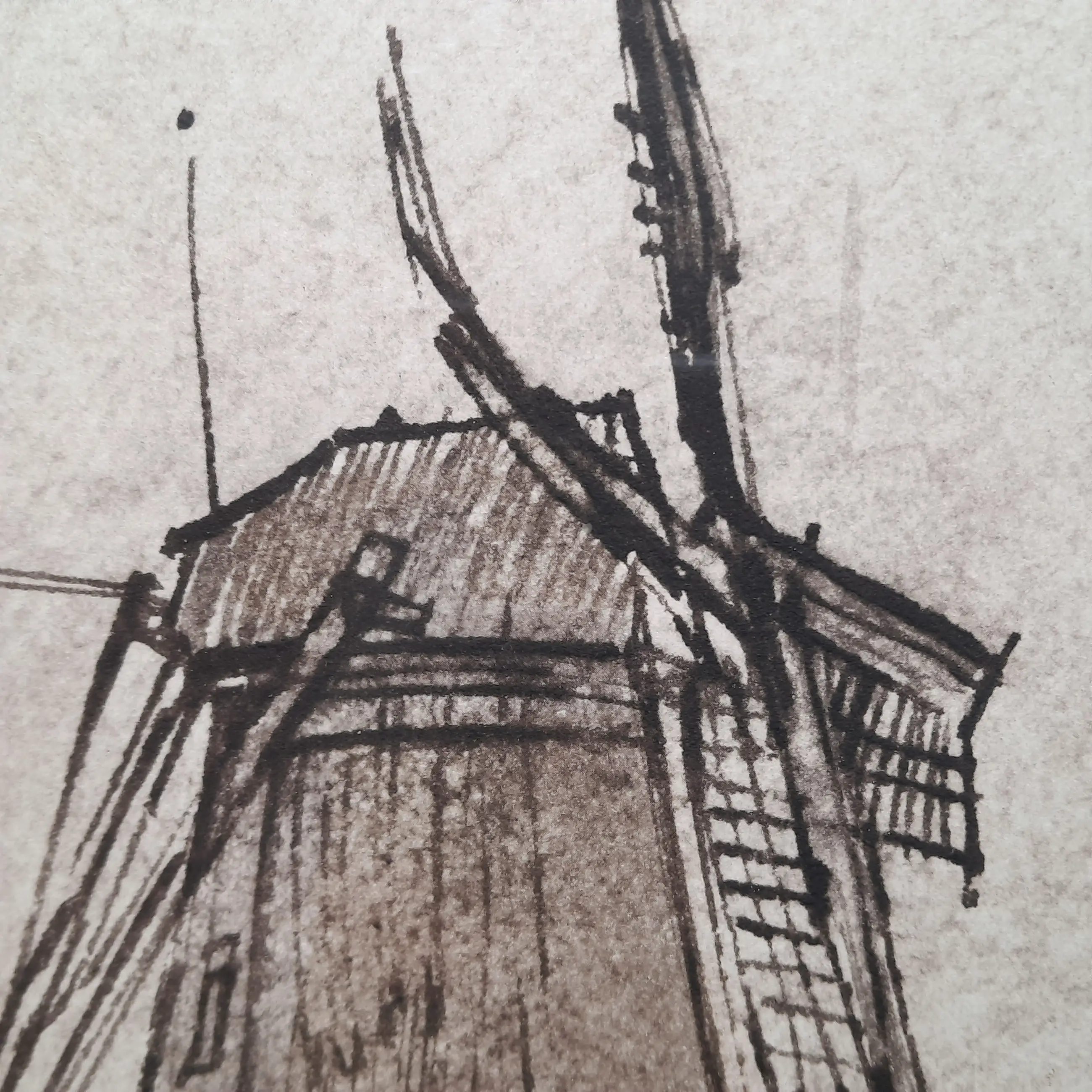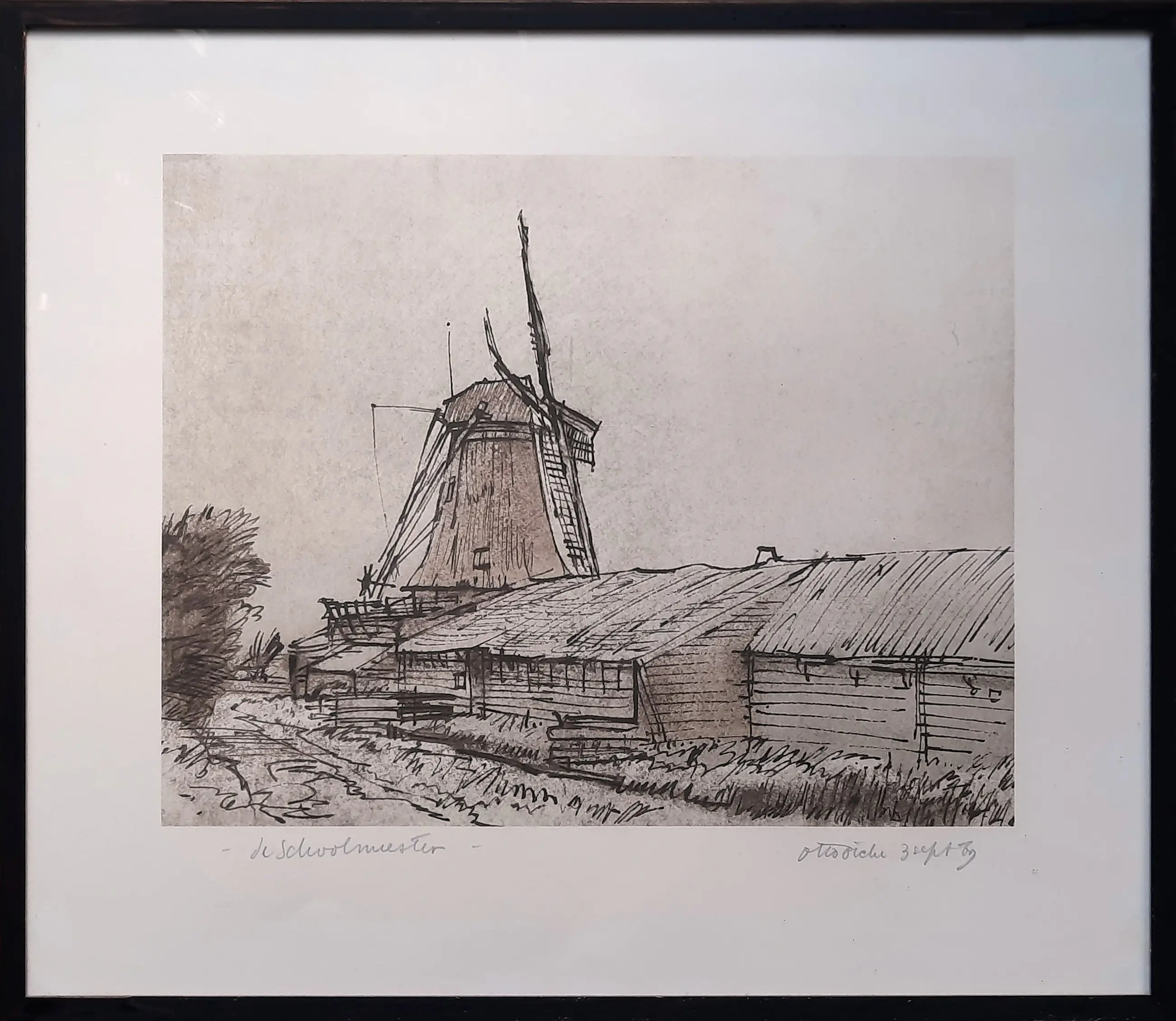 Beeld is 25 x 32 cm. In houten lijstje met gebruikssporen, achter glas. Otto Dicke (Dordrecht, 3 mei 1918 - aldaar, 7 december 1984) was een Nederlands beeldend kunstenaar, tekenaar en illustrator, cartoonist, striptekenaar, illustrator van kinder- en andere boeken en ontwerper van mozaïeken voor scholen en kerken. Otto Dicke was een bekende kunstenaar met een hechte band met Dordrecht en omgeving. Bijna 50 jaar had hij een atelier in het gebouw van Teekengenootschap Pictura. 'Een leven getekend' is de titel van de documentaire die Wendeline Wilmink in 1983 vervaardigde over het leven en werk van Otto Dicke. De film geeft een beeld van de veelzijdigheid van deze autodidact. Vaak verbleef hij in zijn geliefde Alblasserwaard en op het Eiland van Dordrecht, waar hij talloze schetsen vervaardigde. Otto Dicke heeft onder andere de illustraties verzorgd in het boek Verzet in en om Dordt van K. van Loon.