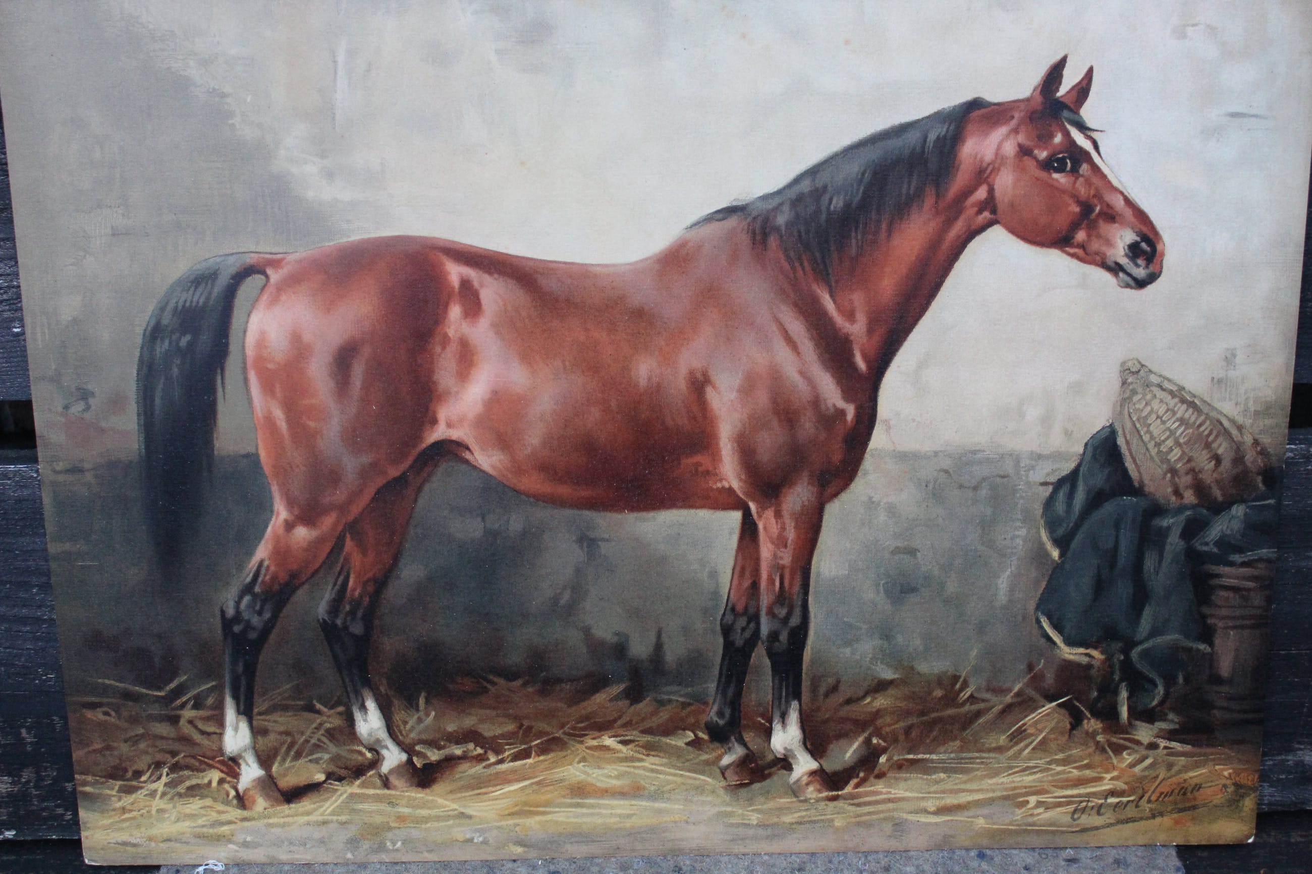 Uit het kunstalbum Paardenrassen van Otto Eerelman een choromolithografie van het Mecklemburgsche paard. Voor zijn leeftijd in een redelijke tot goede conditie. Wel wat gebruikssporen met name aan de randen.