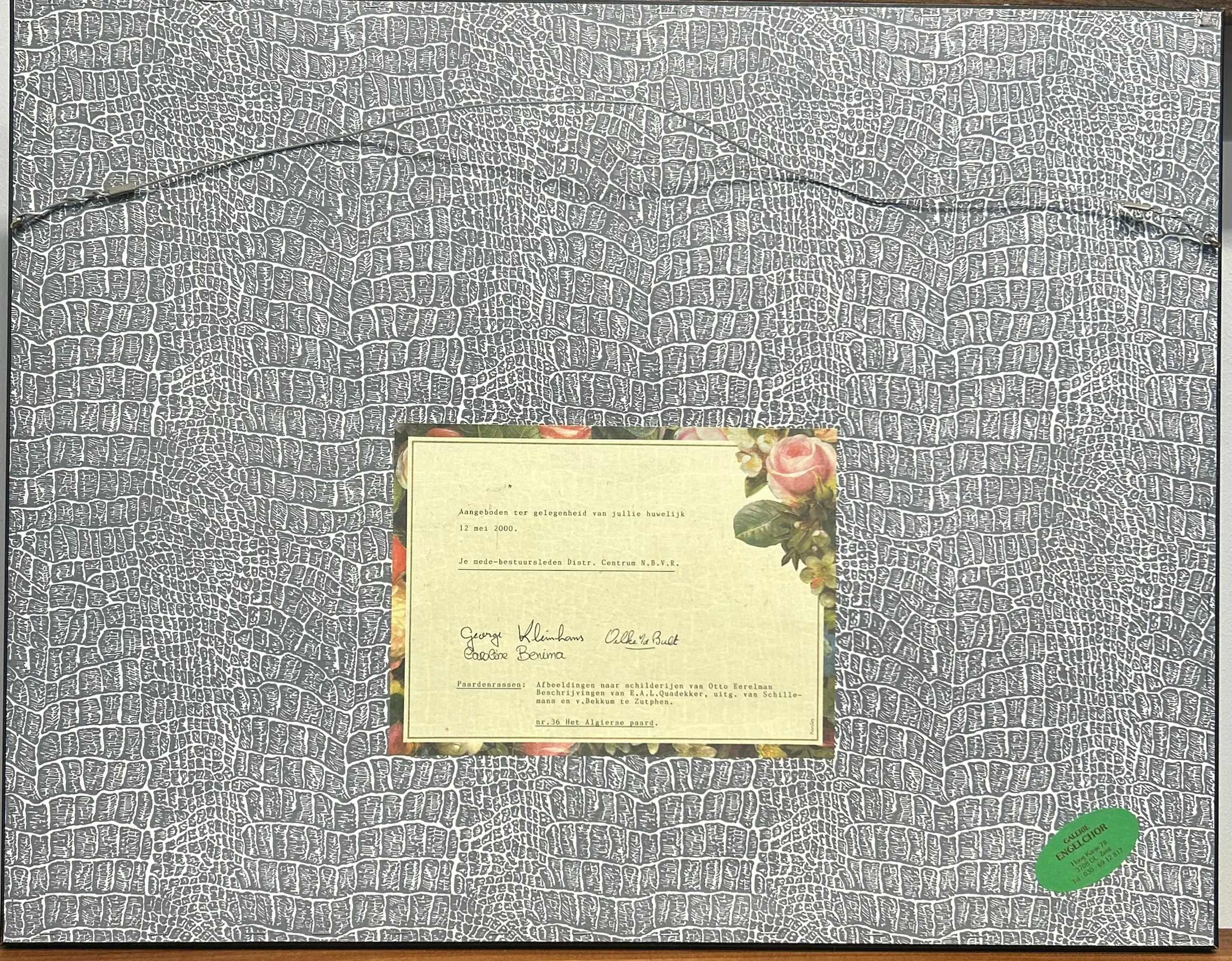 Chromolithografie van Otto Eerelman – Het Algierse Paard (nr. 36) Mooie en verzorgde chromolithografie getiteld Het Algierse Paard, nummer 36. Het werk is ingelijst in een bijpassende lijst en presenteert zich fraai. Volgens een vermelding is het ooit als cadeau gegeven ter gelegenheid van een bruiloft. Een aantrekkelijk en decoratief kunstwerk, zeker voor liefhebbers van paarden en klassieke prenten. Zie foto’s voor meer details en een goede indruk van de staat.