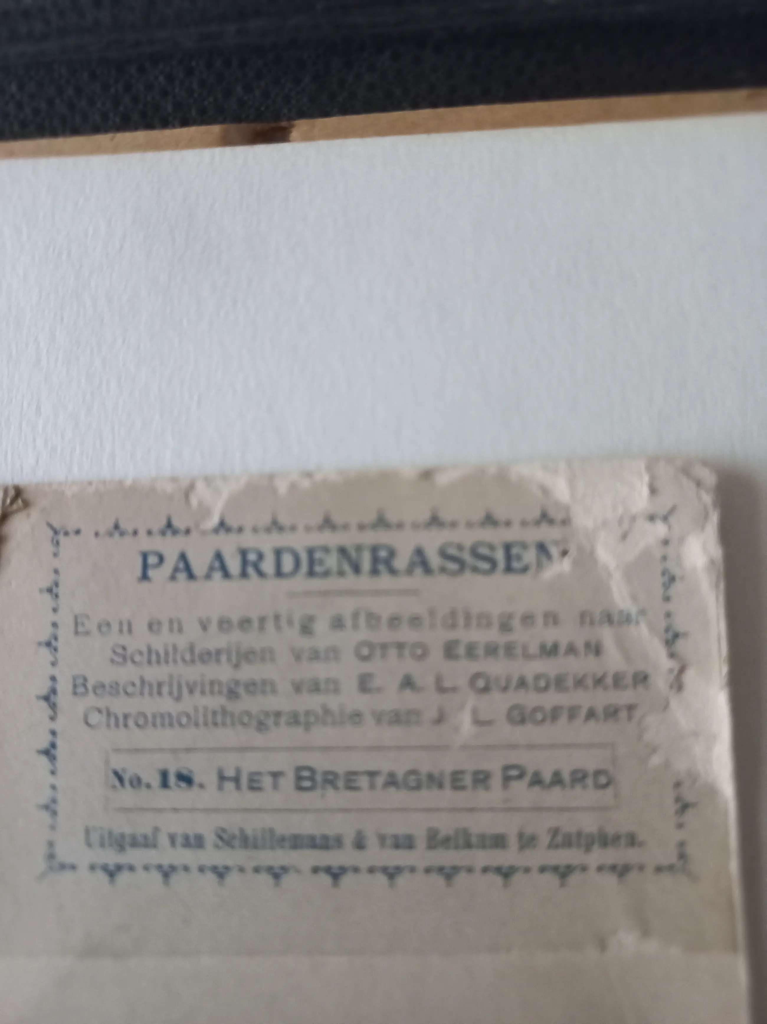 Prachtige chromolithographie Nr.18 het Bretagner paard Beschrijvingen van E.A.L. Quadekker Een van veertig kleuren afbeeldingen naar schilderijen van Otto Eerelman Zeer oude chromotitho