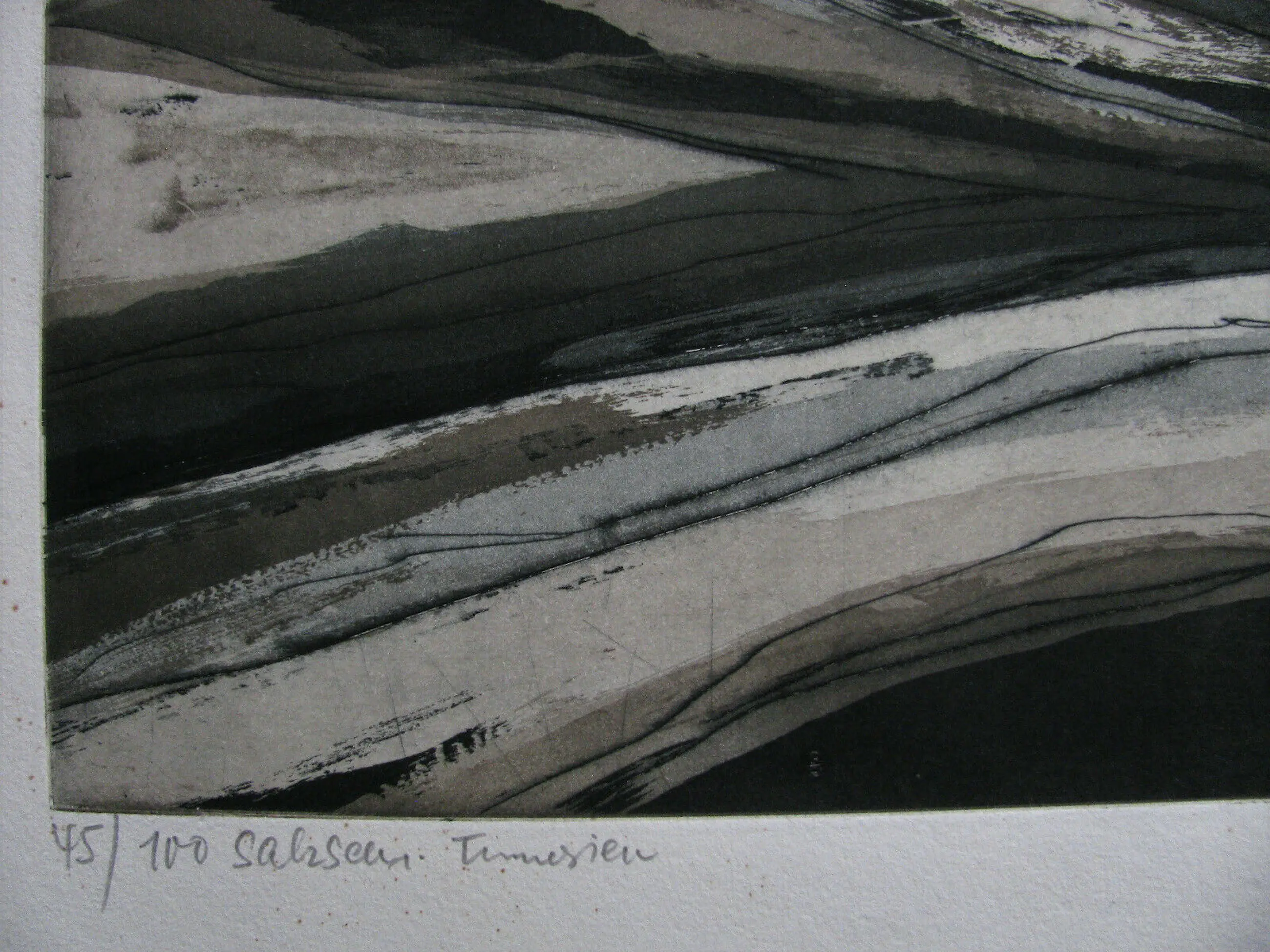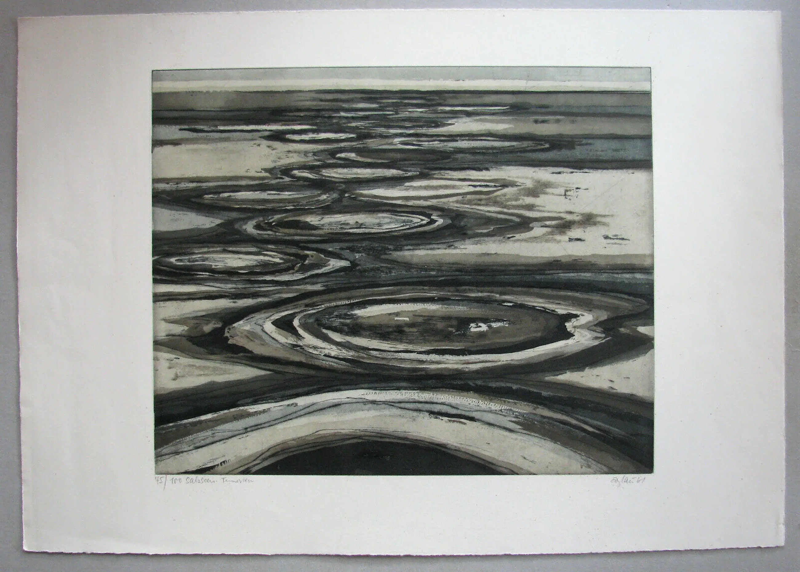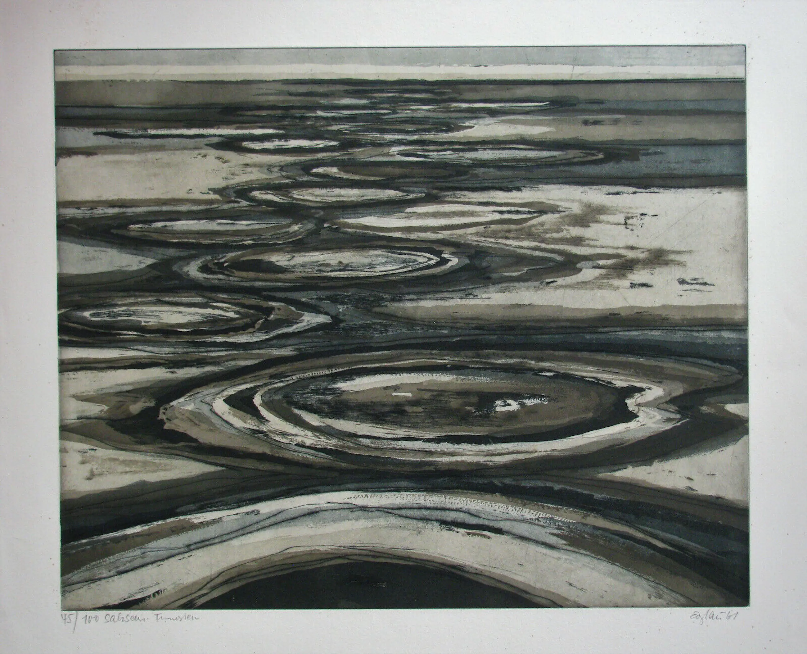 Kleurenets, 40 x 49 cm ( 54 x 76 cm de batt ) op vergépapier met de volle schep. Gesigneerd in potlood, gedateerd 1961 en getiteld "Zoutmeren in Tunesië". editie, 45/100.