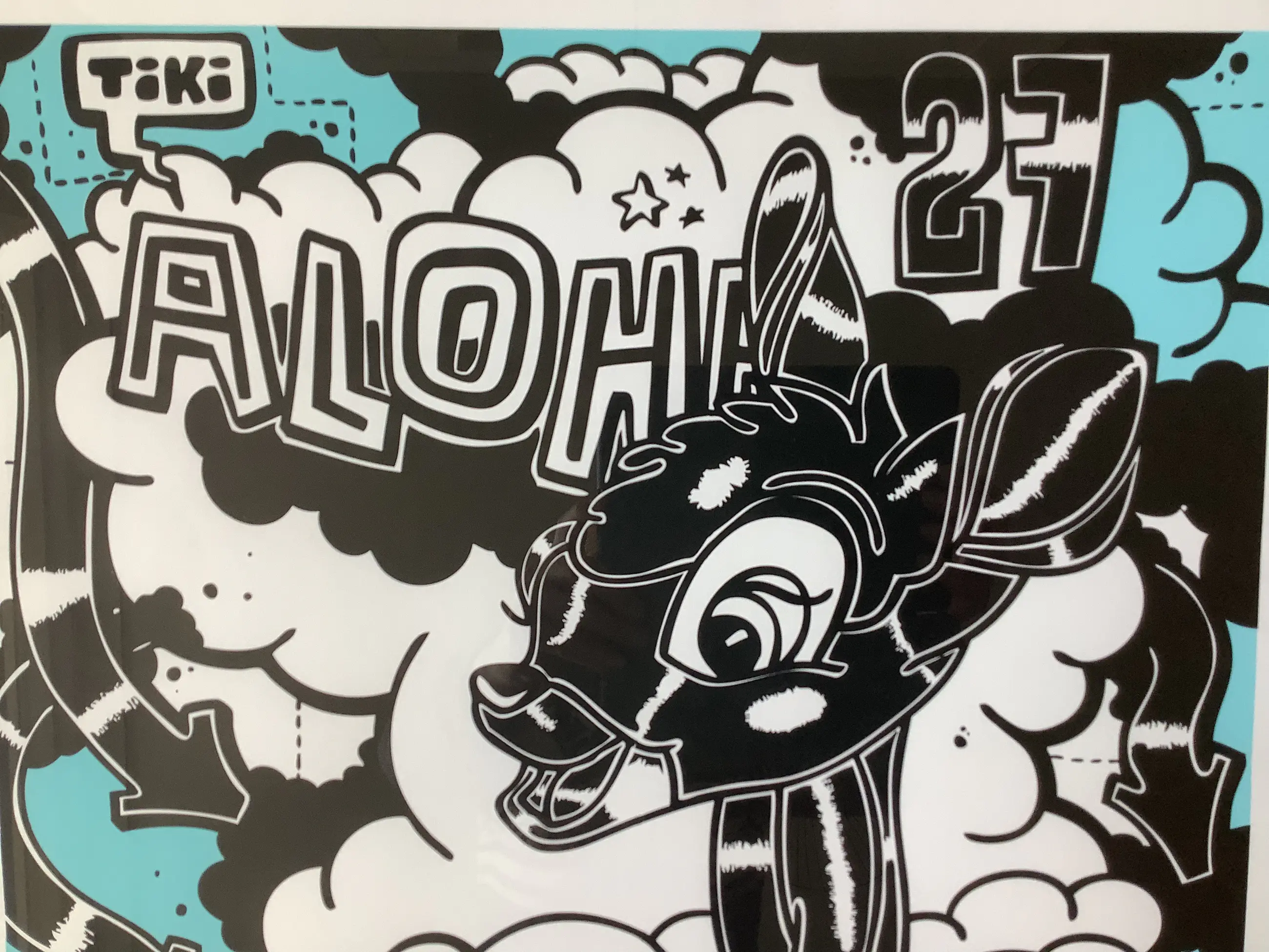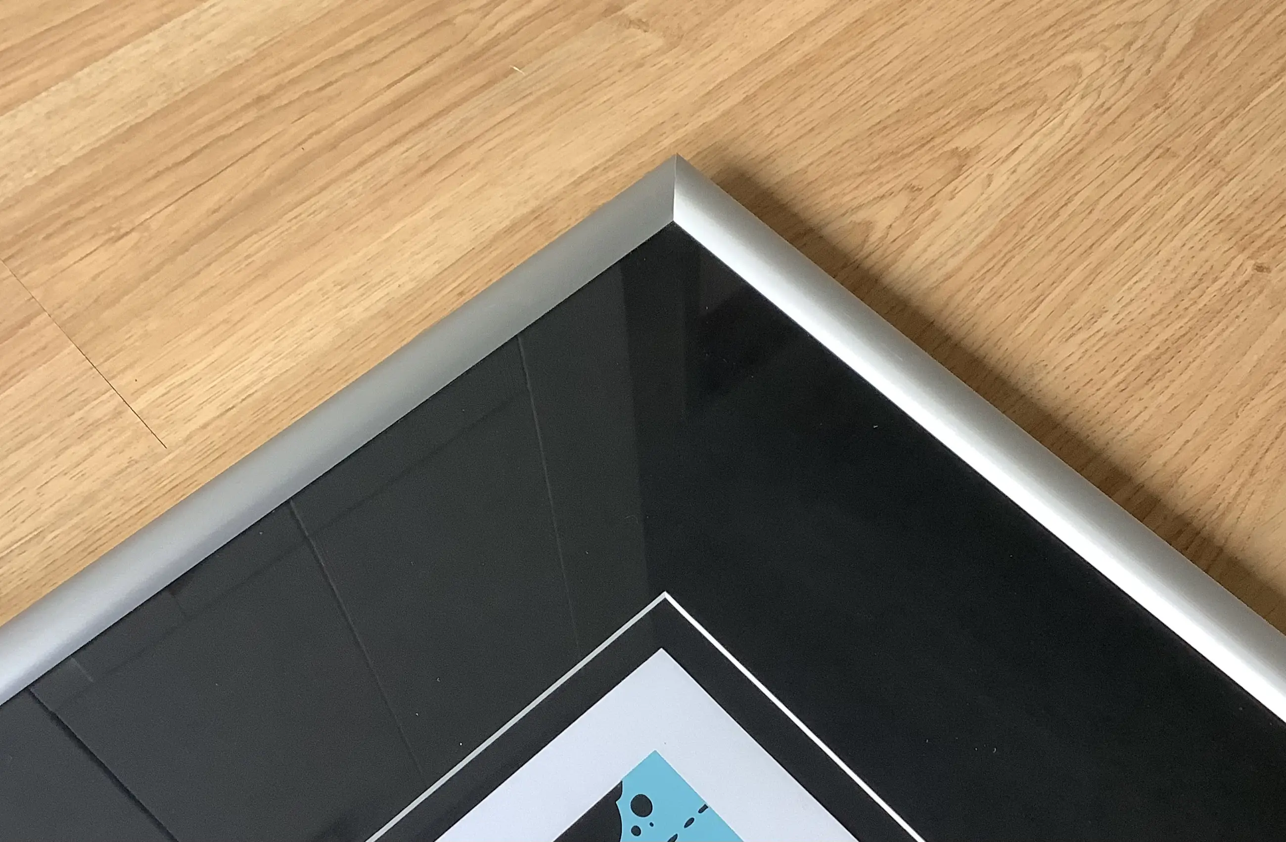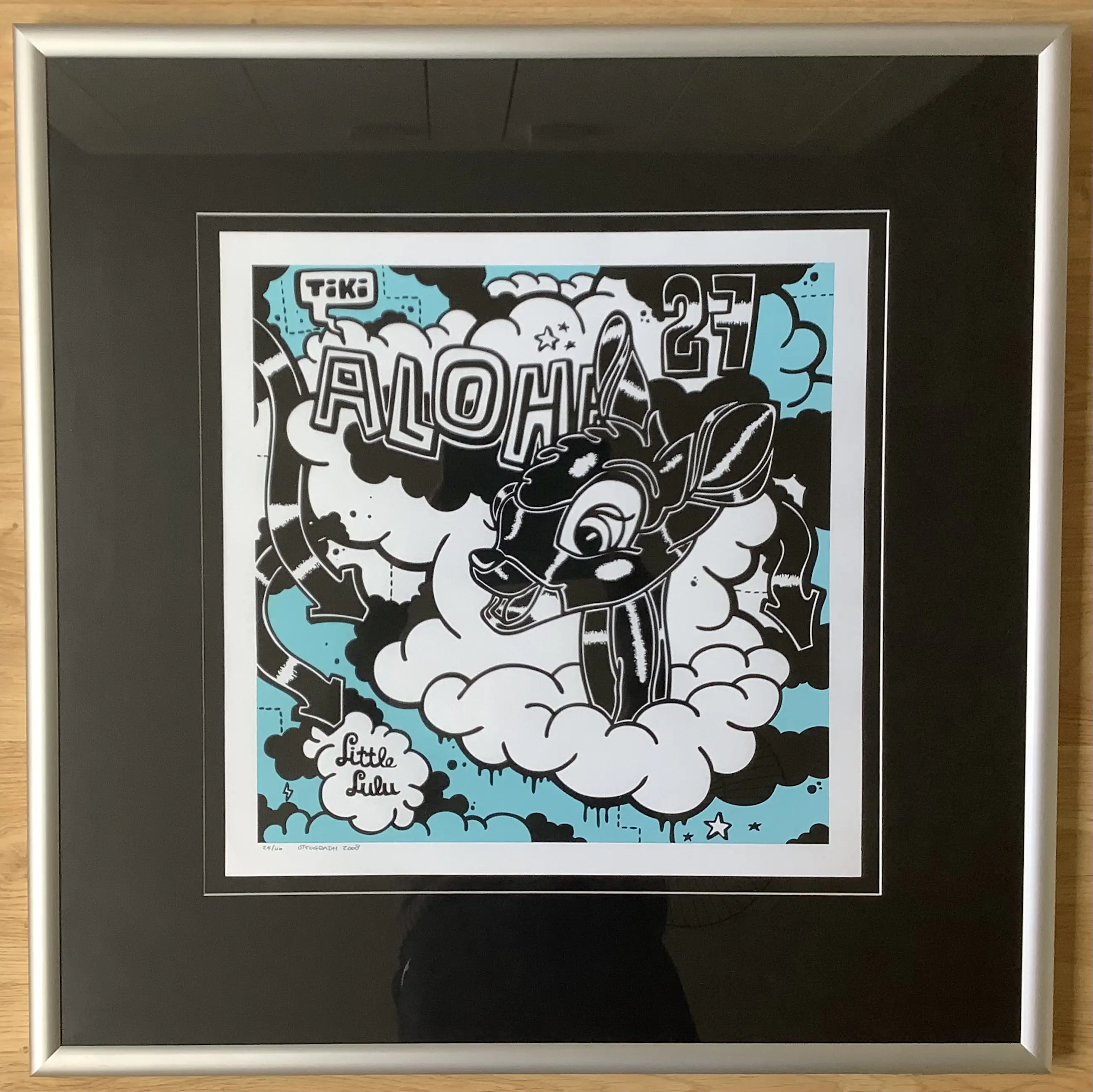 Het werk is netjes ingelijst in een brede aluminium lijst. Hoogte lijst: 3,5 cm, breed 3,0 cm. Gezien het gewicht van de lijst +/- 7 kg is het wenselijk dat het werk wordt opgehaald door de koper of door een koerier (KK). Kan zo aan de muur.