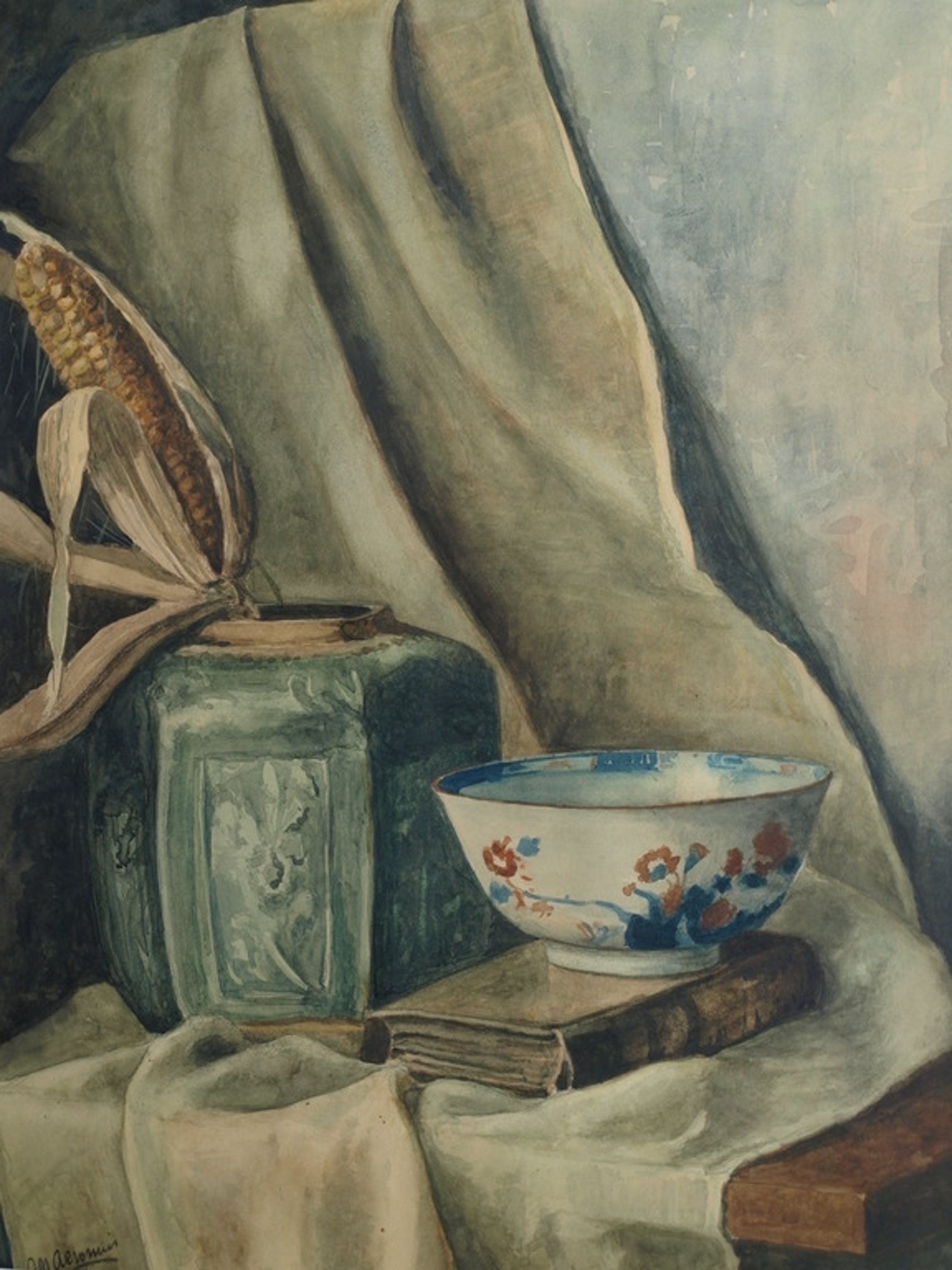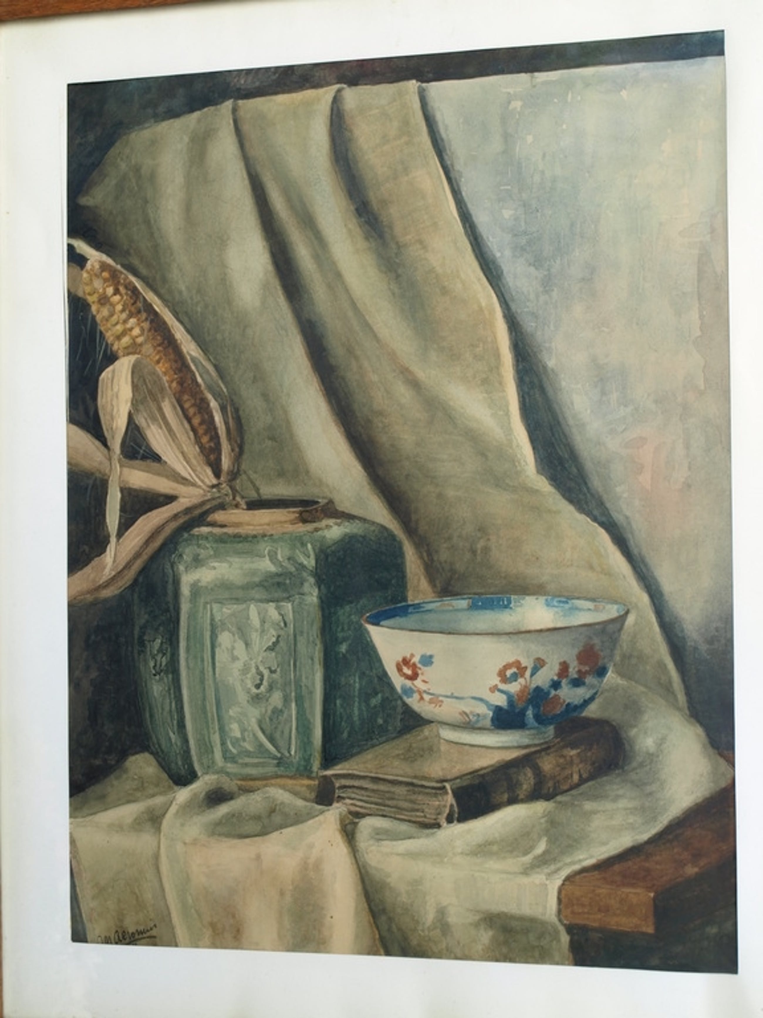 Een zeer knap geschilderde aquarel van een stilleven met een maiskolf,vaas, boek en kom.