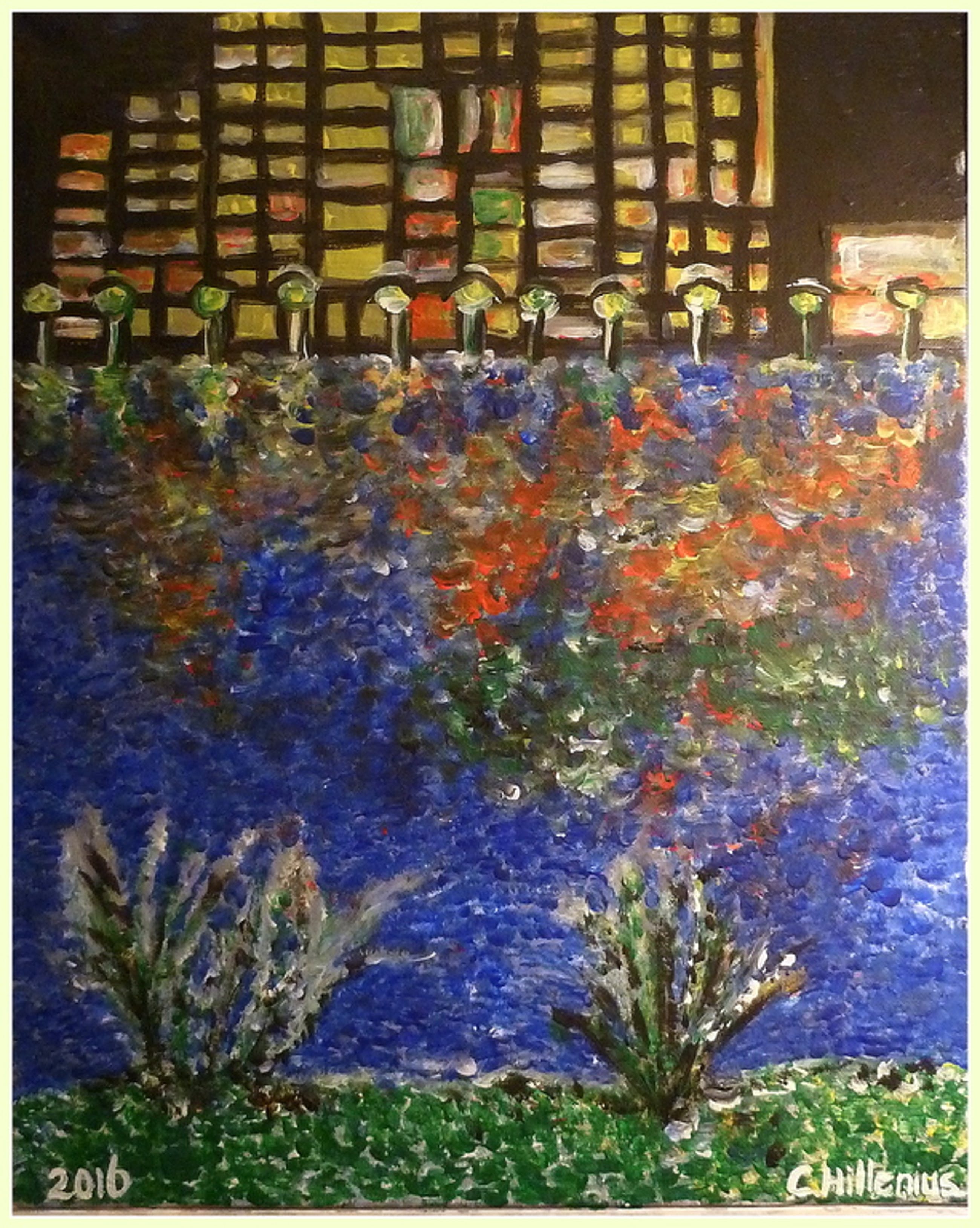 Kantoorgebouwen aan de rand van het water waar mensen laat nog werken.