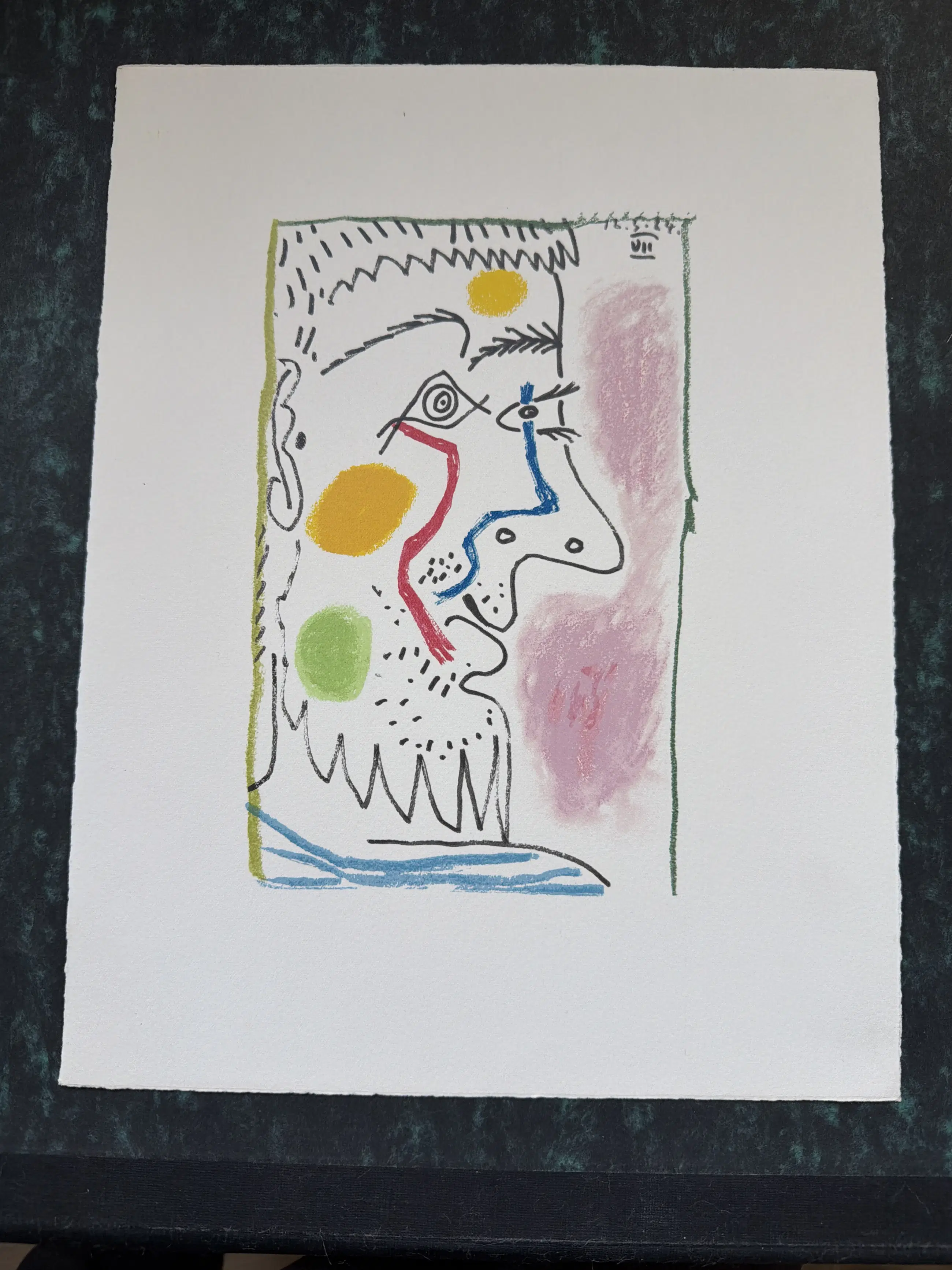 Dit is naar een lithografie werk van Pablo Picasso, getiteld "Bearded Self-Portrait", daterend uit 1964. Het maakt deel uit van de portfolio 'Le Goût de Bonheur' (De smaak van geluk). Het originele werk is gedateerd in de plaat 1964. De litho's werden in 1970 uitgegeven in een totale oplage van 1998 exemplaren. De afmetingen van de lithografie op perkament zijn doorgaans 32,5 x 25 cm.