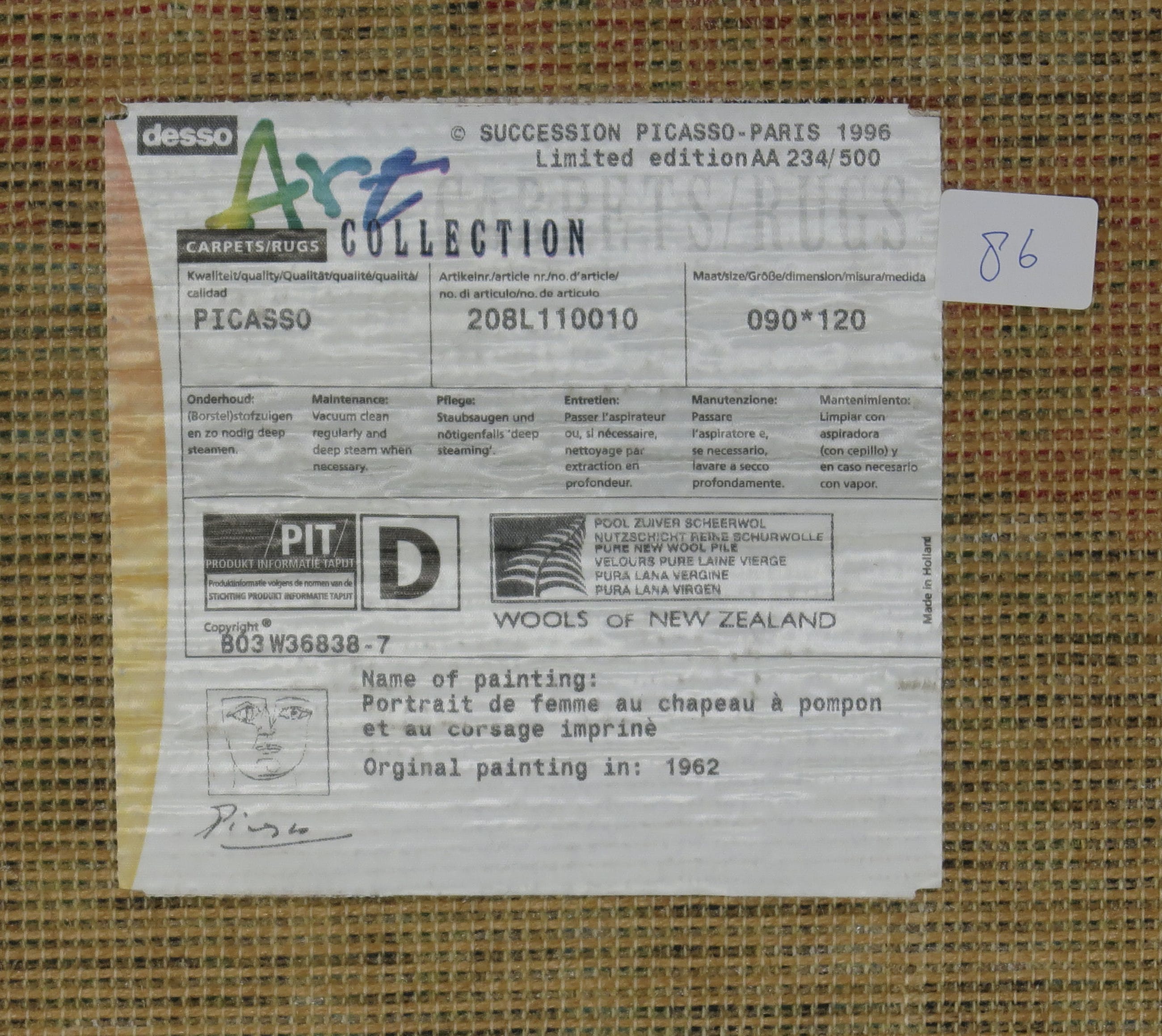Scheerwollen tapijt naar het schilderij Portrait de femme au chapeau a pompom et au corsage imprine van Picasso uit 1962. Uitgegeven door Desso Art Collection in 1996, oplagenummer 234/500.