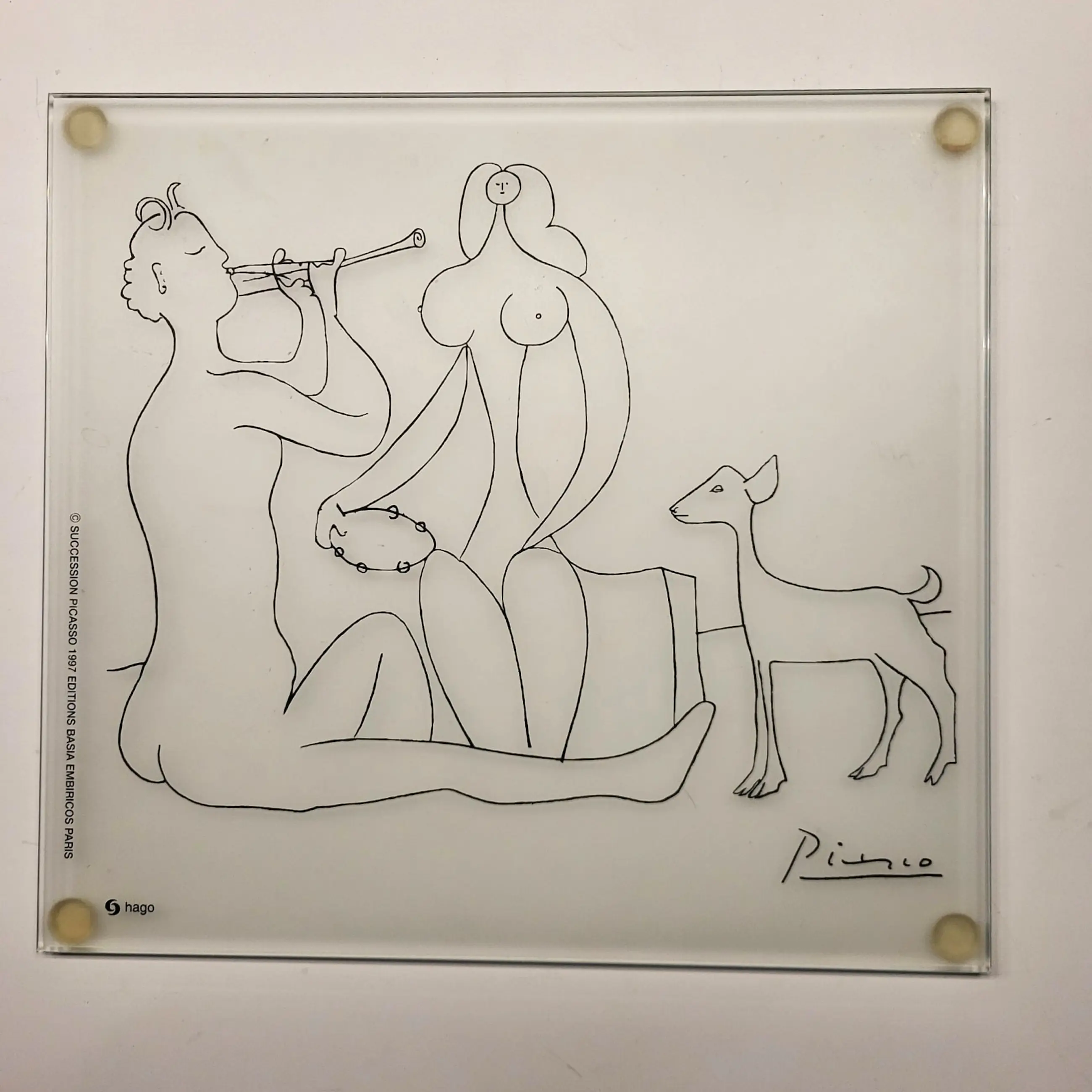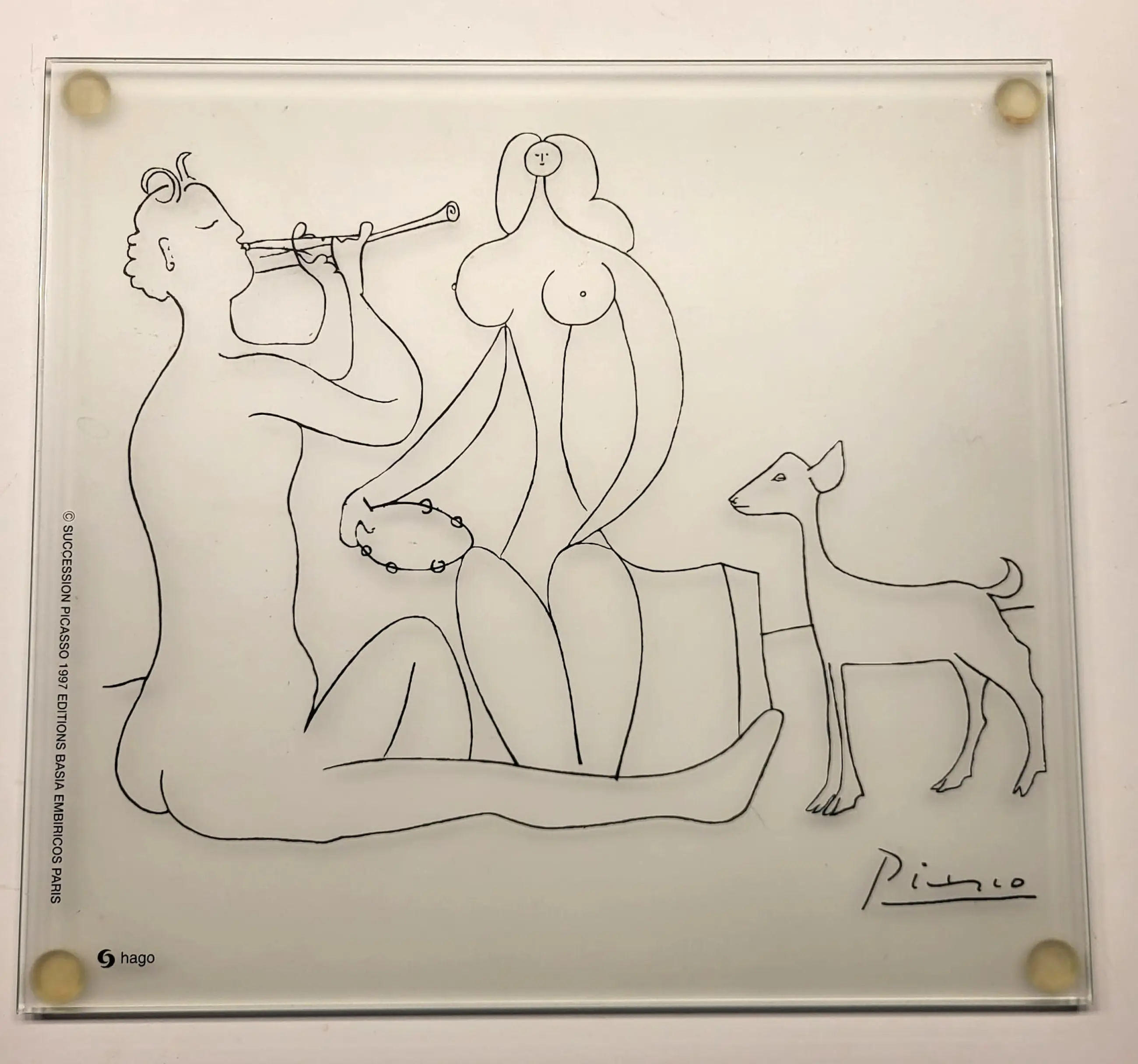 Glazen plaquette met een afbeelding Le Dessins d'Antibes naar tekeningen van Pablo Picasso, gemaakt tijdens zijn verblijf in Antibes in 1946.