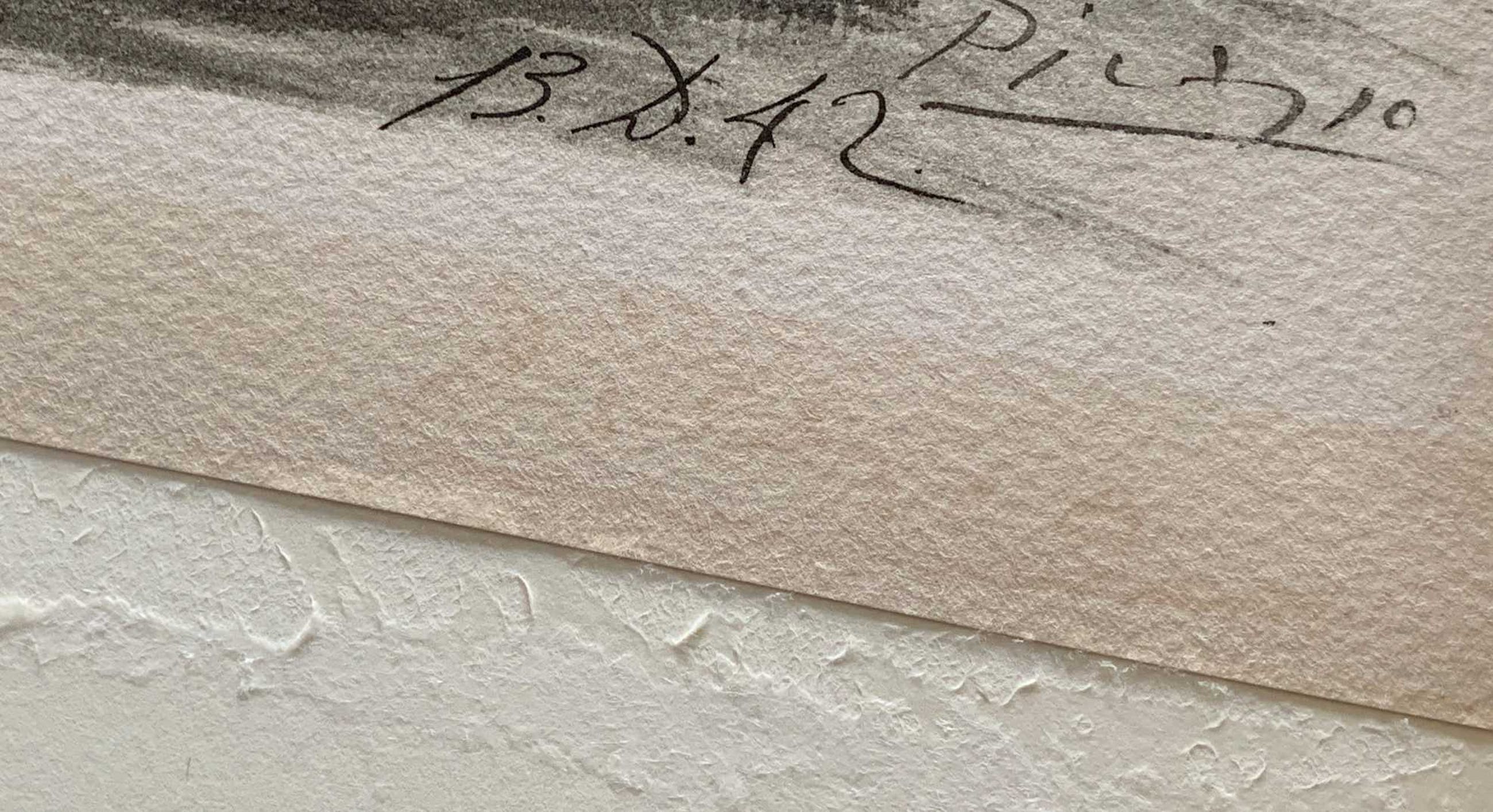 Het werk is altijd achter glas geconserveerd geweest, eind jaren '50 in een Hamburgse kunstgalerie gekocht. Jaartal, signatuur,droogstempel etc. kloppen en zijn in de familie bekend, maar voor echtheid van de handtekening kan ik niet in staan.