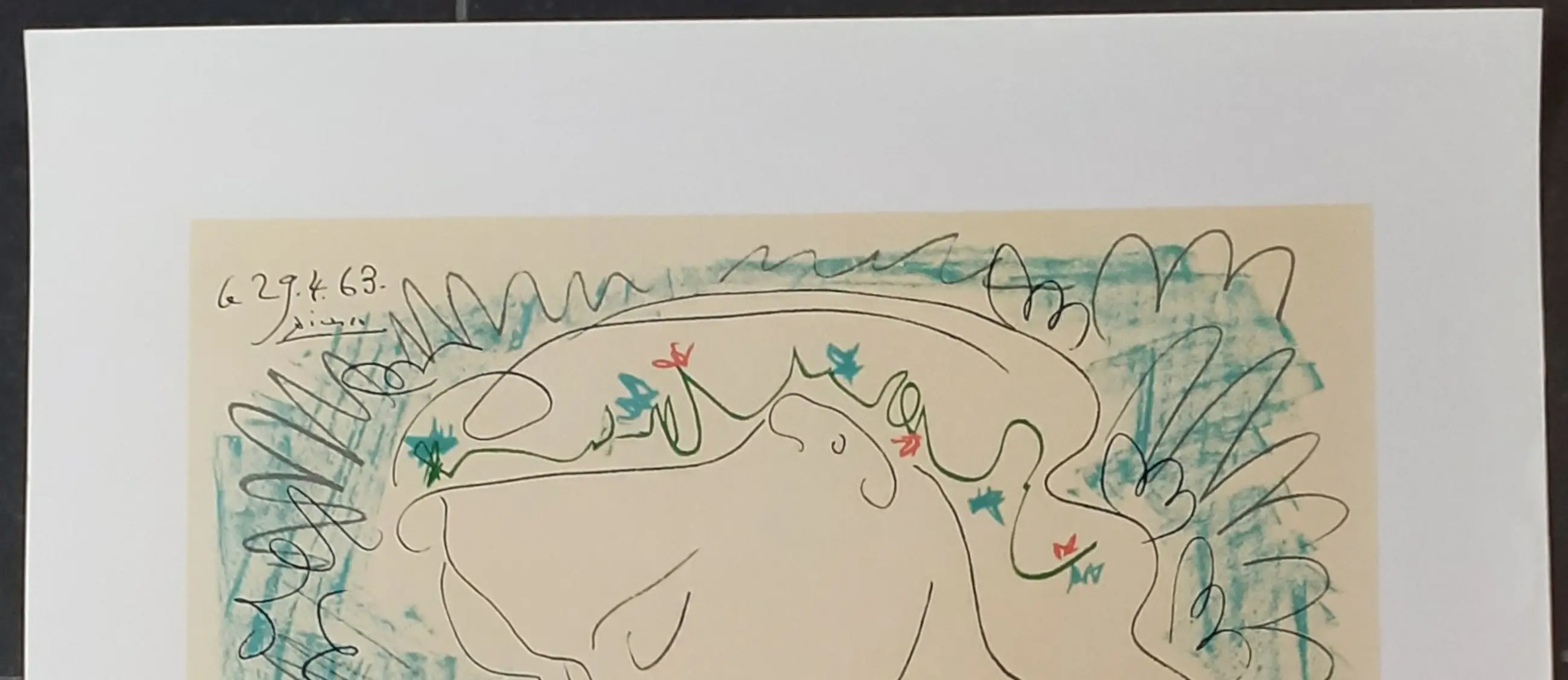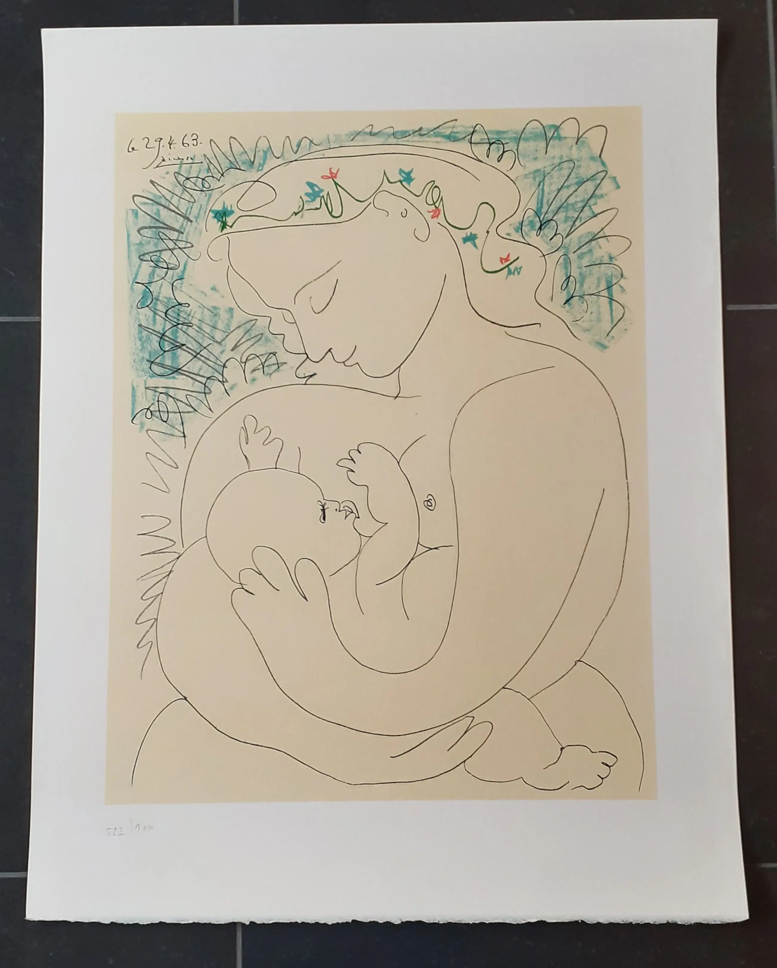 'Maternité ' litho uit 2002 op Arches papier 250 grms, handgeschept. Naar een tekening van 29.04.1961. Bloch, picasso 1904 -1967, catalogus 1968. Uitgegeven: s.p.a.d.e.m., Parijs, 1983. Published by " mouvement de la paix " succession picasso copyright. Gesigneerd in de plaat