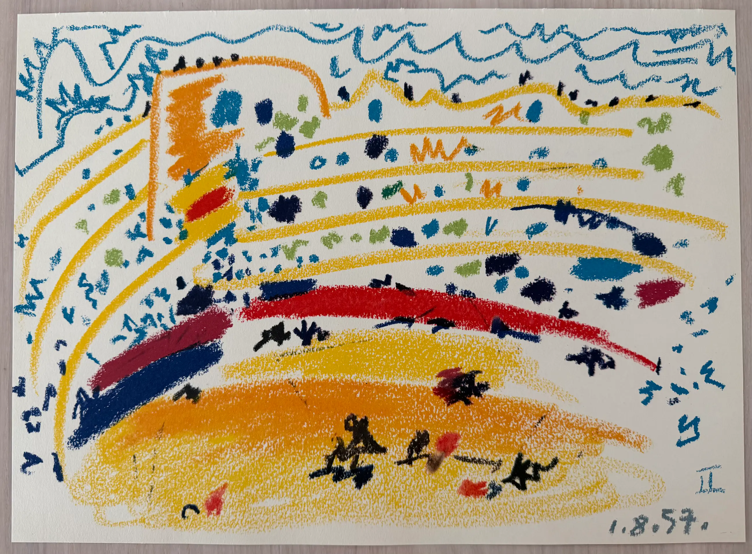 Uit de Duitse eerste editie 1961, Editions Cercle d'Art, Parijs Werk nr. 184 L Pablo Picasso. "Stierenarena" Lithografie uit de serie "Toros y Toreros". Gedateerd: 1.8.57