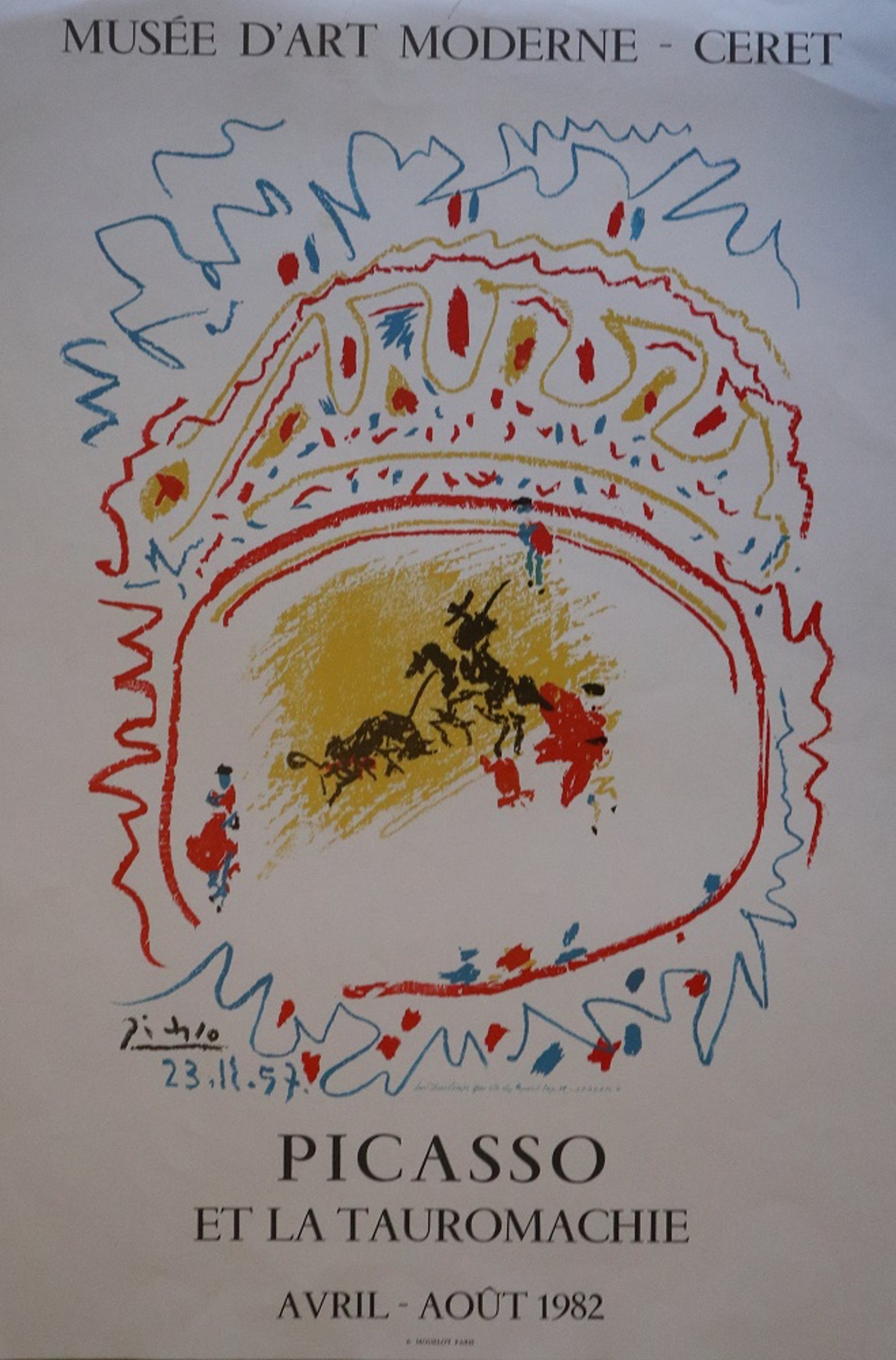 Fraaie lithografische museum affiche in 1982 gedrukt door meesterdrukker Henry Duchamps bij Mourlot in Parijs. De afbeelding maakte Picasso in 1957. Gemaakt voor een expositie in Museum Ceret.