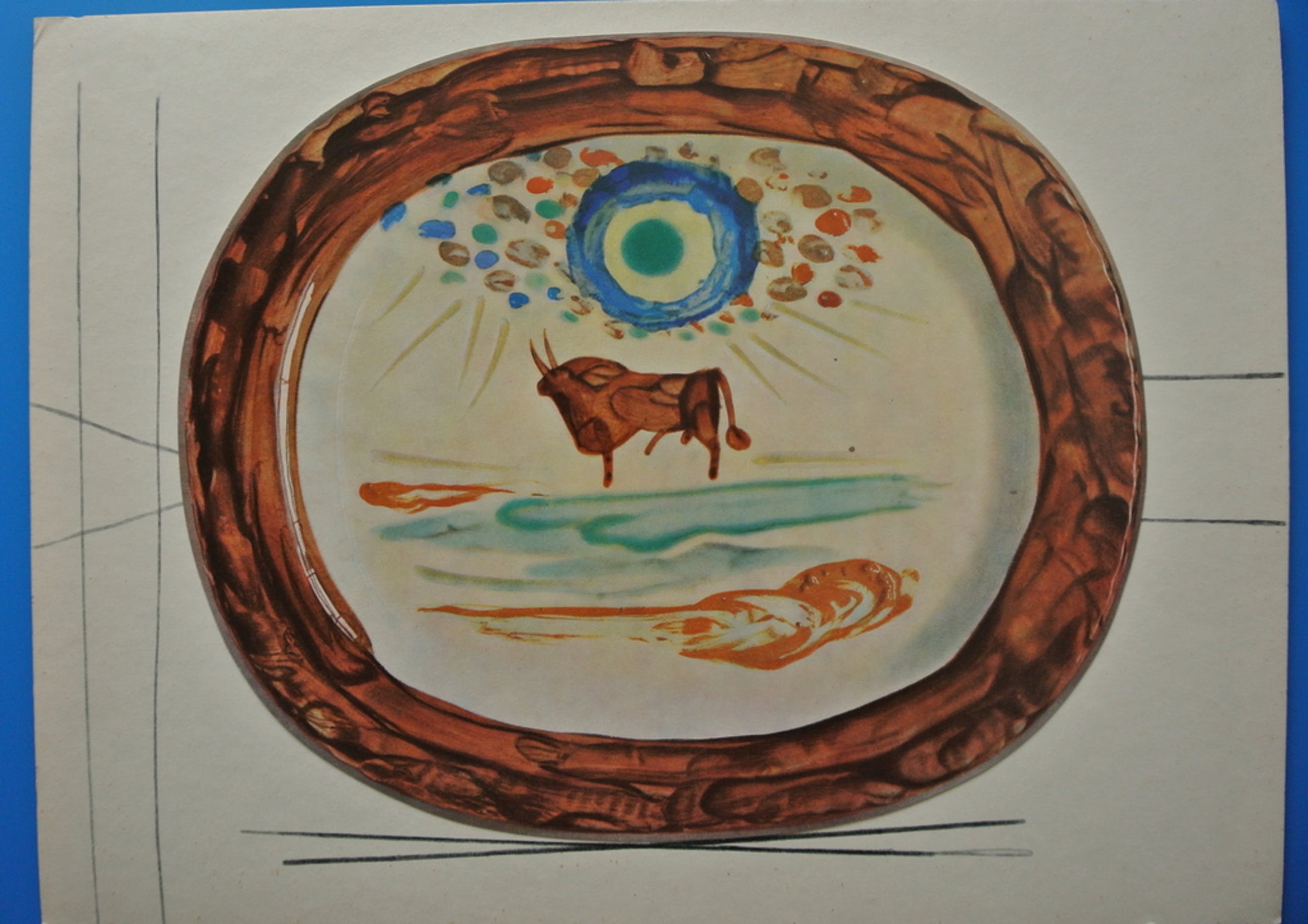 De apart gedrukte fraaie fotografische afbeeldingen van ceramiek van Picasso zijn met de hand uitgesneden en daarna op een, met voorgedrukte lijnen, dik vel papier/karton geplakt.