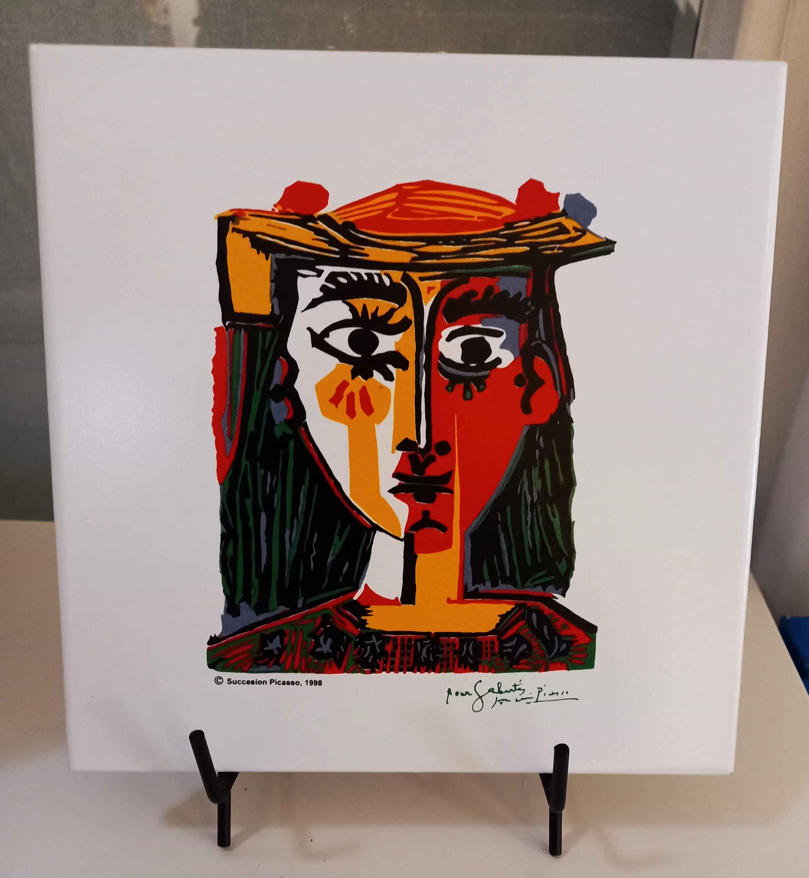 Een relatief zeldzame keramische tegel van 20 cm (werkelijke grootte 20 cm) met een ontwerp van Pablo Picasso. Gemaakt naar Picasso's linosnede op papier uit 1962, getiteld "Buste de Femme au Chapeau". Copyright Succession Picasso, 1997. Gemerkt op de achterkant: "GRES SANCHISALCORA - SPANJE".