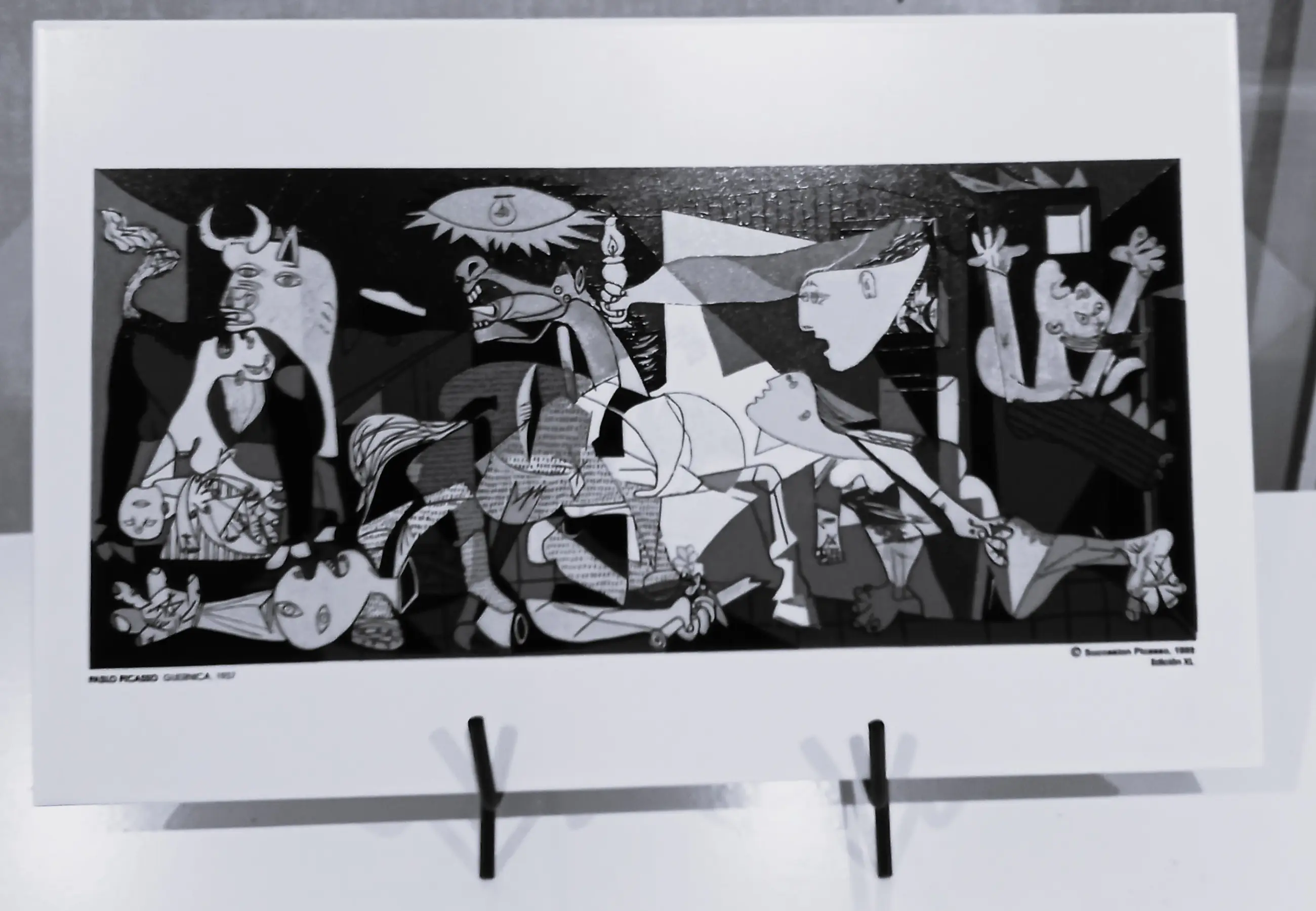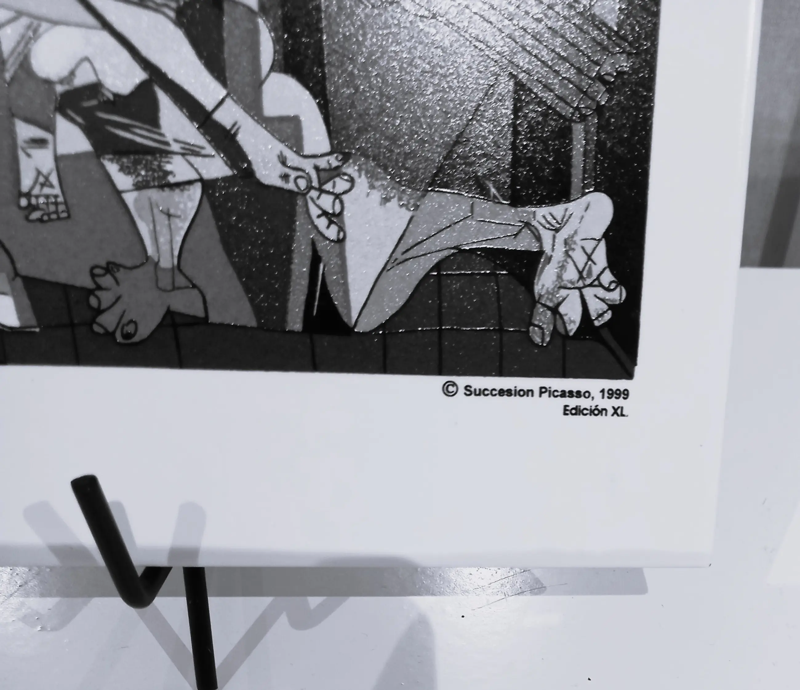 Een zeldzame keramische tegel met een ontwerp van Pablo Picasso. Gemaakt naar Picasso's beroemde werk 'Guernica' uit 1937. Copyright Succession Picasso, 1999. In druk gesigneerd.