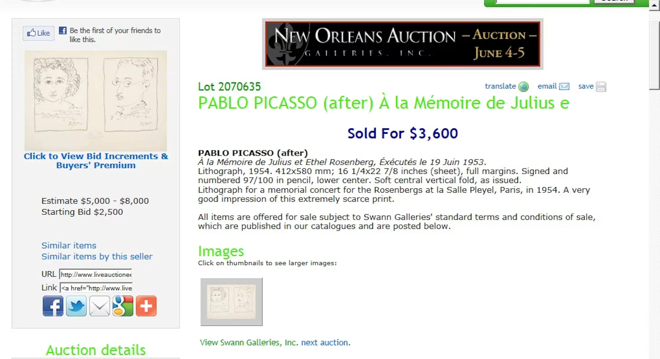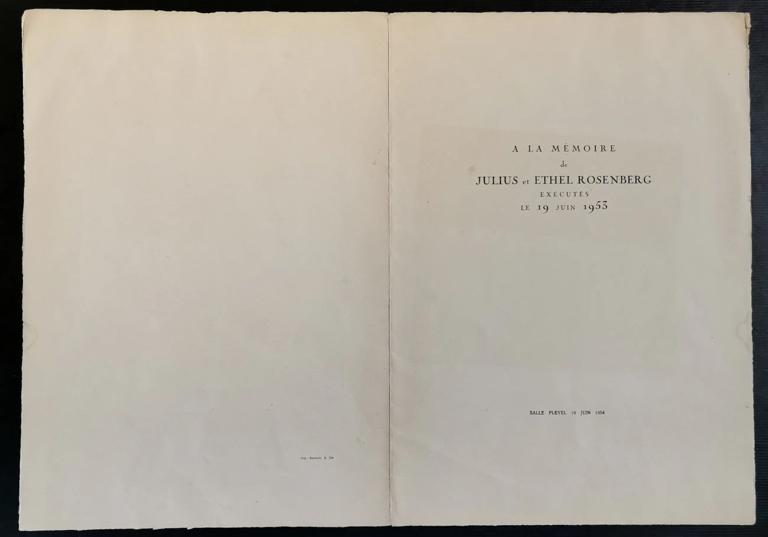 Aangeboden uit mijn privécollectie is een genummerde (49/100) en handgesigneerde lithografie (A la mémoire de Julius et Ethel Rosenberg) van Pablo Picasso. De lithografie is typografisch getiteld op de voorzijde van het dubbele vel en voorzien van het opschrift "Salle Pleyel 19 Juis 1954". Gedrukt op suèdekleurig geweven papier met een gedeeltelijk uitgesneden watermerk. Dubbel vel met middenvouw, elk vel circa 29 x 21,5 cm, dubbel vel circa 40,5 x 57,5 cm.