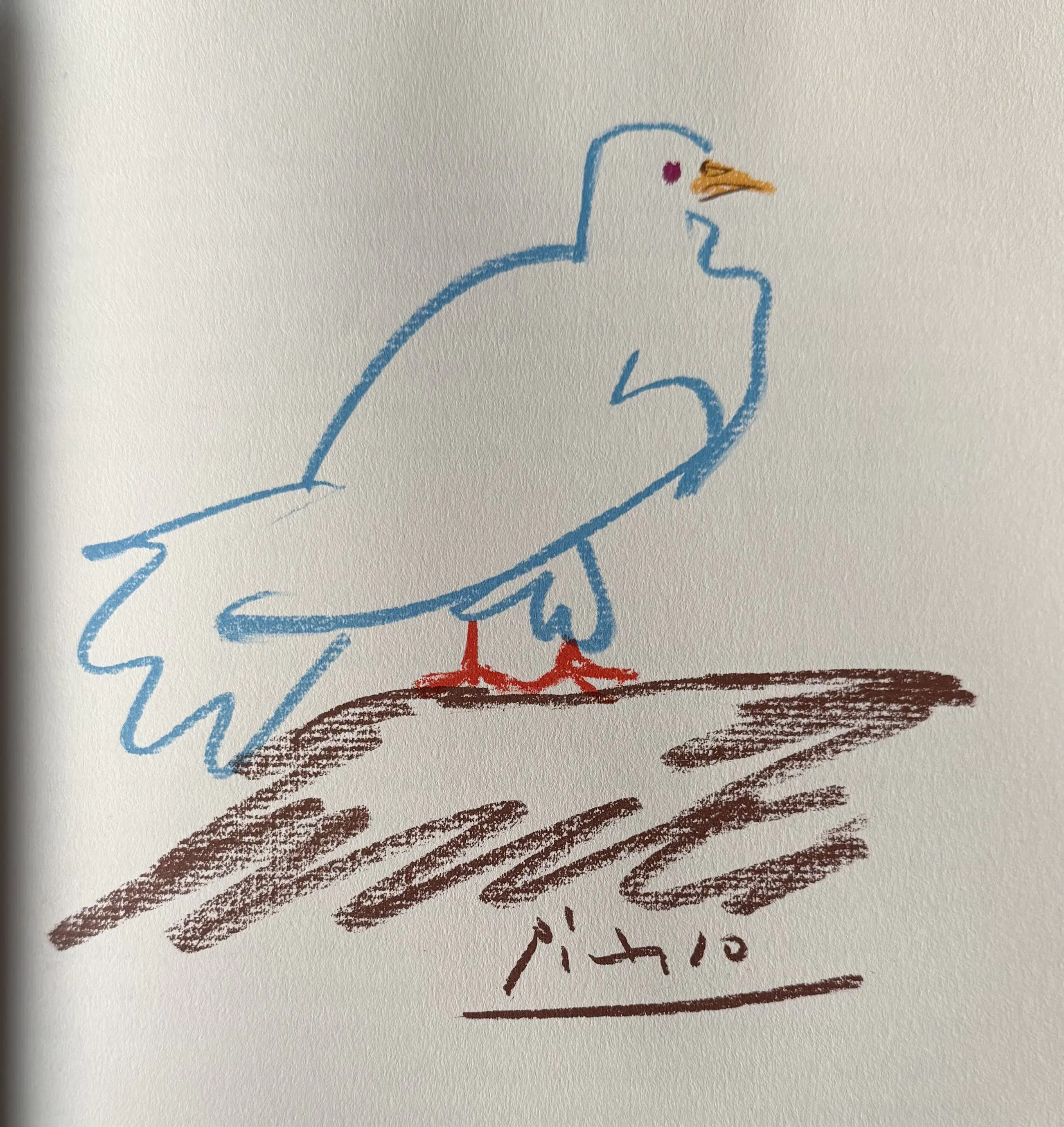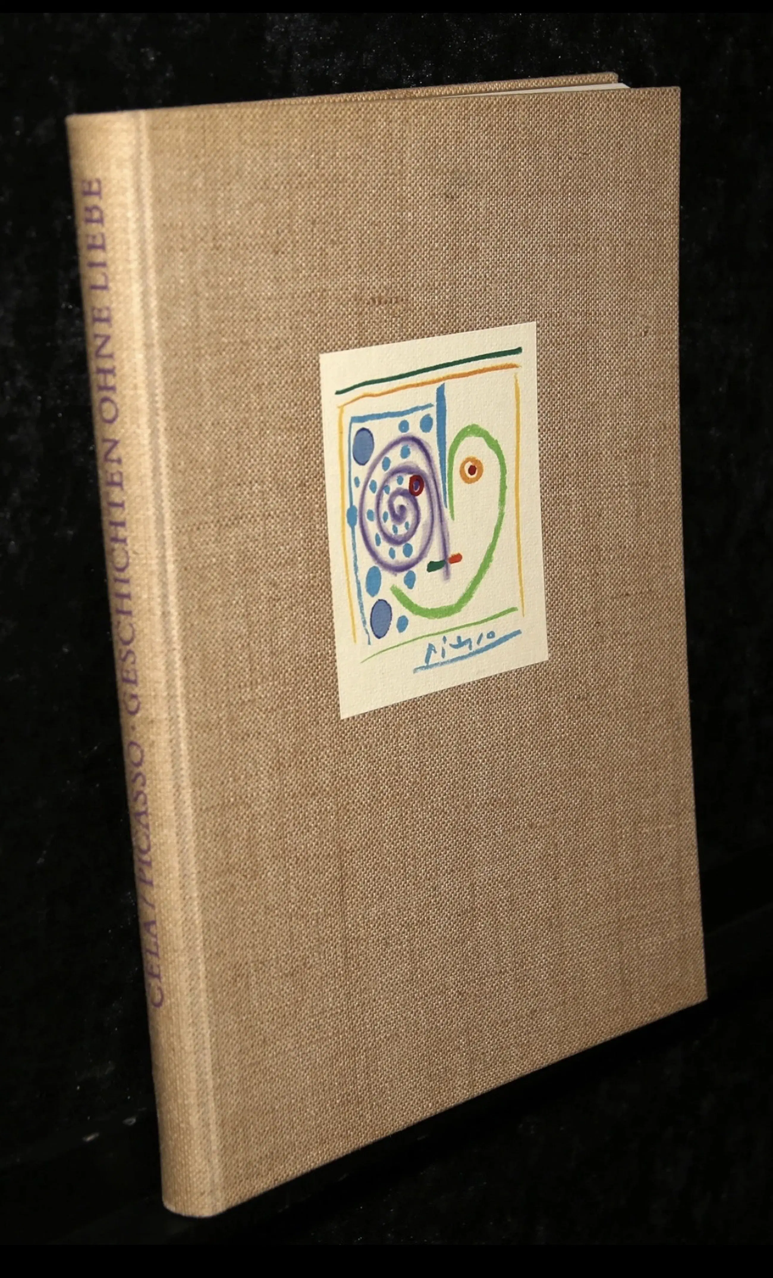 Boektitel: "Verhalen zonder liefde". Het boek uit 1968 bevat 32 kleurentekeningen van Picasso, oorspronkelijk gemaakt met pastelkrijt.