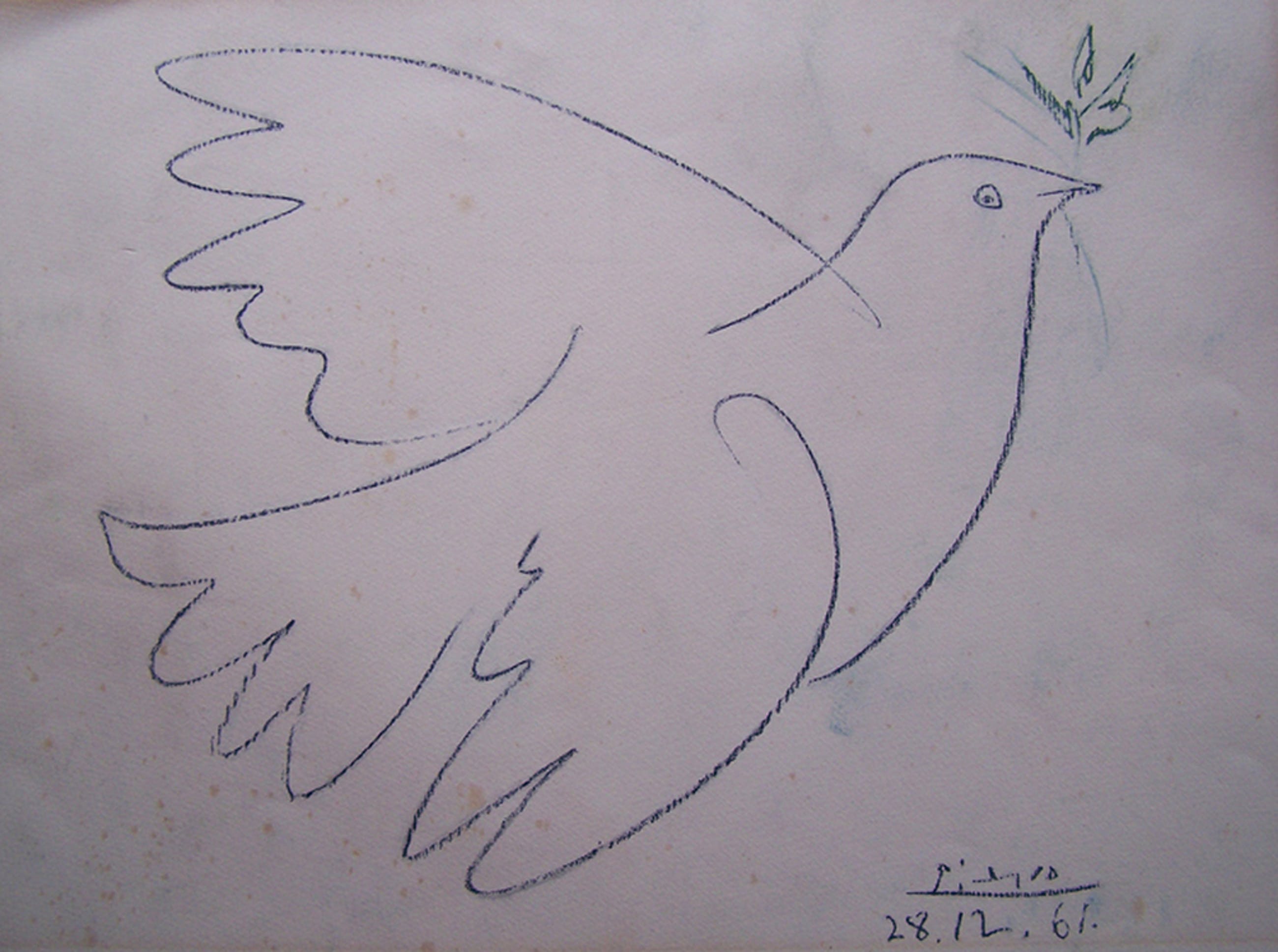 Litho, blauwe vredesduif met groen takje, gesigneerd in de steen. Gedrukt voor/door de Franse vredesbeweging. D.m.v. een blindstempel gedrukt in zwaar Arches-papier: Edition Combat pour la paix - S.P.A.D.E.M. Paris. Zie foto In de steen gedateerd: 28- 12 - '62