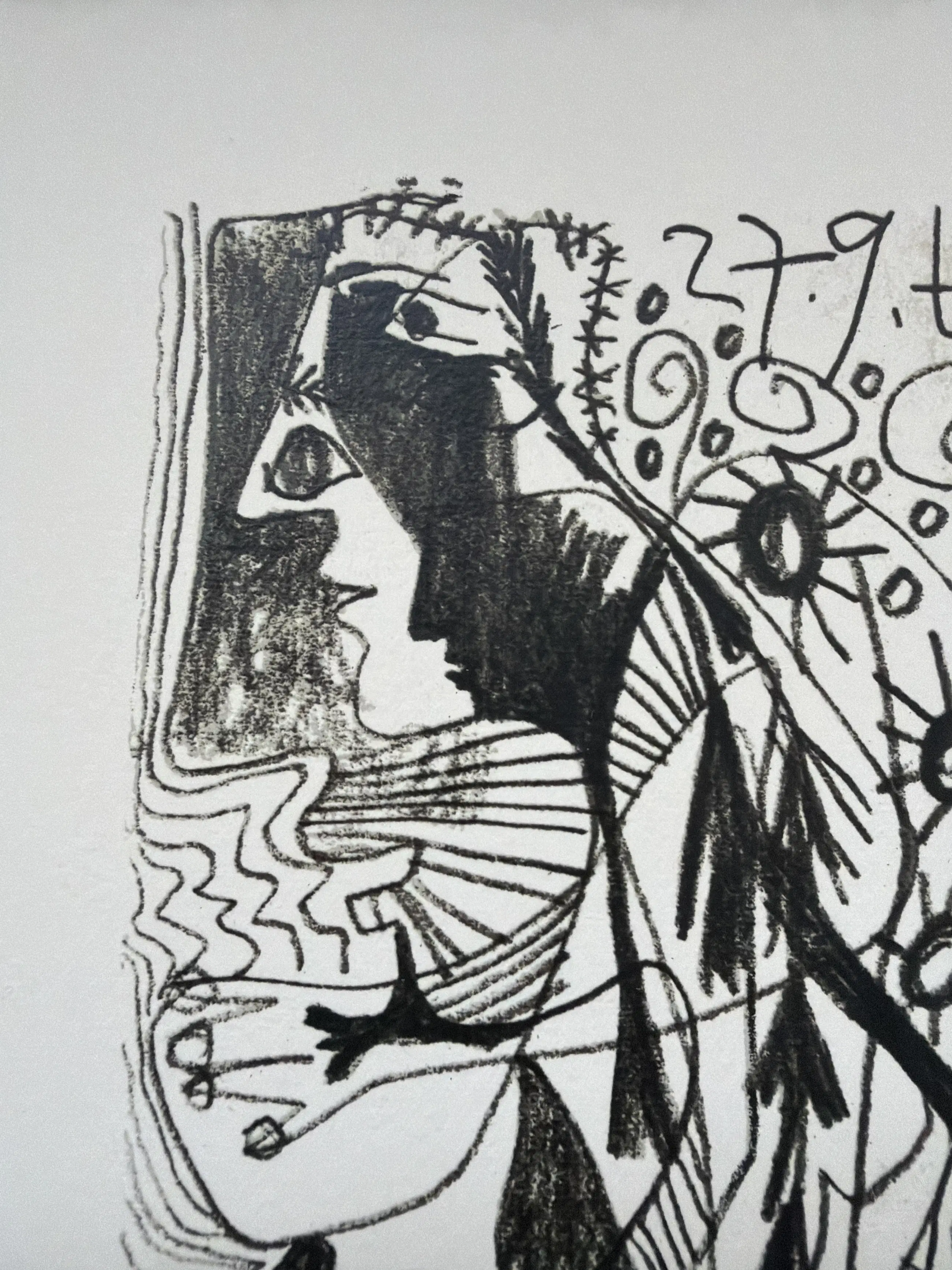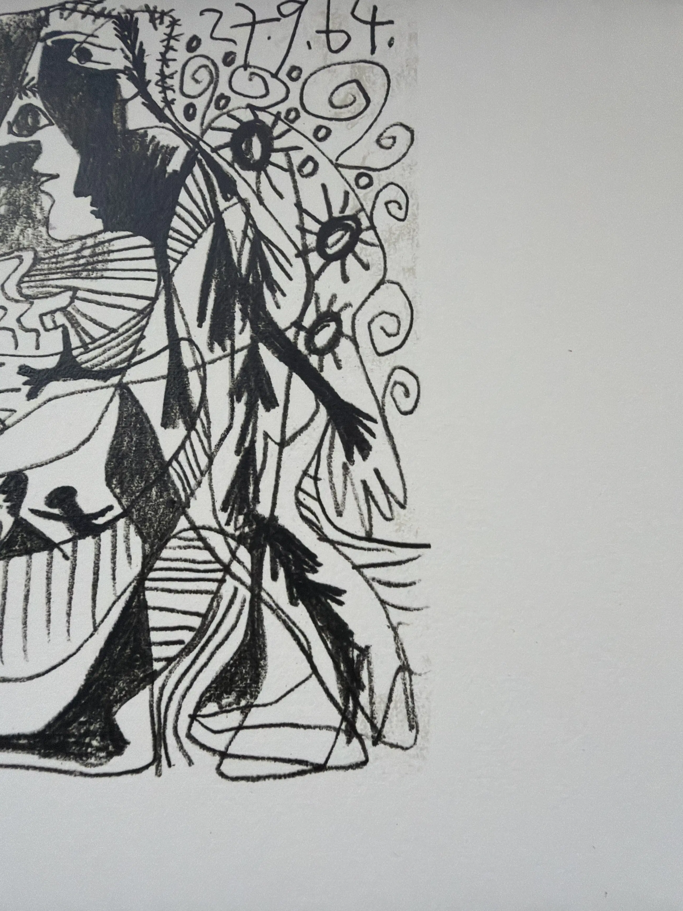 De afbeelding is een lithografische prent, gemaakt onder toezicht van Picasso zelf in 1970, gebaseerd op zijn originele tekening uit 1964.