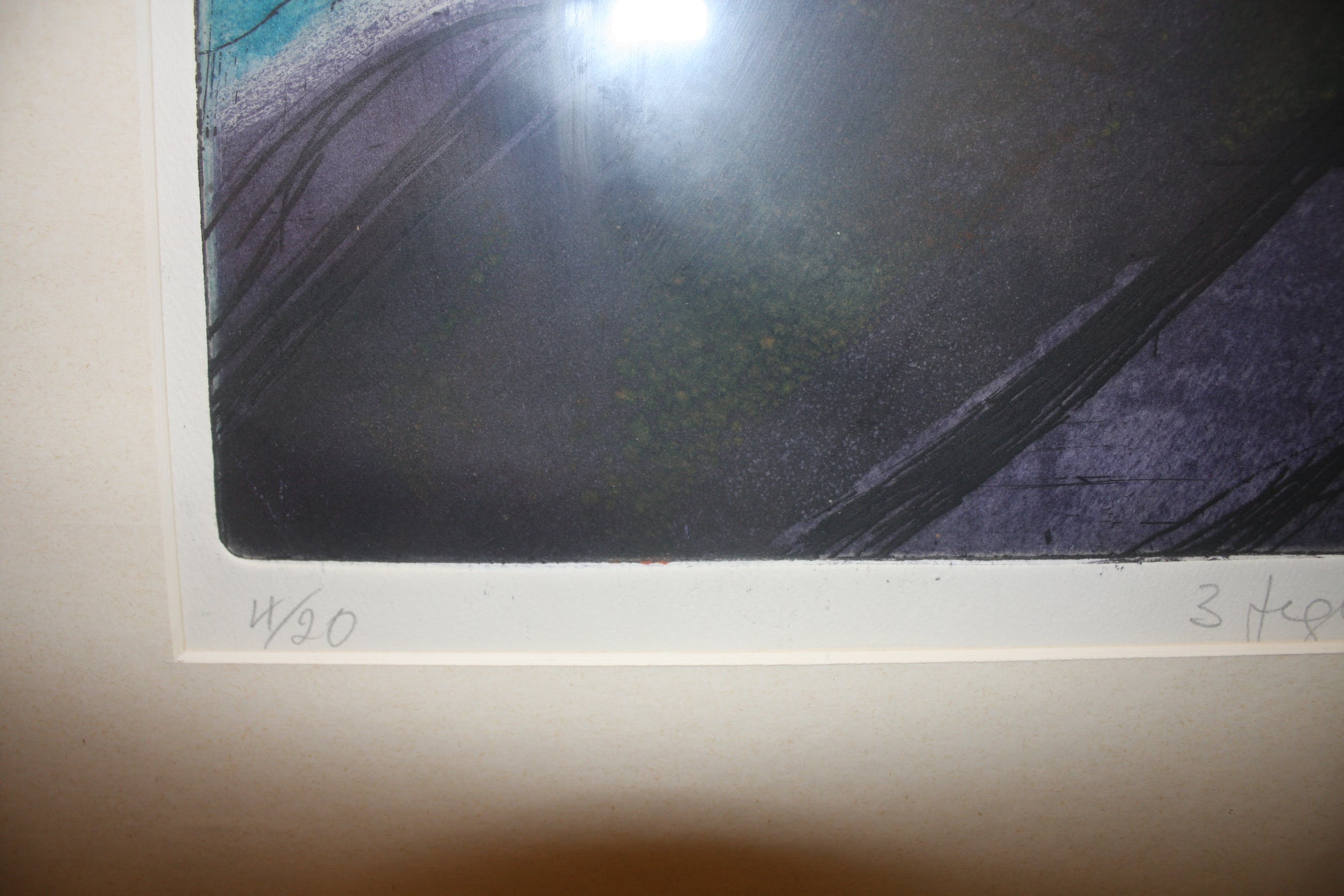Een ingelijste ets van Paddy Summerfield, nummer 4 in een oplage van 20.
