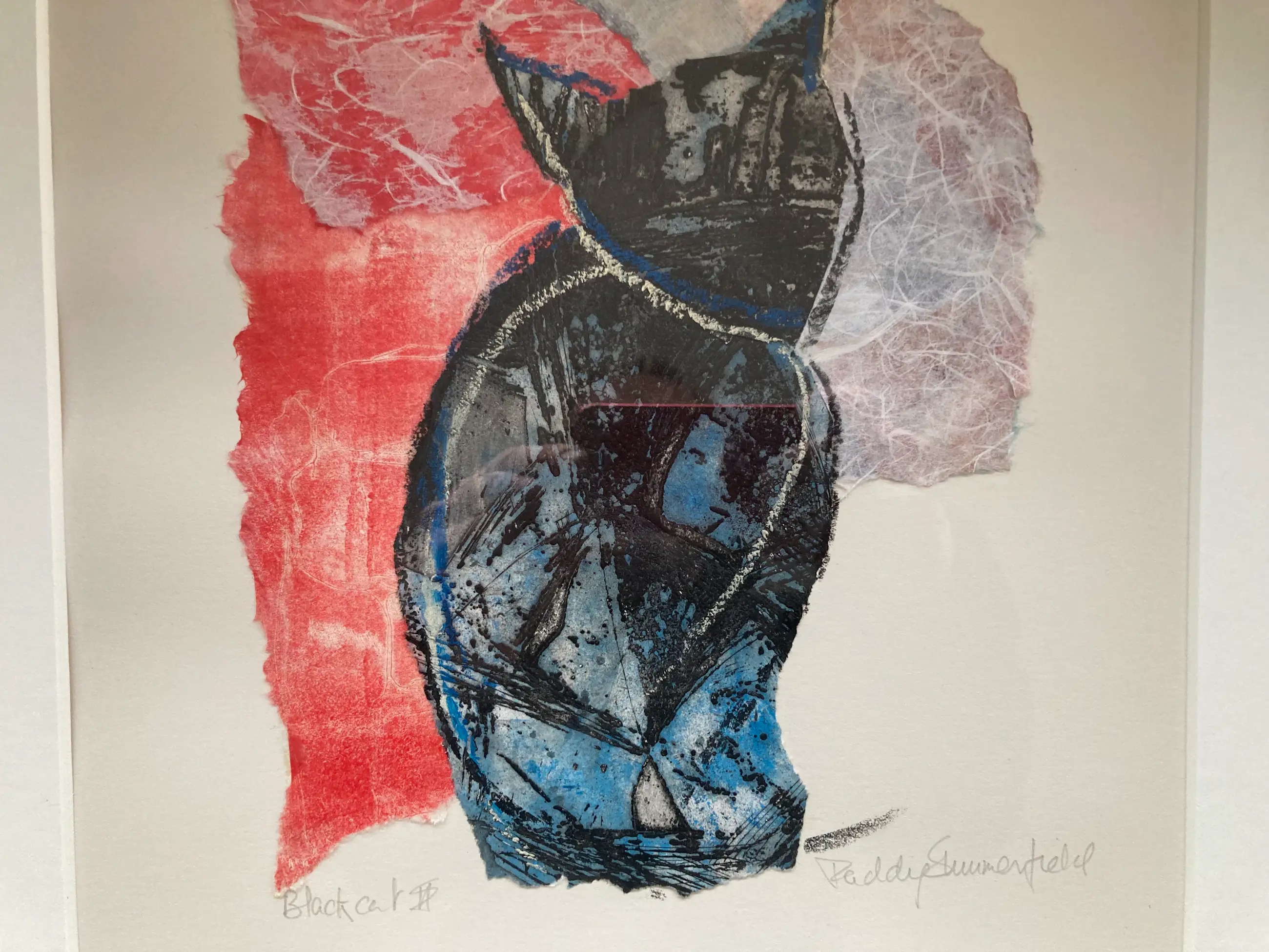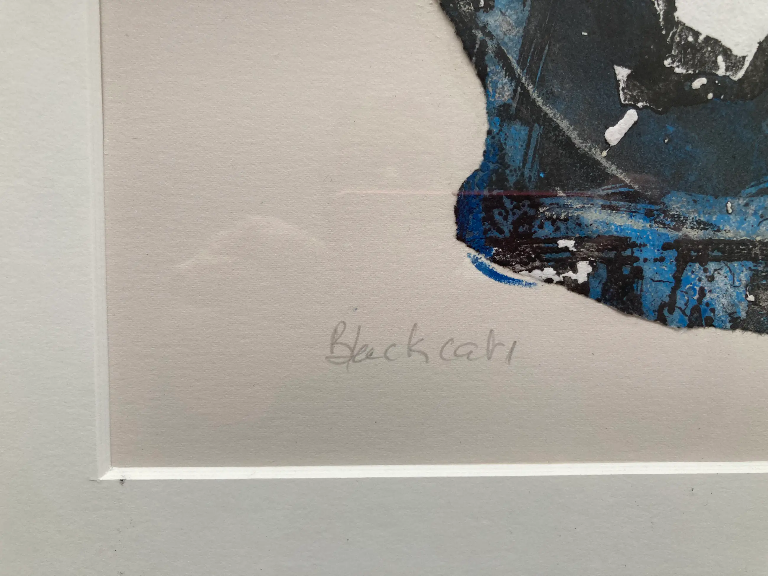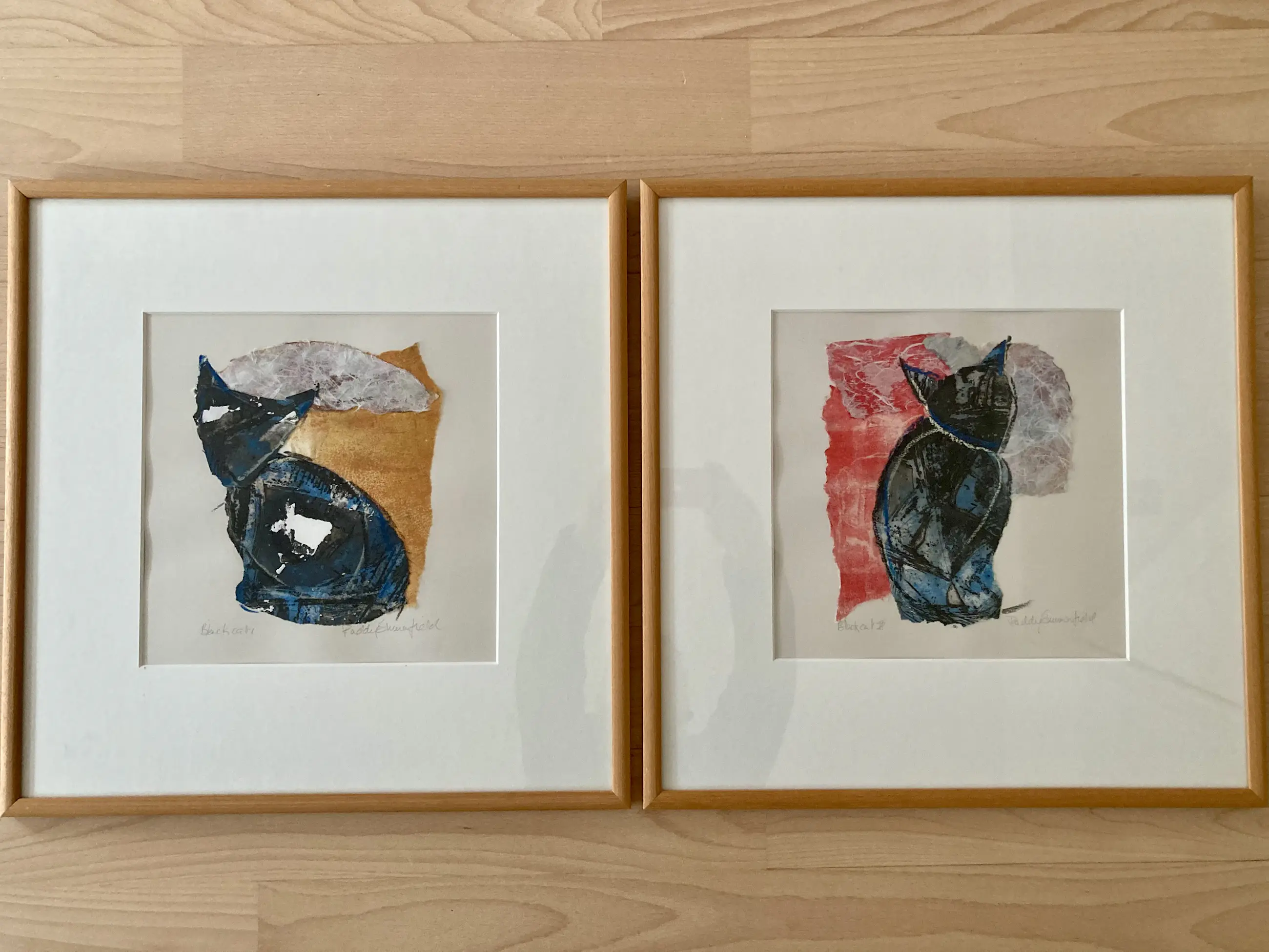 2 Bij elkaar horende lieve collages van papier/acryl geschilderd/ en op karton van fotograaf Paddy Summerfield: https://paddysummerfield.com/ Afbeeldingen van twee zwarte katten. Mooi ingelijst met passe partout in blank hout. Voor de poezen liefhebbers een buitenkans.