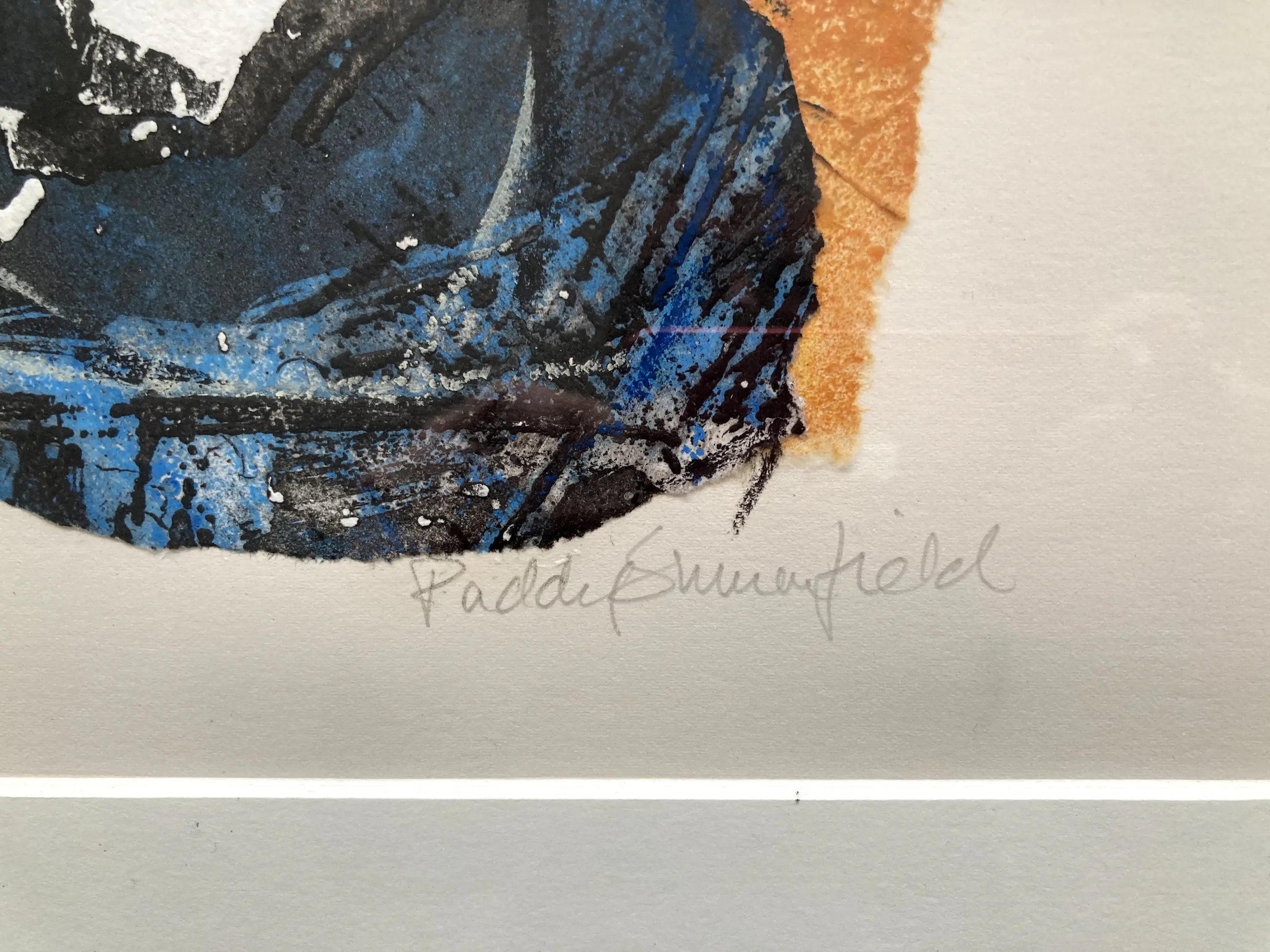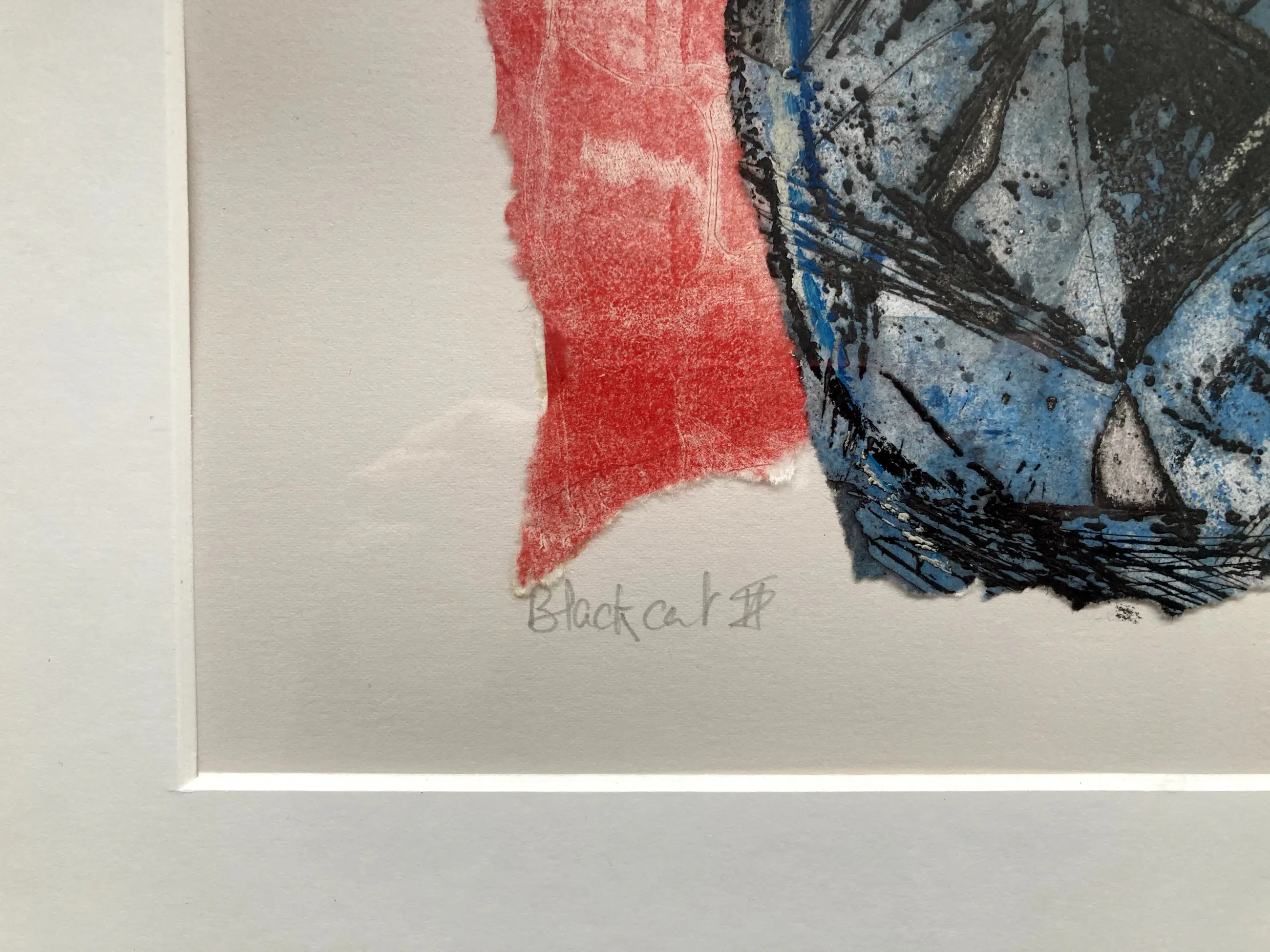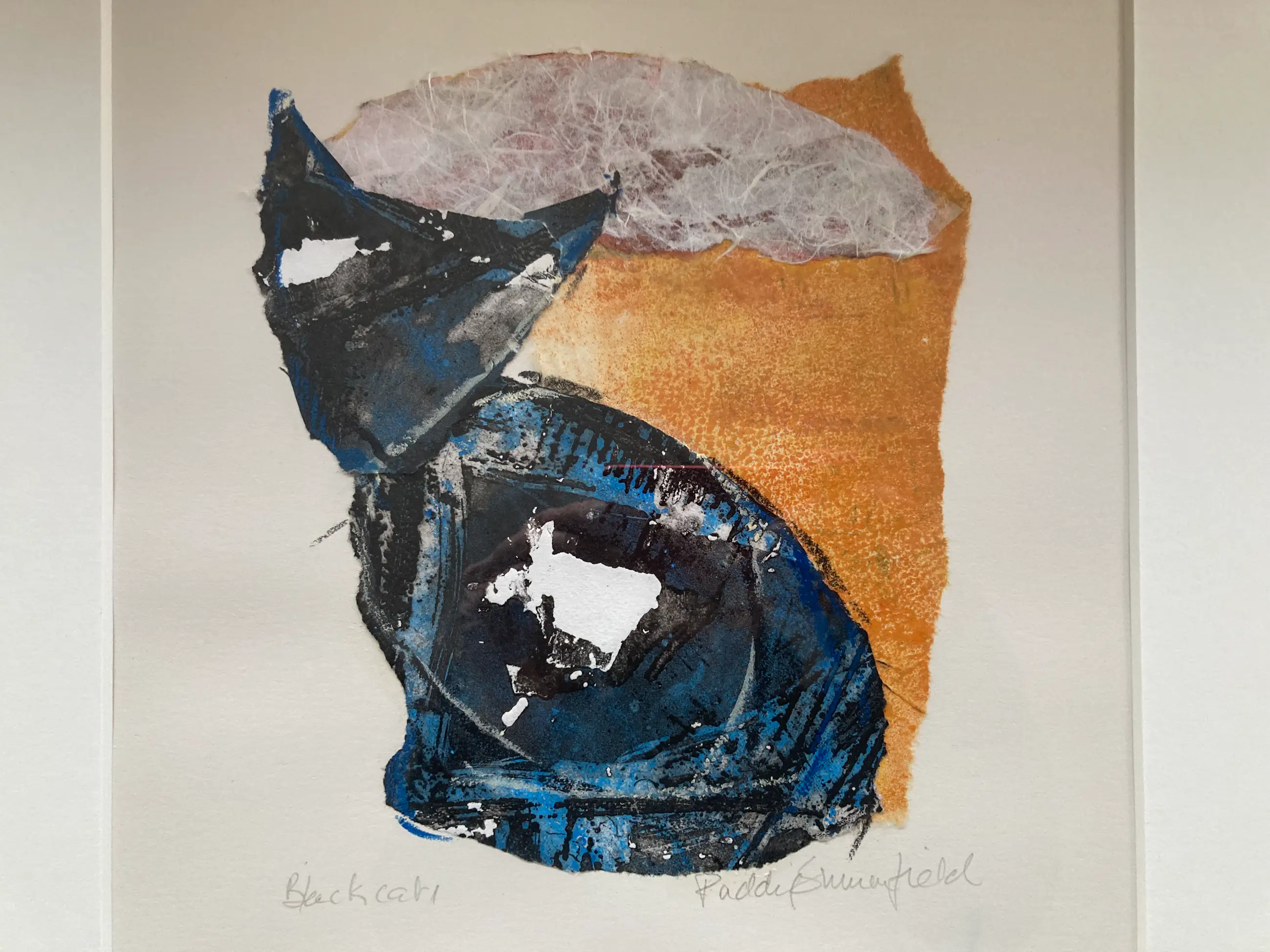 2 Bij elkaar horende lieve collages van papier/acryl geschilderd/ en op karton van fotograaf Paddy Summerfield: https://paddysummerfield.com/ Afbeeldingen van twee zwarte katten. Mooi ingelijst met passe partout in blank hout. Voor de poezen liefhebbers een buitenkans.