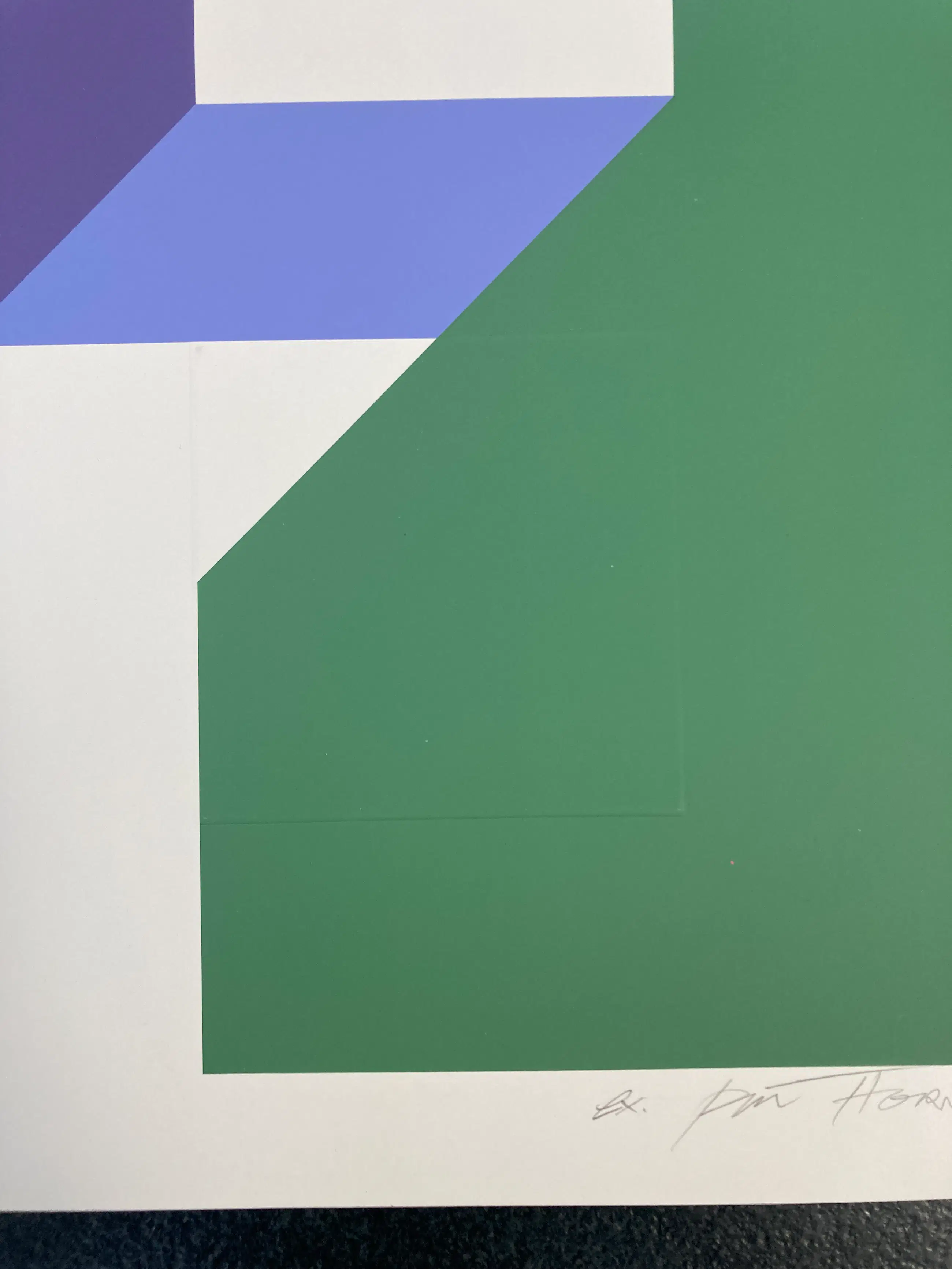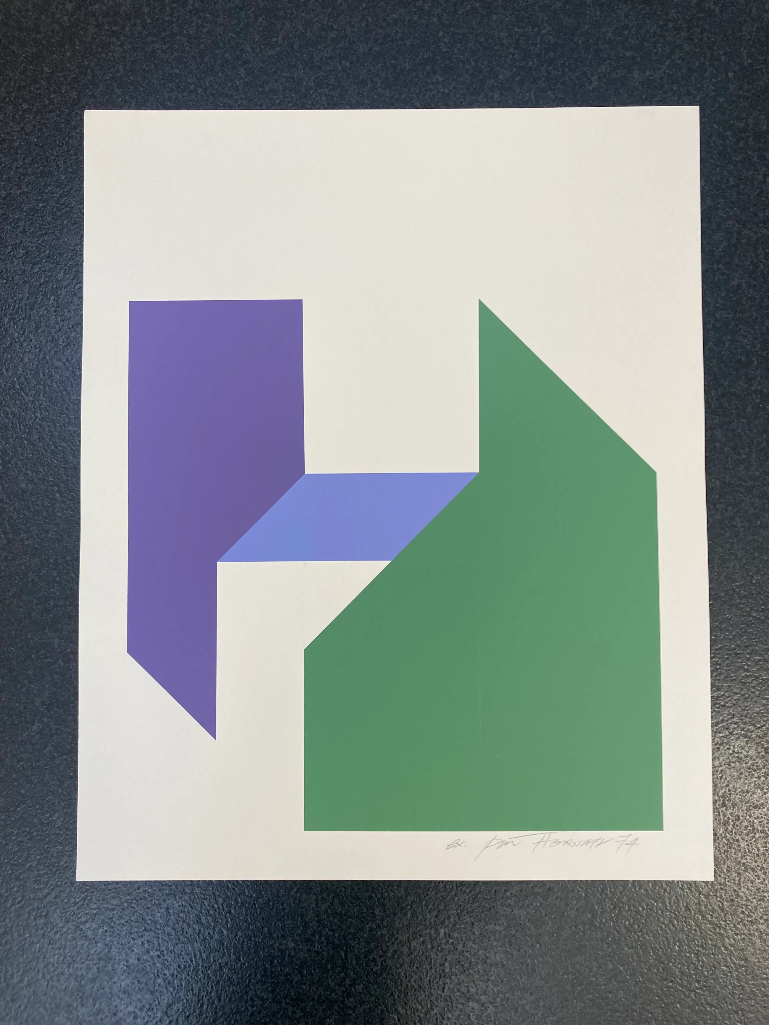 Typische zeefdruk met reliëf en geometrische kenmerken.