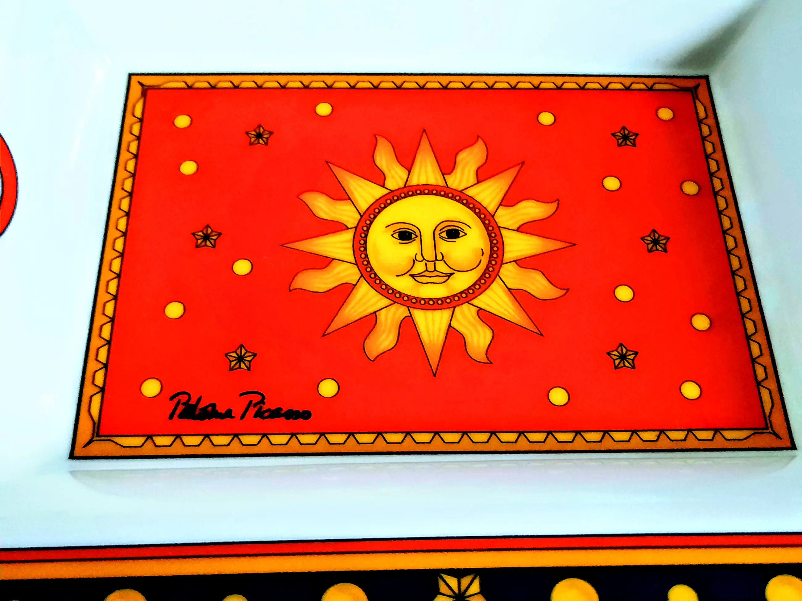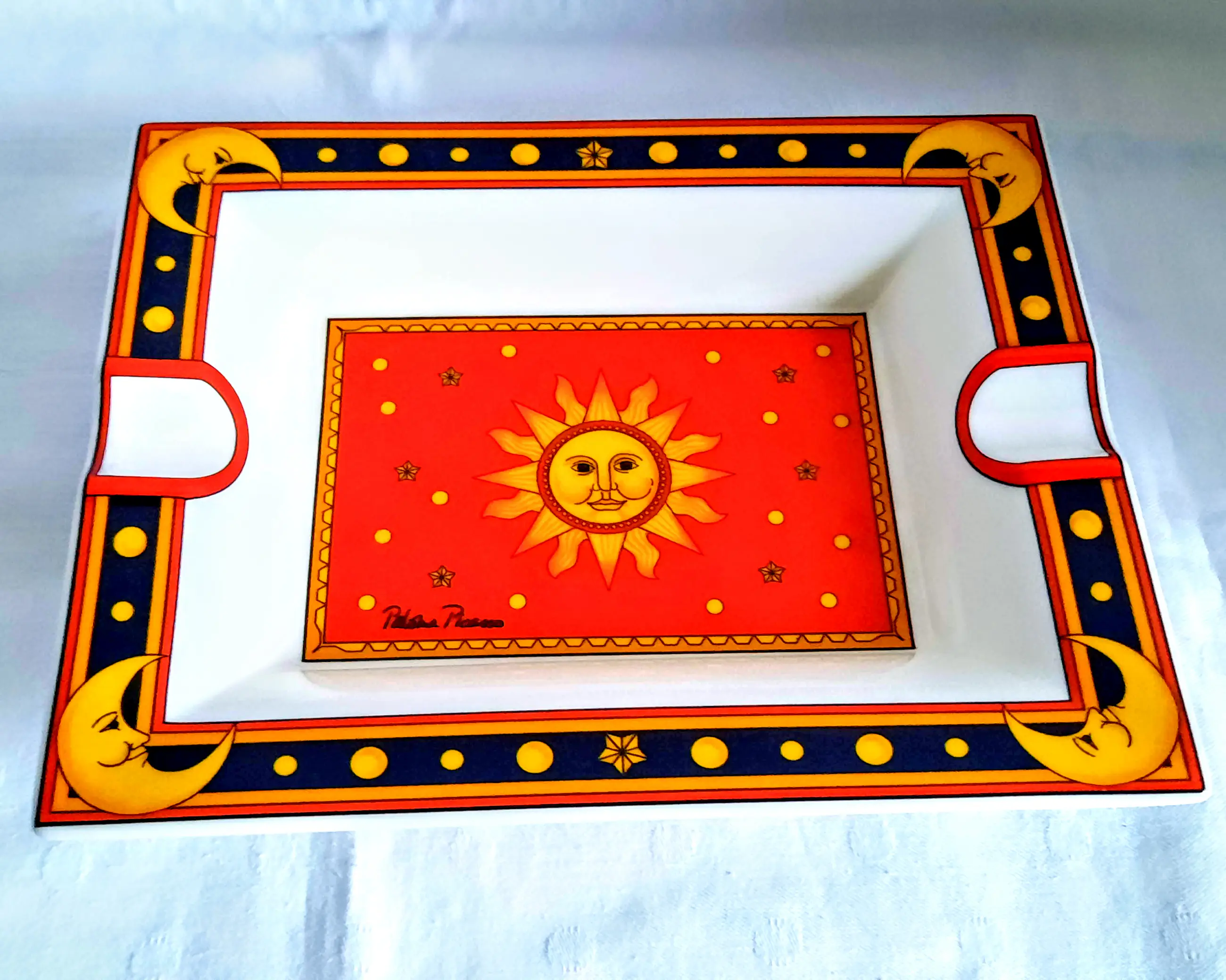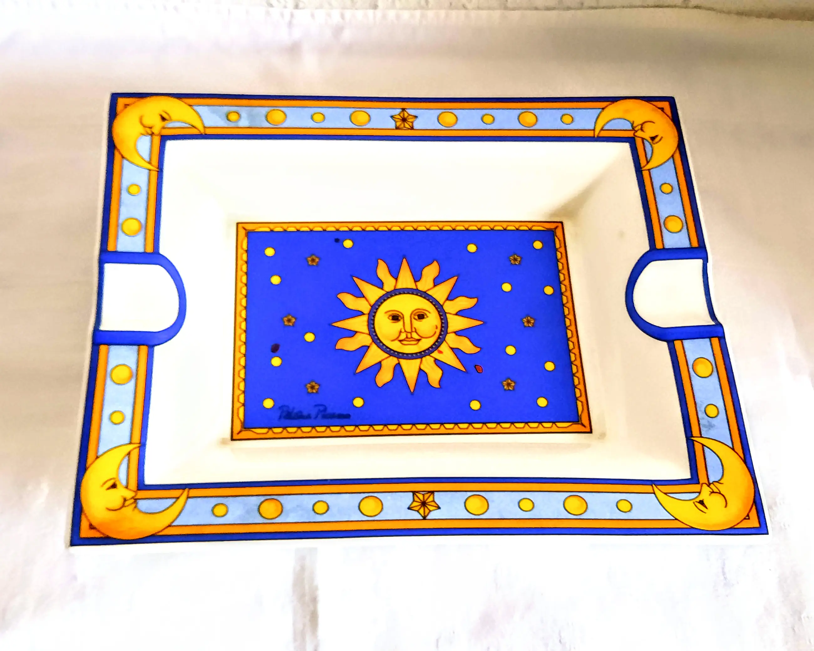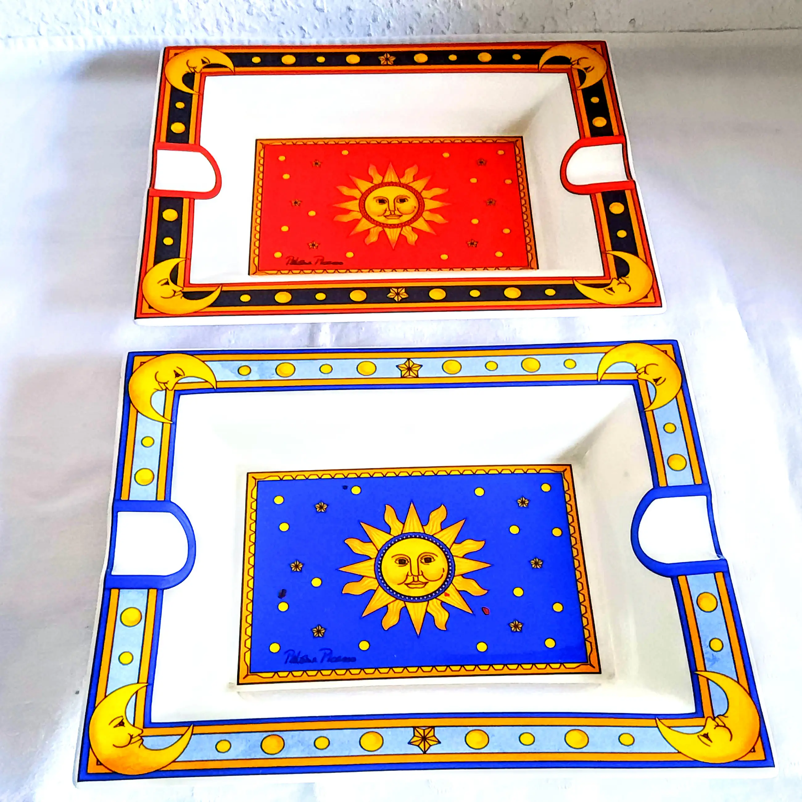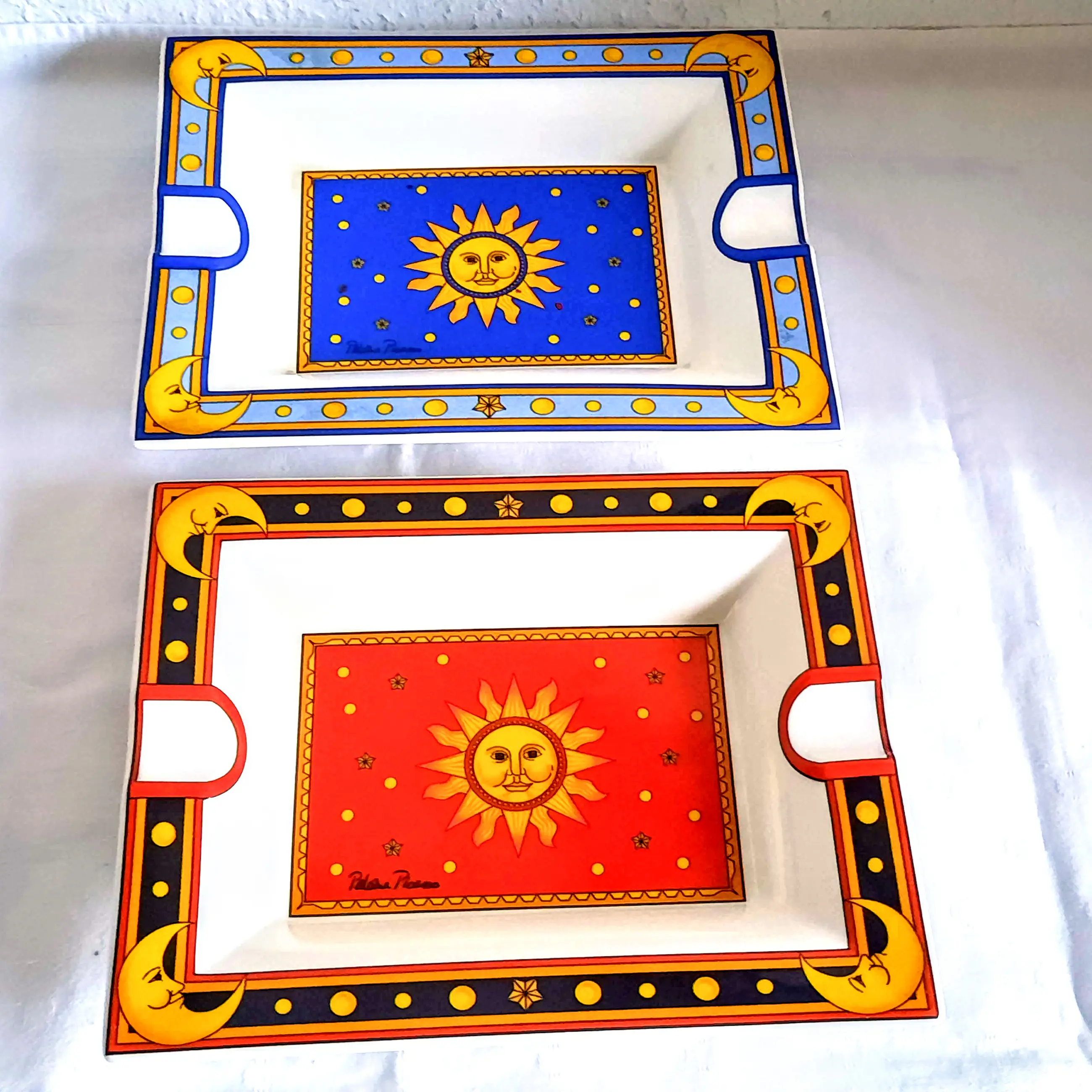 De asbakken zijn gemaakt van hoogwaardig bone china-porselein en zijn versierd met heldere blauwe, rode en gele kleuren, met afbeeldingen van de zon, de maan en de sterren.