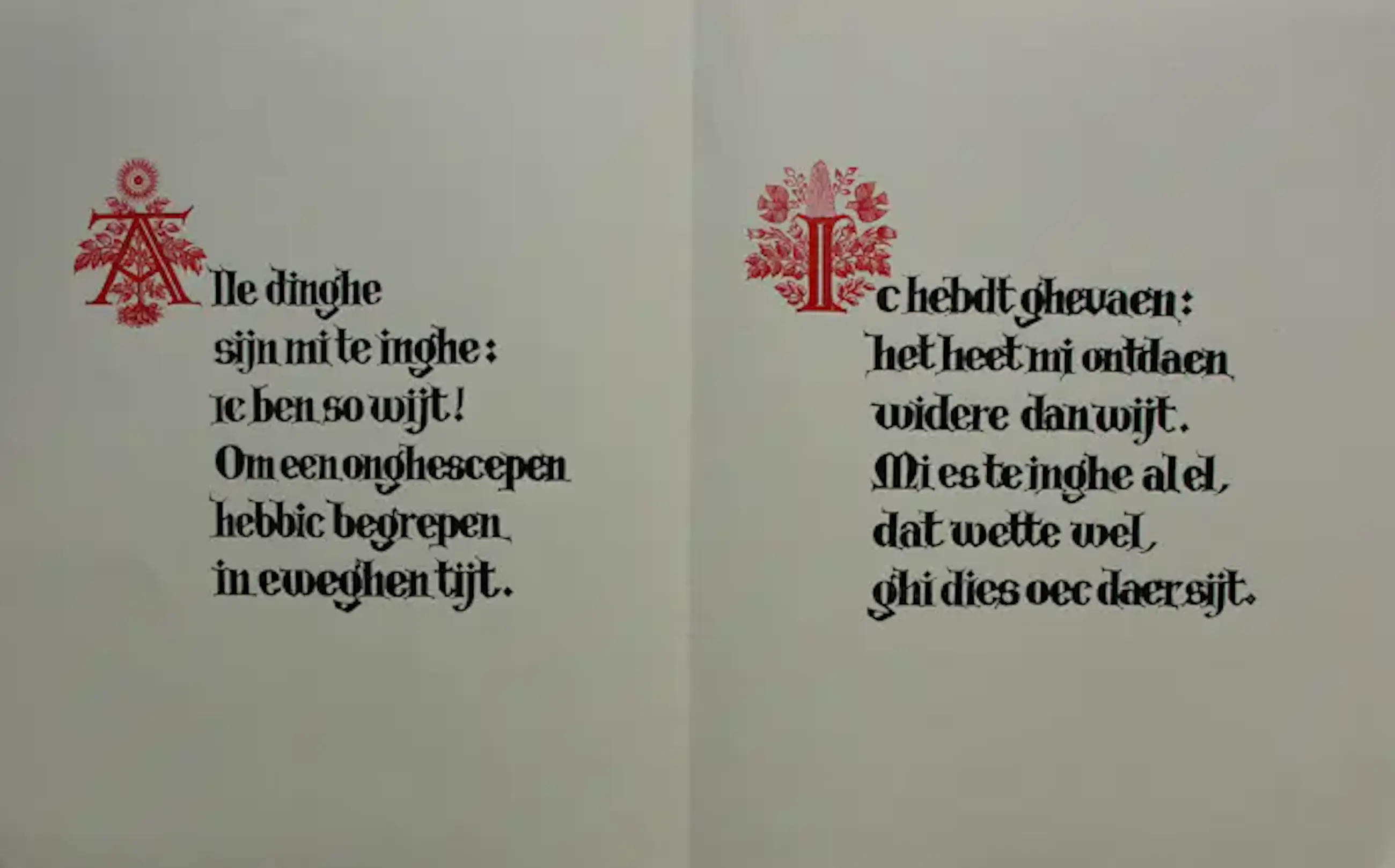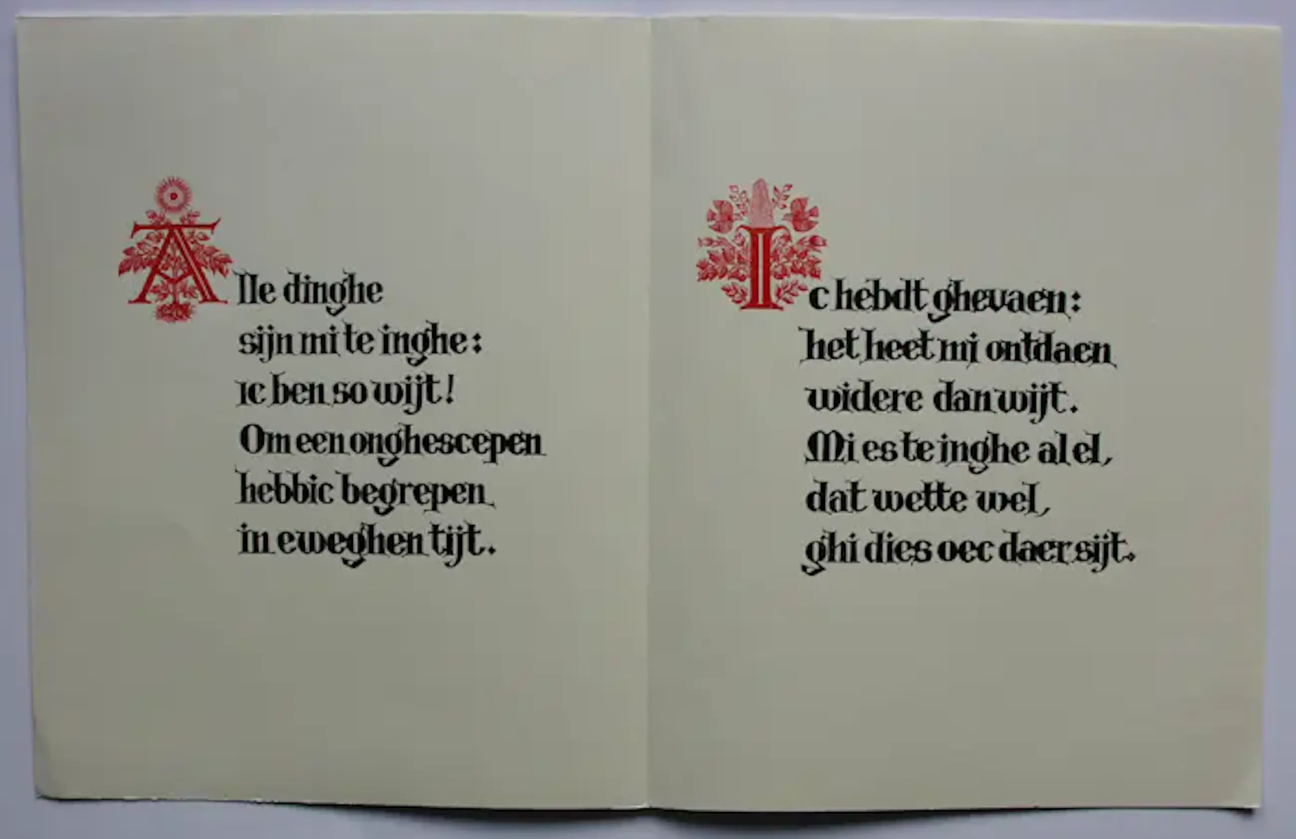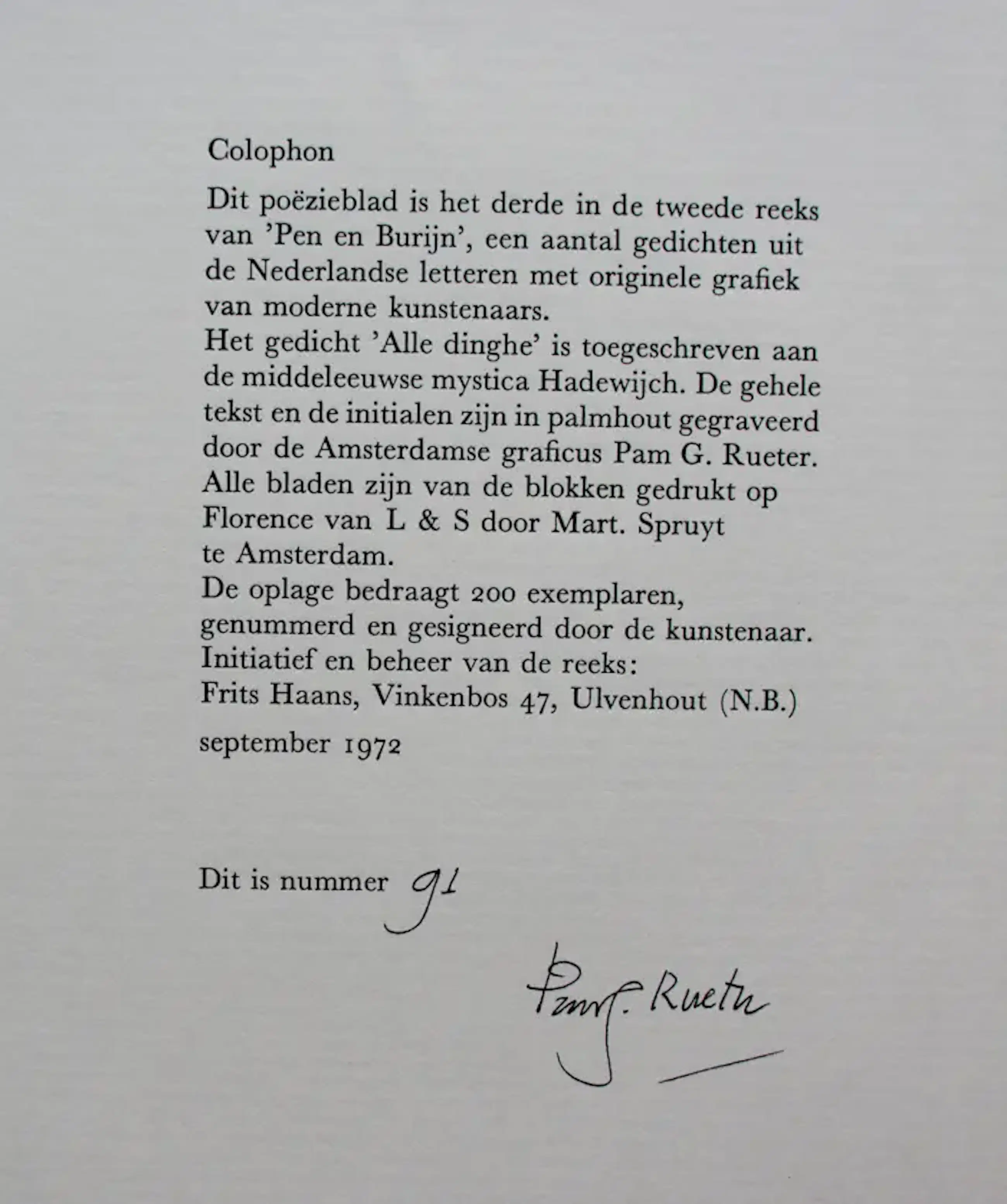Druk van Pam G. Rueter. Jaar: 1972. Nummer: 91/200. De tekst en de initialen zijn in palmhout gegraveerd door de Amsterdamse gaficus. Het betreft een gedicht van de middeleeuwse mystica Hadewijch. Het werk is op de achterzijde gesigneerd door Pam Georg Rueter. Afmetingen blad: H30 x b48 cm. Met middenvouw in blad zoals uitgegeven. De authenticiteit van het, aangeboden, werk wordt volledig gegarandeerd. Een certificaat van echtheid kan, op aanvraag, worden gemaild.