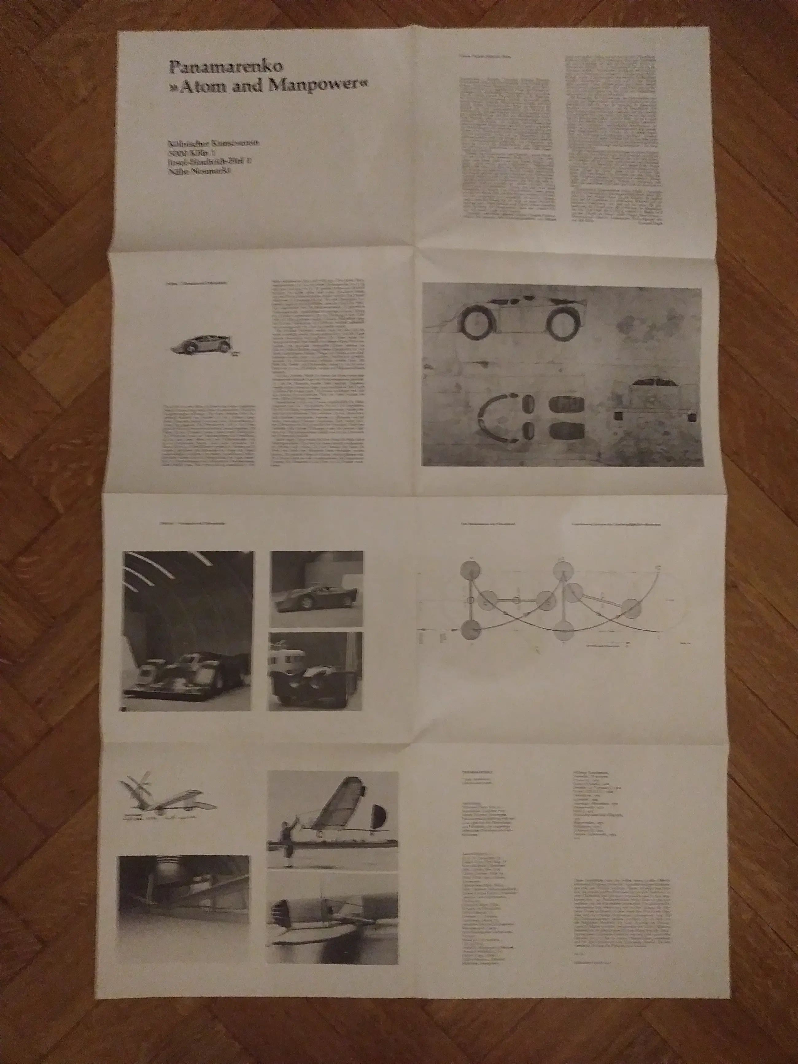 Zeldzame affiche/plooifolder van de expositie in Koln 'Atom and Manpower' 1975. Dit is de originele uitgave uit 1975 en dus NIET de print. Achterzijde bedrukt met foto's en uitleg over Panamarenko's creaties. In Perfecte staat!
