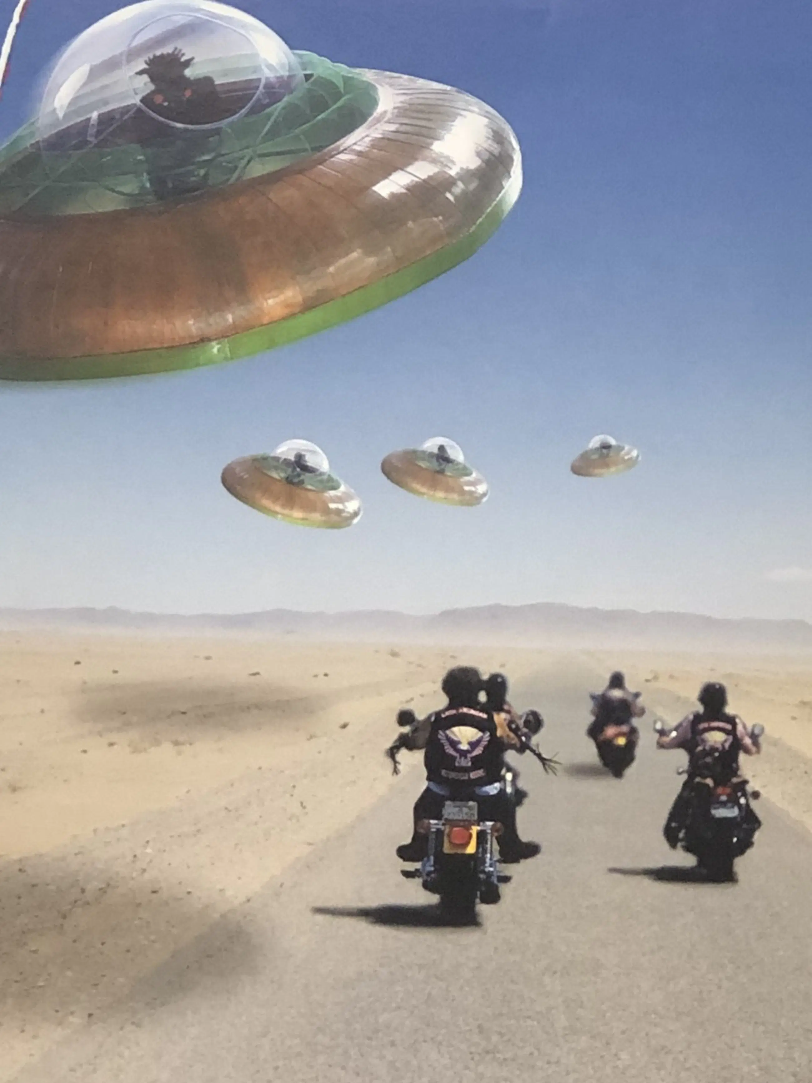 Flying Saucers and Devil howlers Motorcycle Club. Bovenaan zeer groot in druk gesigneerd. Poster in perfecte ongevouwen staat.