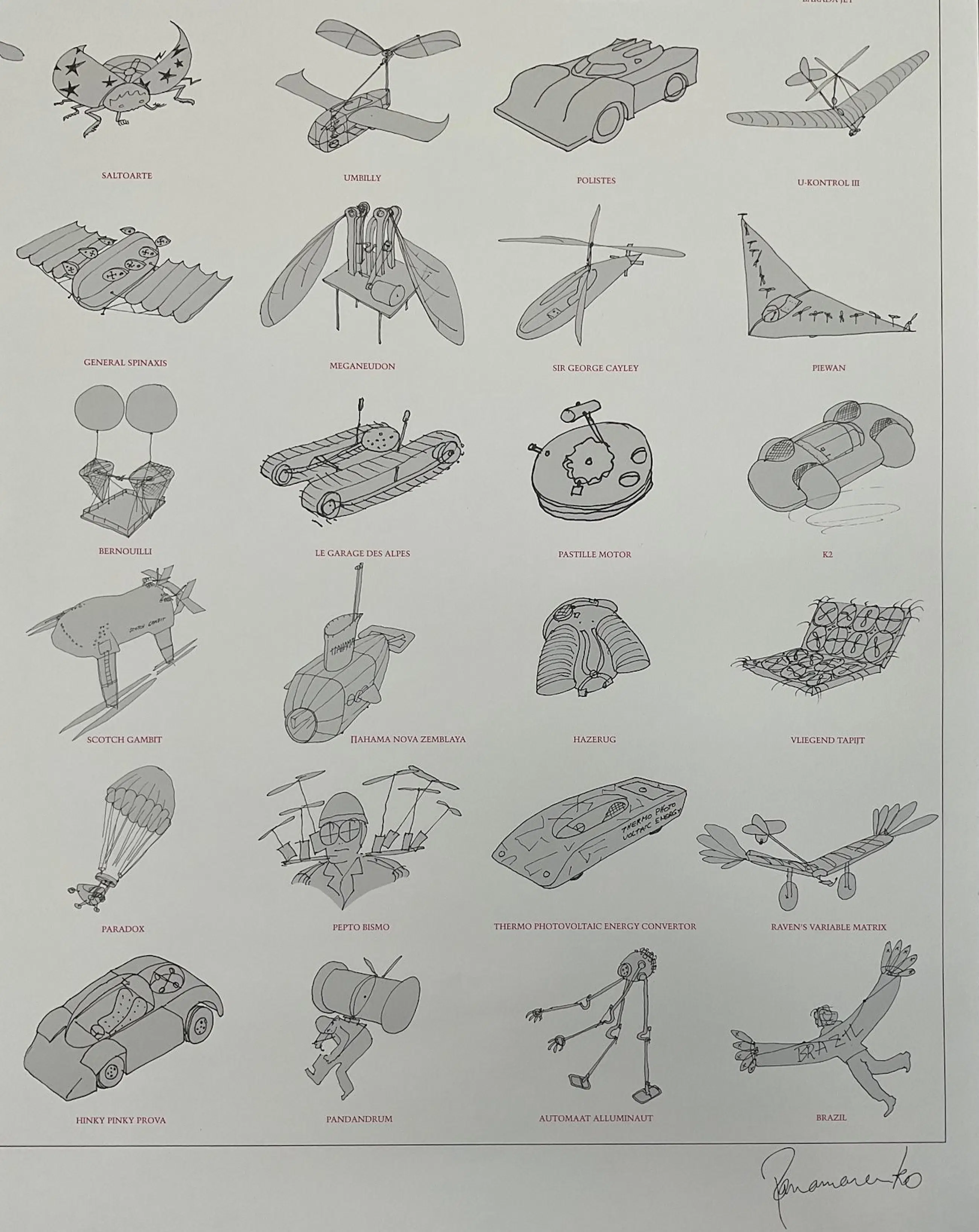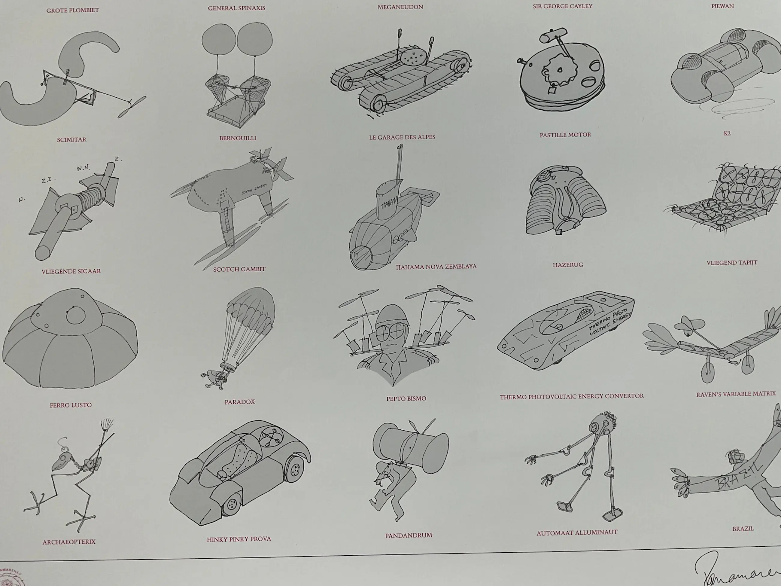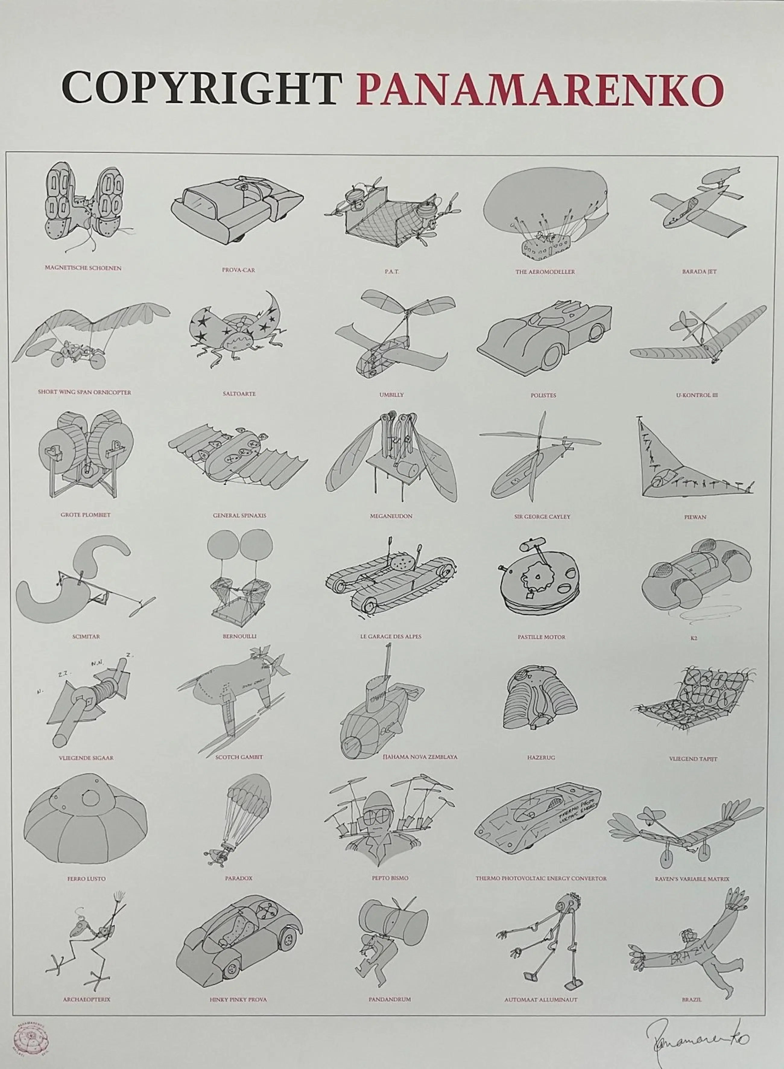 Poster in uitstekende en ongevouwen staat op dikker papier (gekartonneerd). Zeldzame en origineel uitgegeven poster van 20 jaar oud. Overzicht van 35 toonaangevende creaties - objecten van de hand van de kunstenaar. Waaronder ook meerdere iconische Panamarenko werken. Enkel op deze poster is ook de typische rode Panamarenko stempel links onder weergegeven. Uitgegeven naar aanleiding van verschijning van het boek Copyright Panamarenko, waarin al deze en nog vele andere creaties door de kunstenaar werden besproken. Bekend als poster nr. 98, boek Panamarenko posters pag. 93. Veilige verzending in stevige koker.