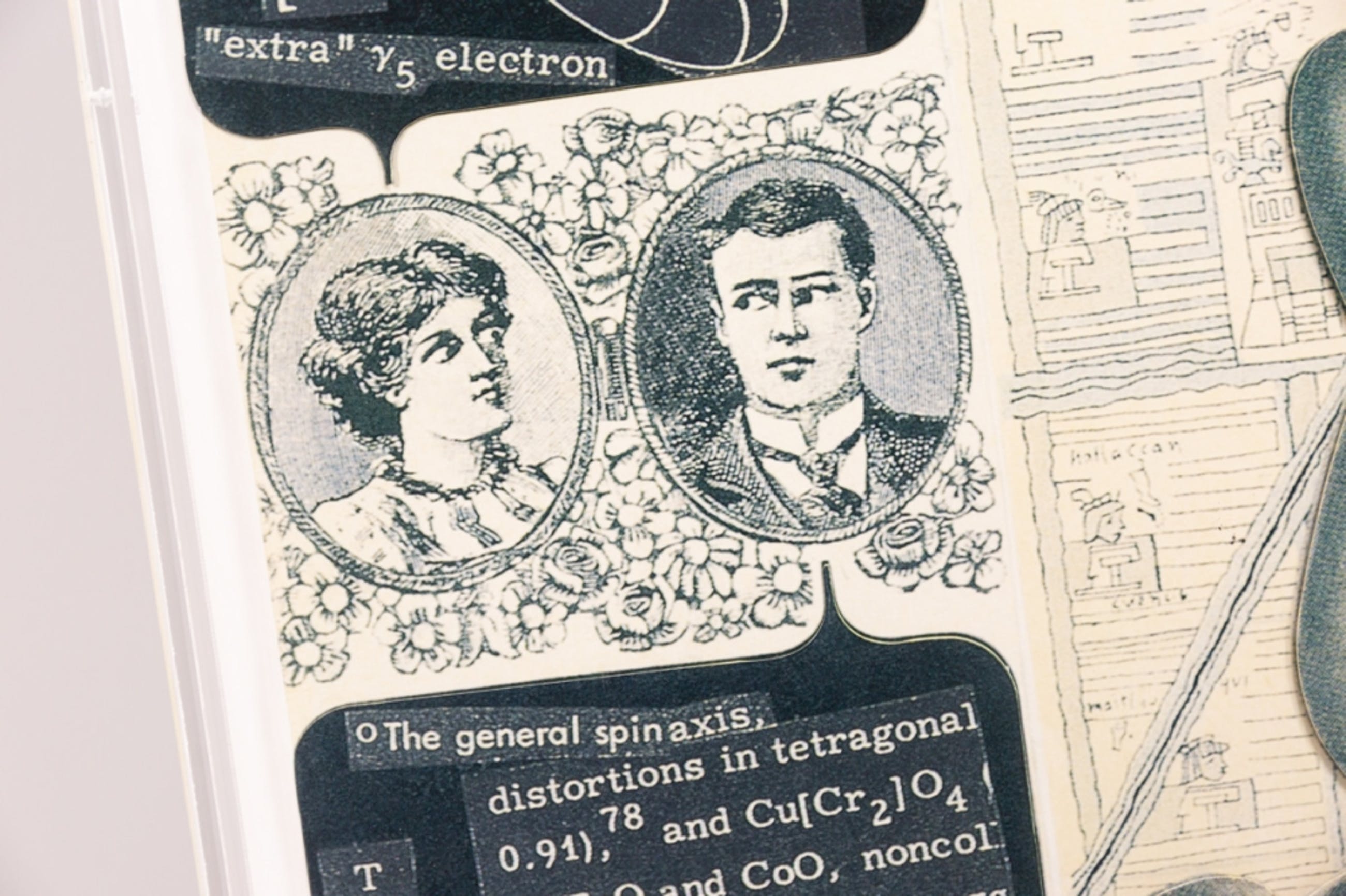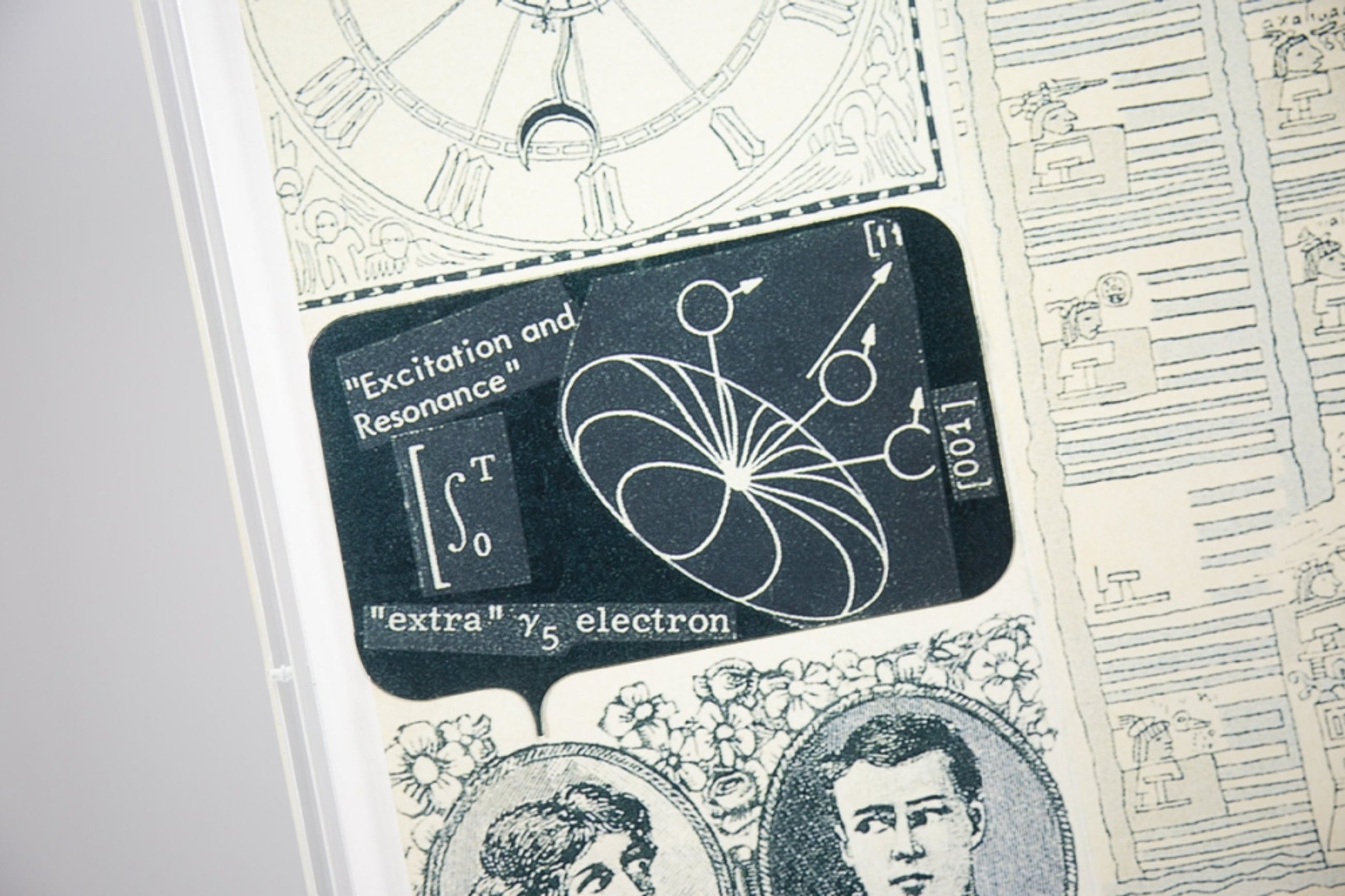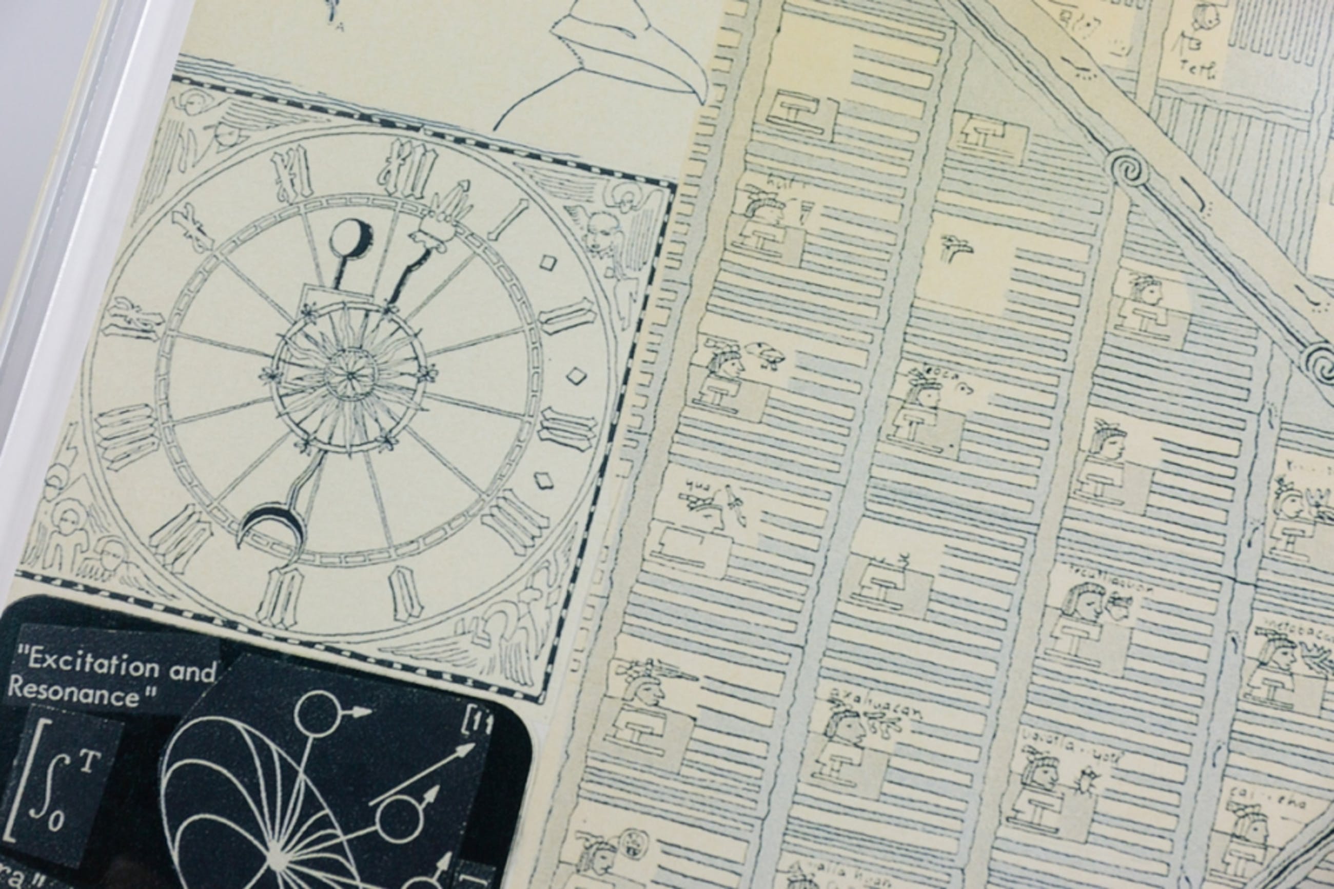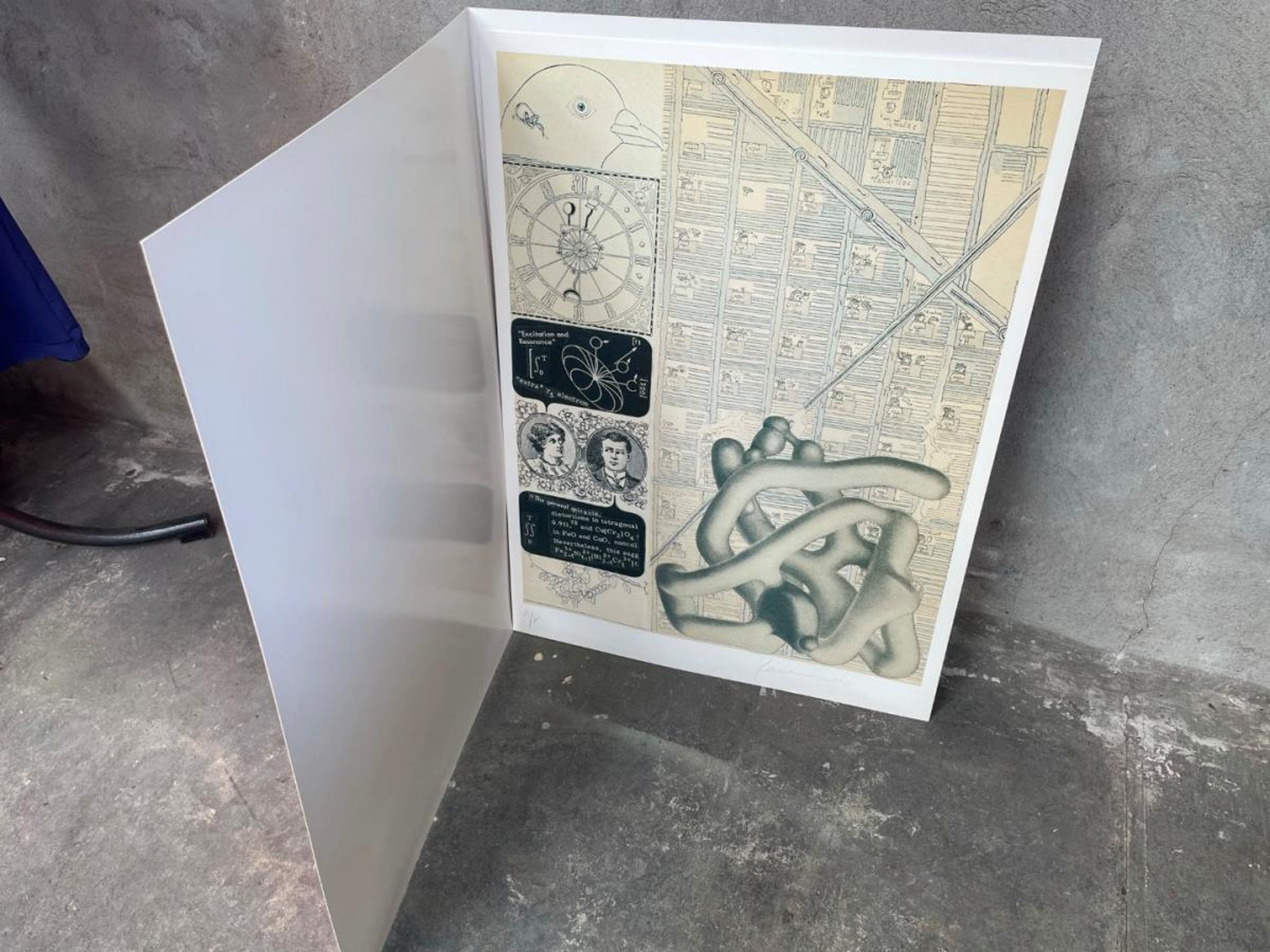 Offsetlitho en collage. Bepaalde stukken van het werk zijn enkel milimeters opgehoogd.