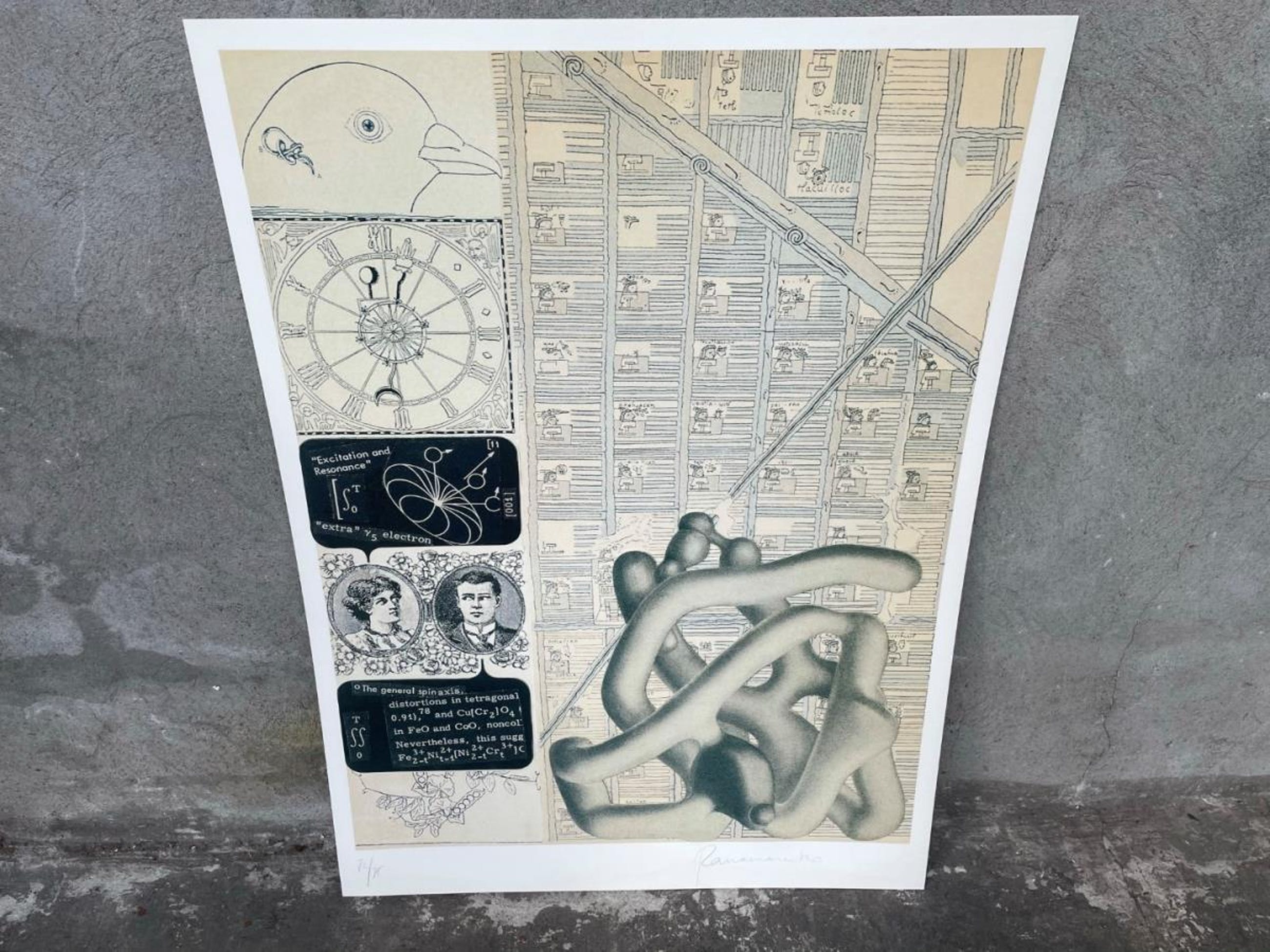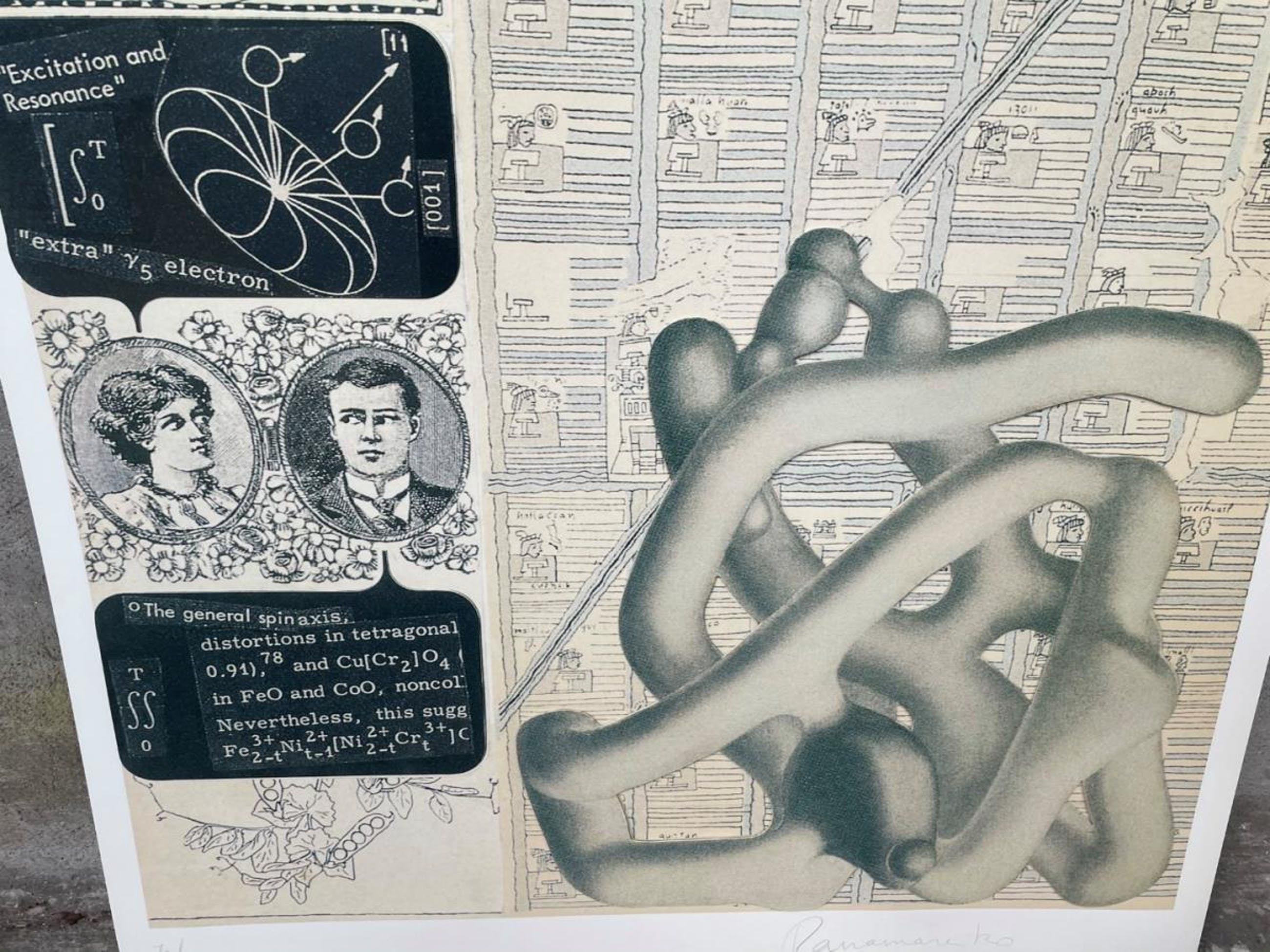 Collage/print uit 2003 uitgegeven door Ronny Van de Velde i.s.m Panamarenko ter gelegenheid van de opening van de Antwerpse Luchtschipbouw, zijn toenmalige atelier annex tentoonstellingsruimte. Panamarenko ontwierp in de jaren zestig tientallen van dergelijke collages, specifiek om deze in zwart-wit te publiceren in zijn pamflet "Happening News", maar deze waren intussen wat in de vergetelheid geraakt.
