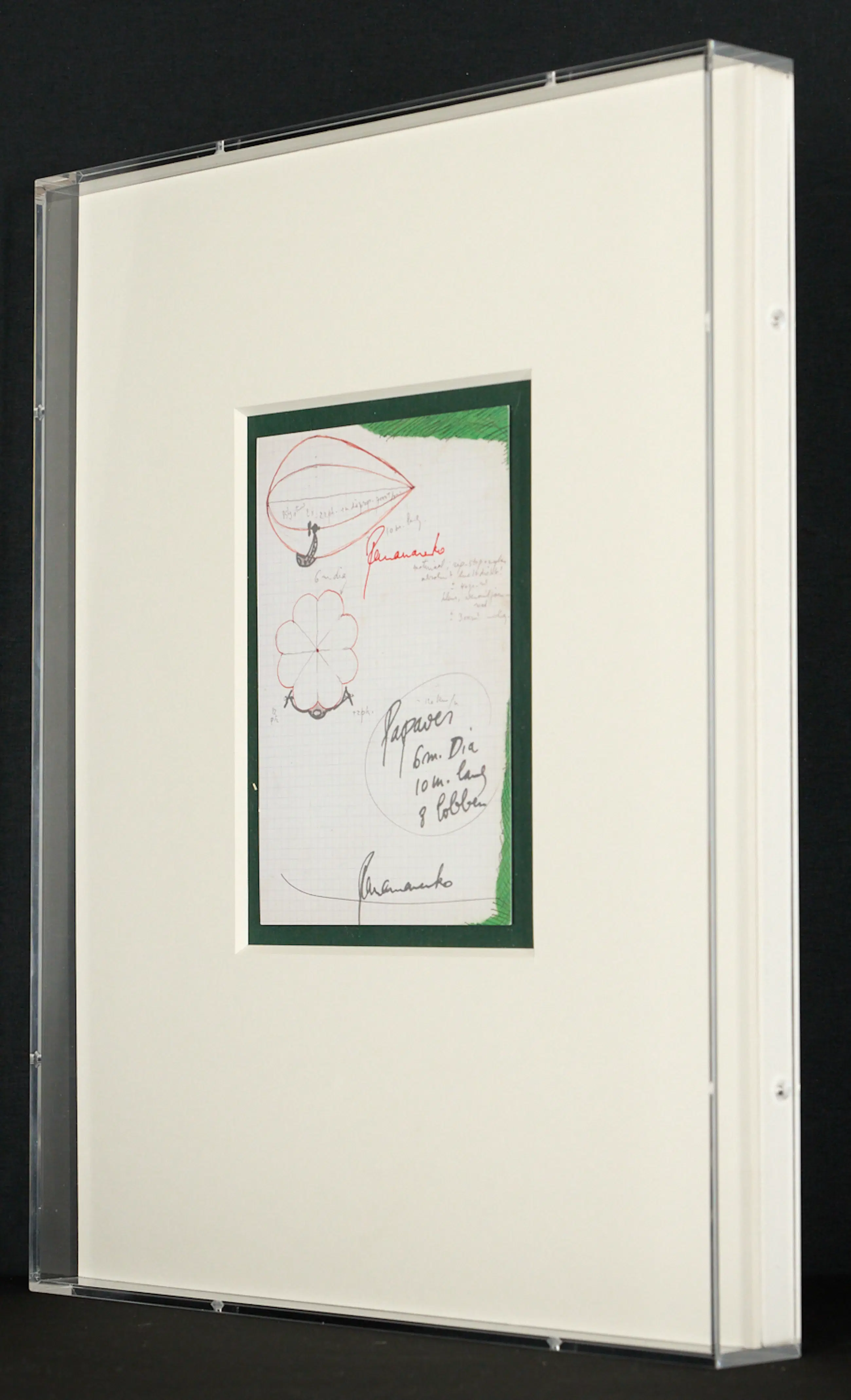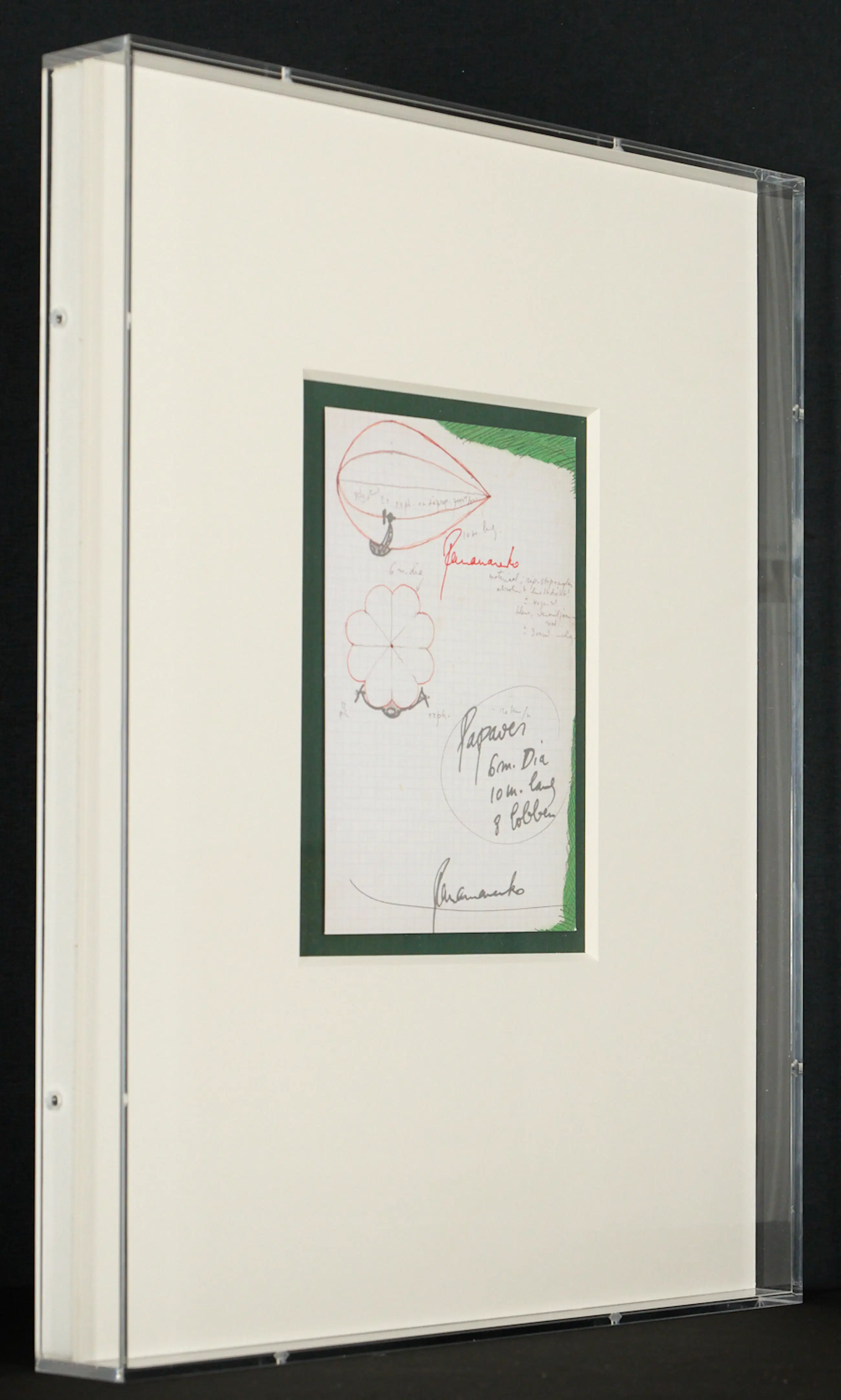 Het werk is bovenaan, naast de rode “Papaver”, in rood door Panamarenko gesigneerd.