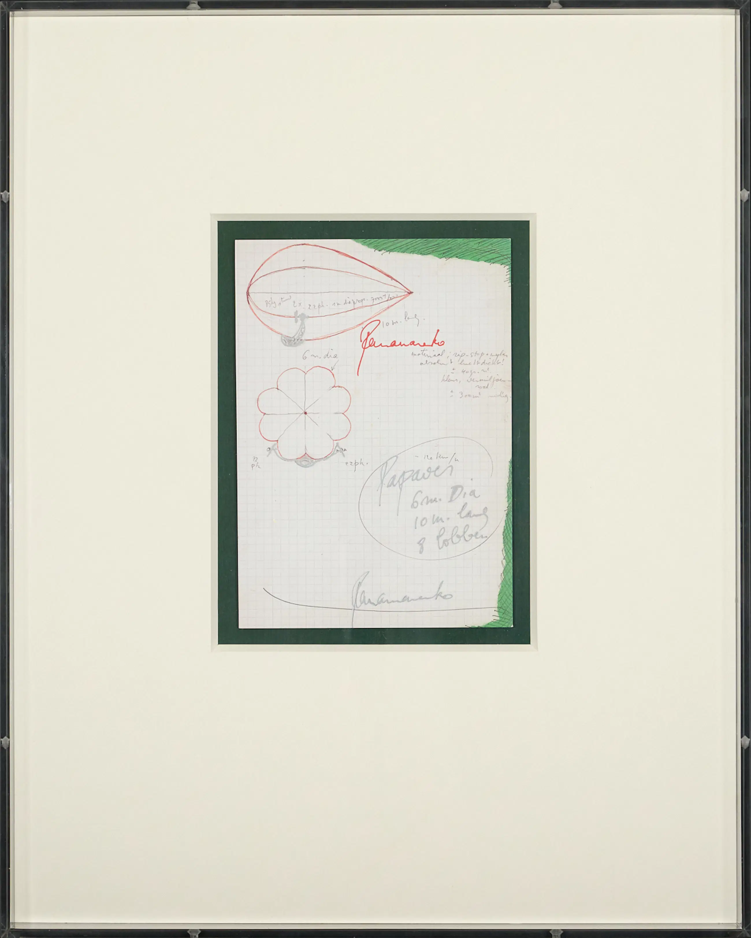 De afgebeelde tekening is uitgewerkt op geruit papier en bevat technische details, maatverhoudingen en materiaalvermeldingen voor een vliegende constructie. Een bijschrift vermeldt: “Papaver – 6 m diameter, 10 m lang, 8 Robben”.