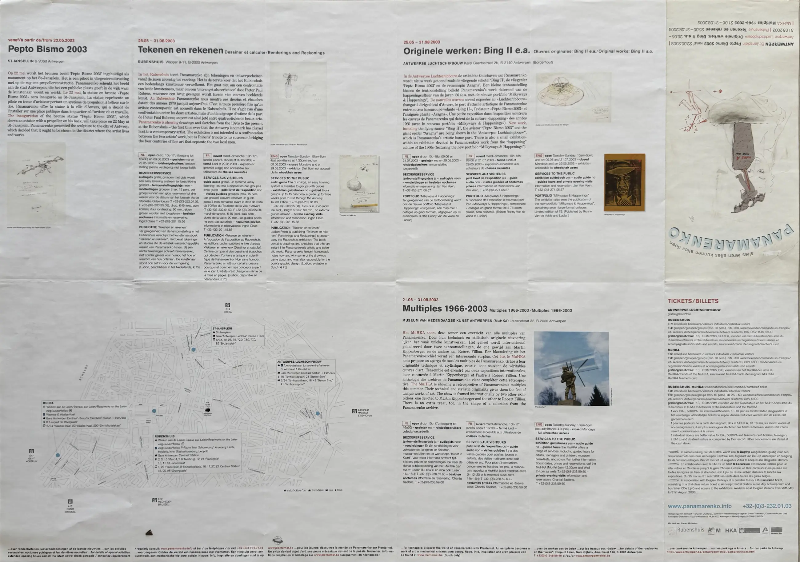 Deze originele tentoonstellingsposter uit 2003 werd uitgegeven ter gelegenheid van een grootschalige overzichtstentoonstelling op diverse locaties in Antwerpen, waaronder het St.-Jansplein, Antwerpse Luchtschipbouw, het Rubenshuis en het MuHKA. De poster toont een van Panamarenko’s iconische ontwerpen, waarin technische precisie wordt gecombineerd met speelse, surrealistische elementen. Dit beeld weerspiegelt zijn levenslange fascinatie voor luchtvaart, beweging en de droom van menselijke vlucht, thema’s die door zijn hele oeuvre heen te herkennen zijn. Maat poster ca. 59 x 42 cm. De poster is gevouwen (als uitgebracht).