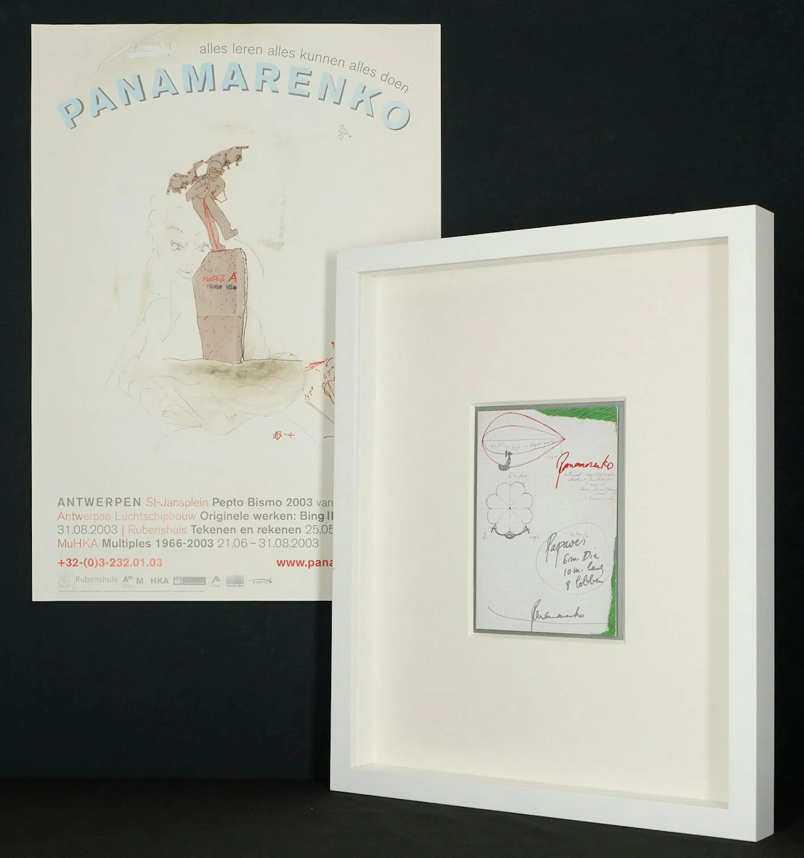 Gesigneerde uitnodiging voor tentoonstelling „Panamarenko - Papaver - Luchtschipbouw” (2002), fraai ingelijst met hierbij de mooie poster “ alles leren alles kunnen alles doen.”