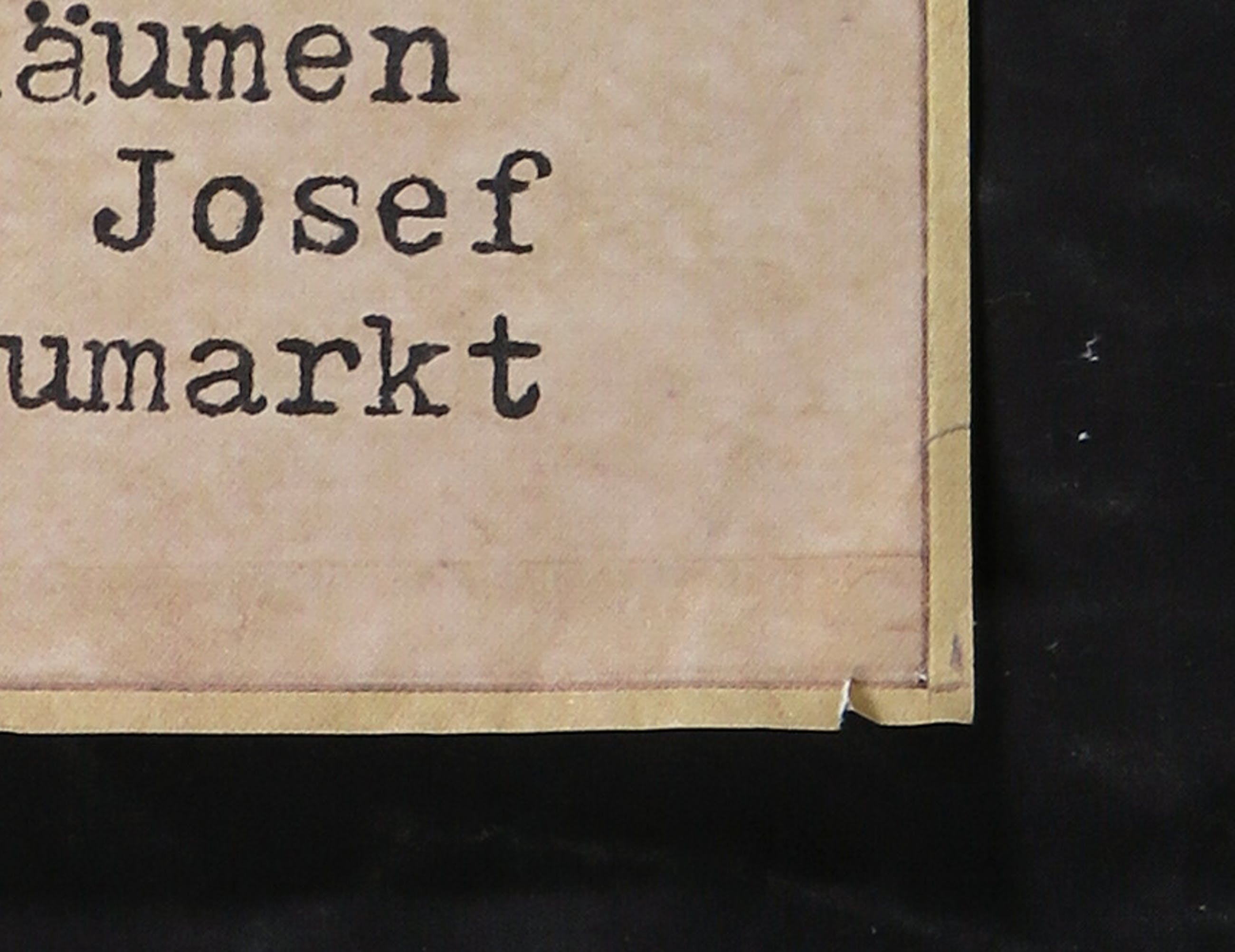 | Zeer goede staat. In de hoek rechtsonder is het op twee plekken een halve centimeter ingescheurd. Punaisegaatjes in de vier 'hoeken'. Langs de rand rechts nog een stukje ingescheurd en een breukje in het papier (gefixeerd met plakband aan de achterzijde). | |||