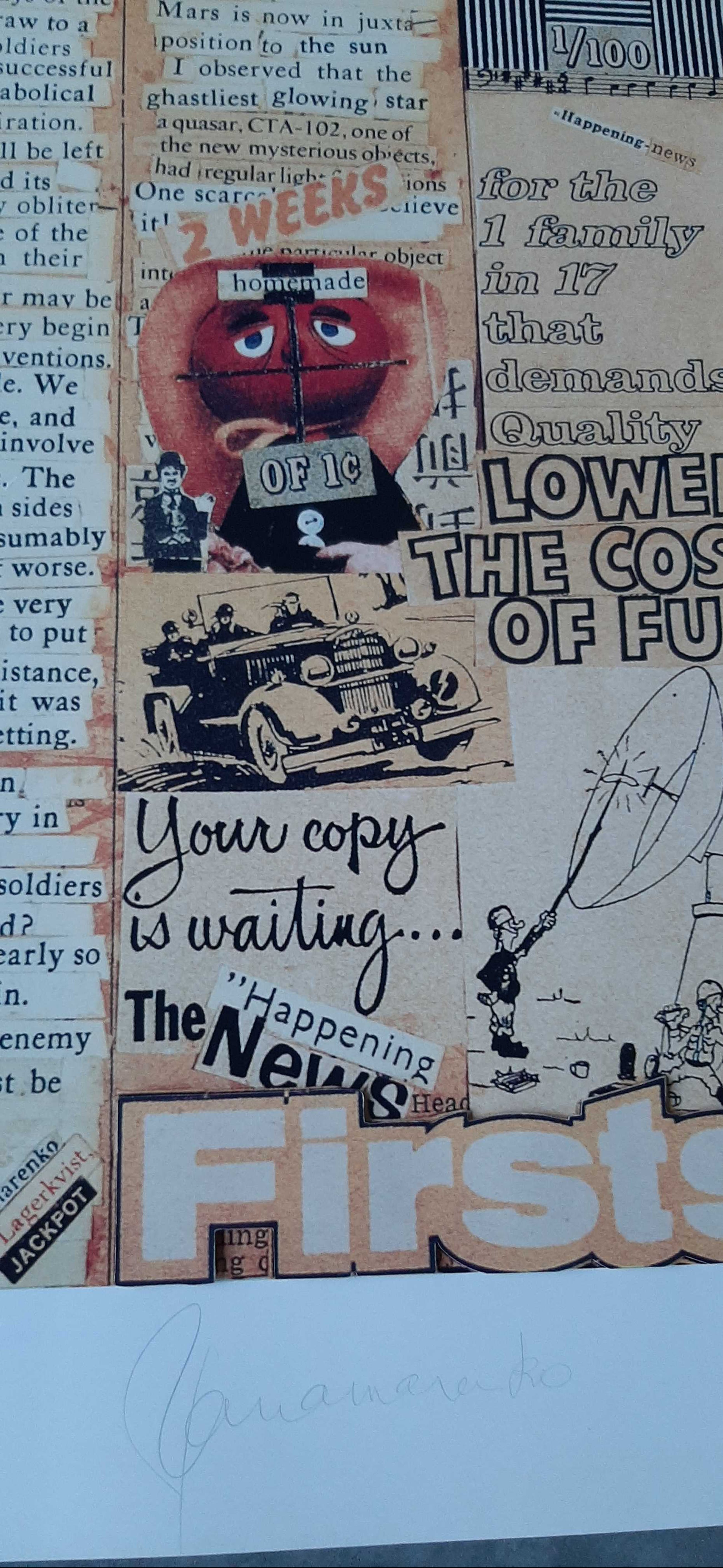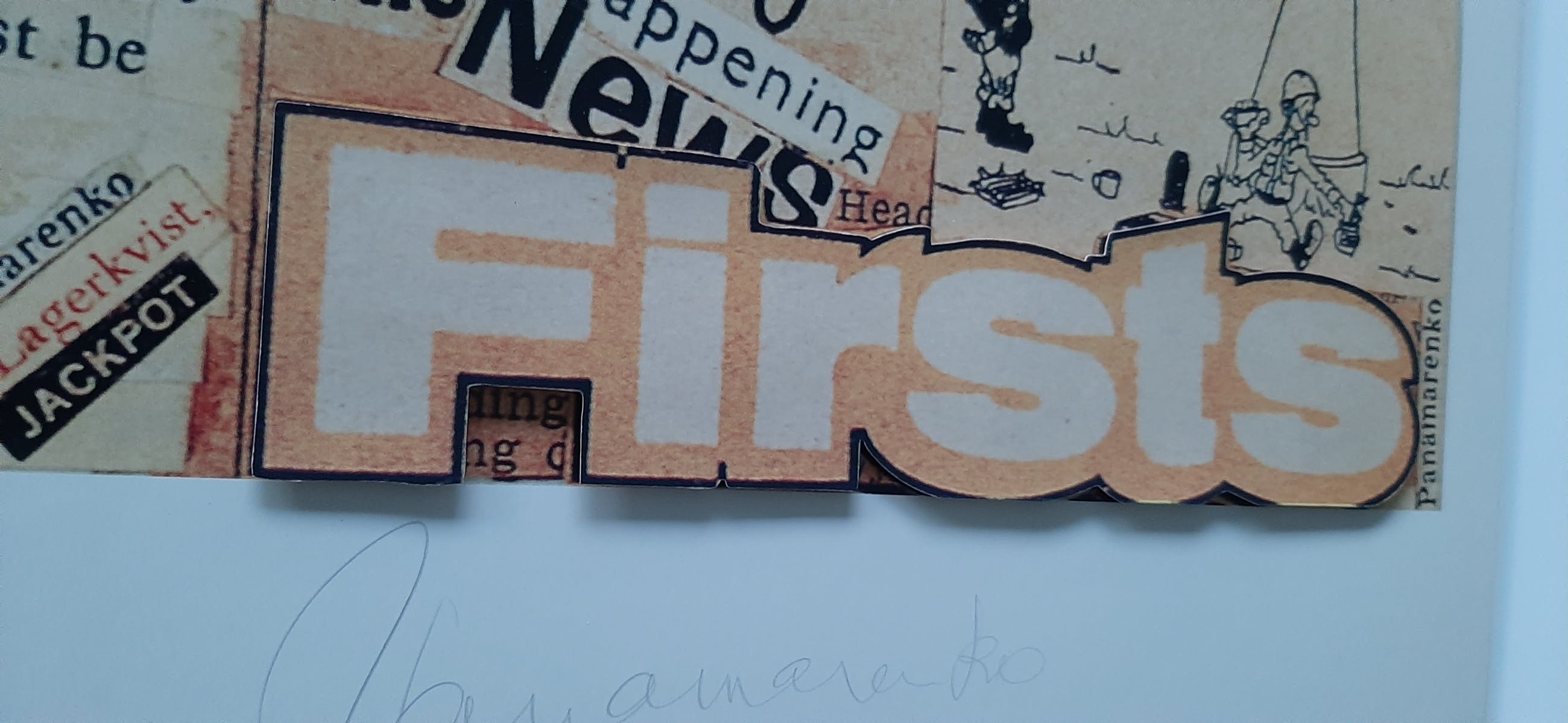 Offsetlitho en collage, zowel matte als glanzende stukken, prachtig, maar moeilijk te zien op de foto's. Bepaalde stukken van het werk zijn enkel milimeters opgehoogd: Het woord 'Firsts' en de afbeelding van de machine, ook moeilijk te zien op de foto's. Dit is 1 van de 10 HC exemplaren