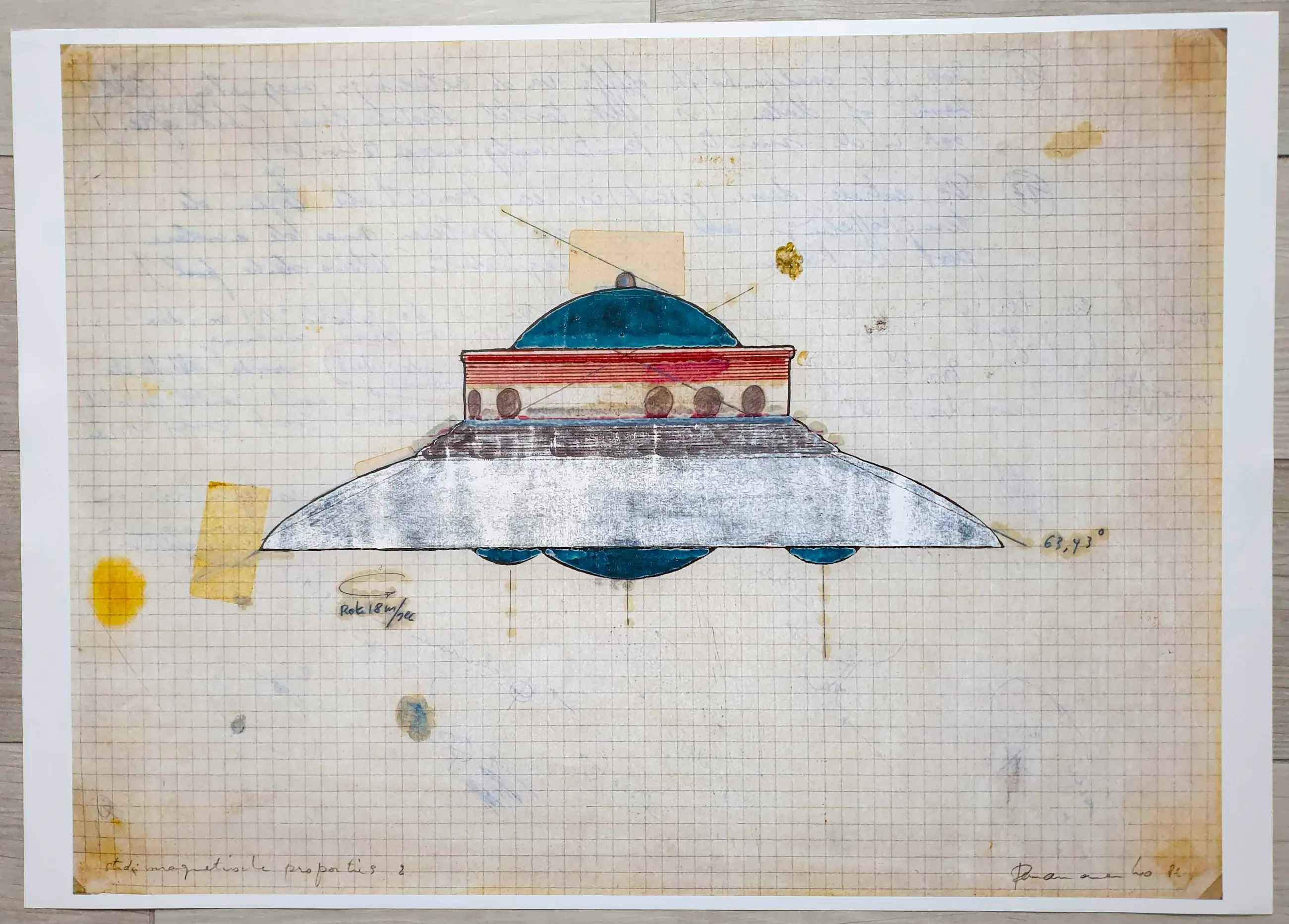 Mooie offset print op 250 g papier, gesigneerd in de plaat, naar originele tekening uit 1982 (en zeefdruk ‘Adamski schotel’ uit 2014). Uitgever: KMSKA (in 2025 n.a.v. 85ste verjaardag) in samenwerking met Panamarenko Foundation. Wordt verstuurd in een verstevigde koker, incl. track & trace.