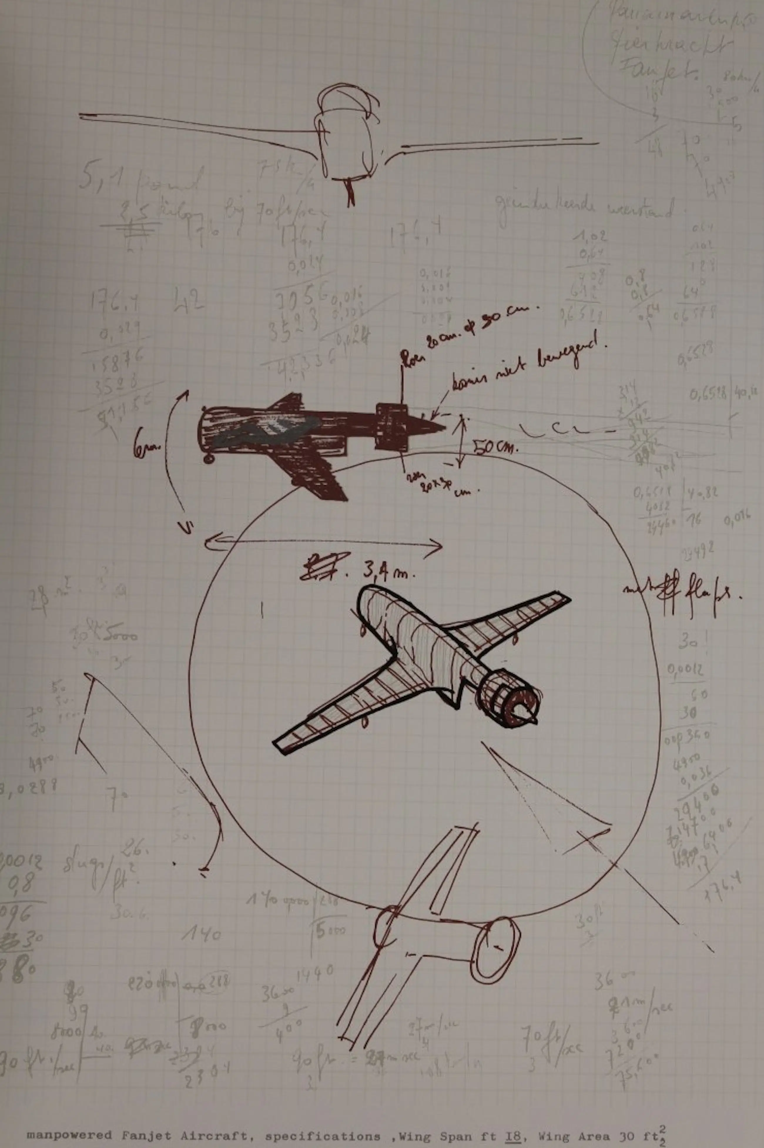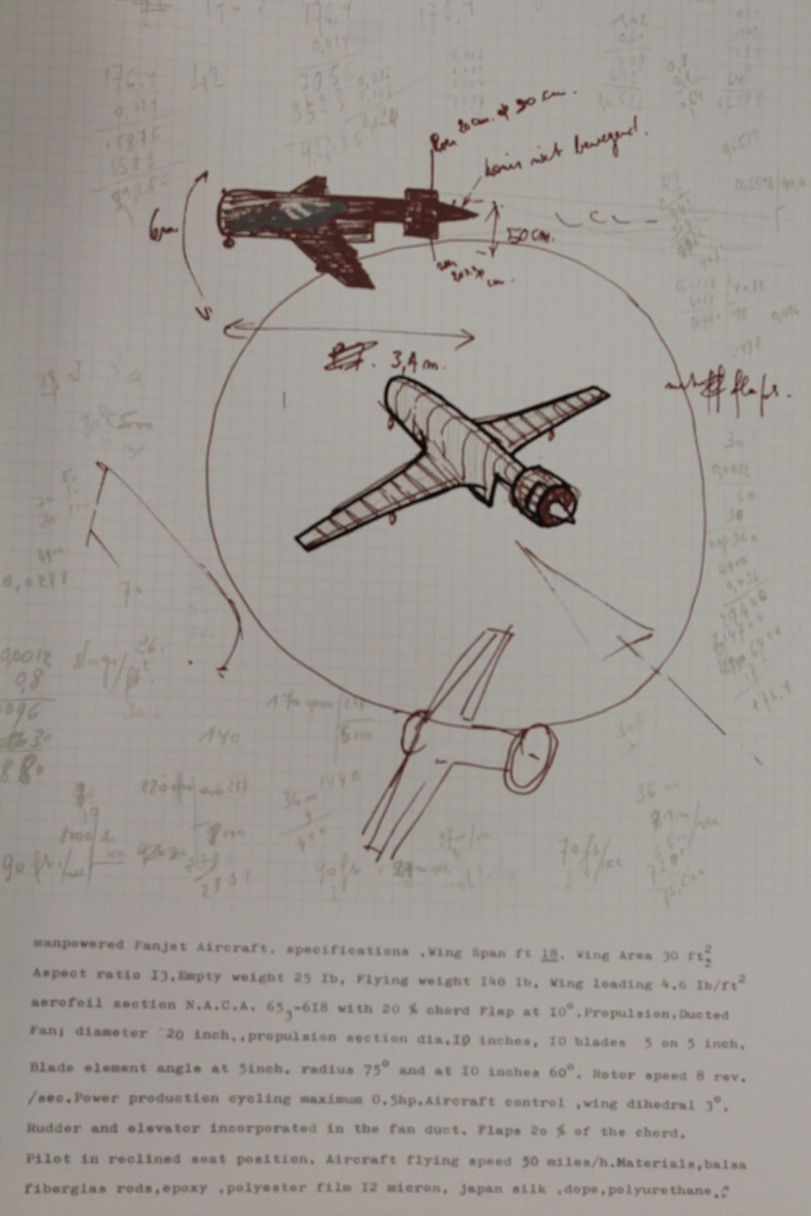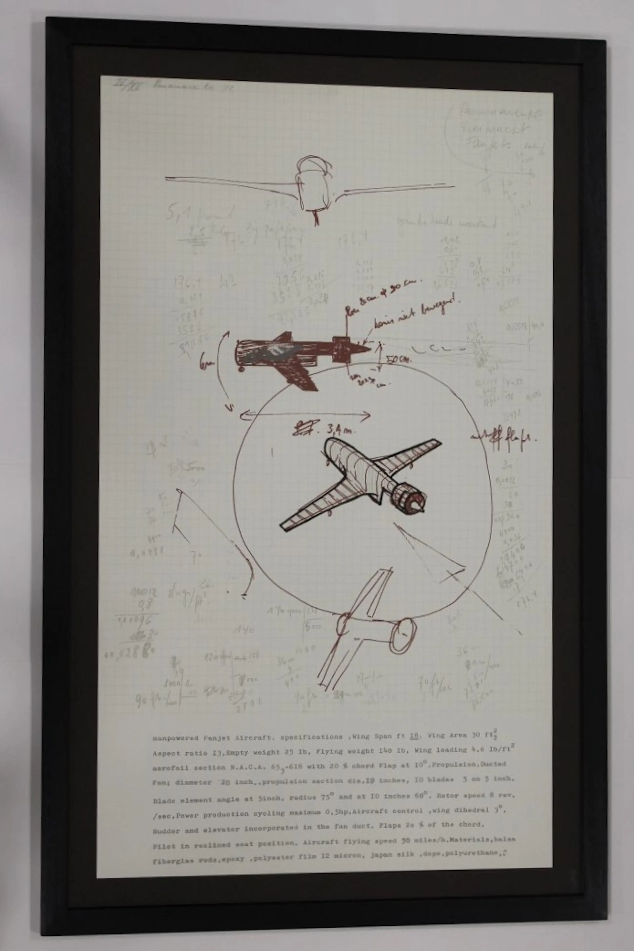 Het werk hoort thuis in de door Panamarenko veelvuldig en op zijn typische manier gemaakte familie van de door mensenkracht aangedreven vliegtuigen. Het werk bevat zowel de kenmerkende technische tekeningen, berekeningen en het visionaire gedachtegoed van de kunstenaar. Ideaal voor wie een plaatsje heeft voor een echt goed werk van Panamarenko.