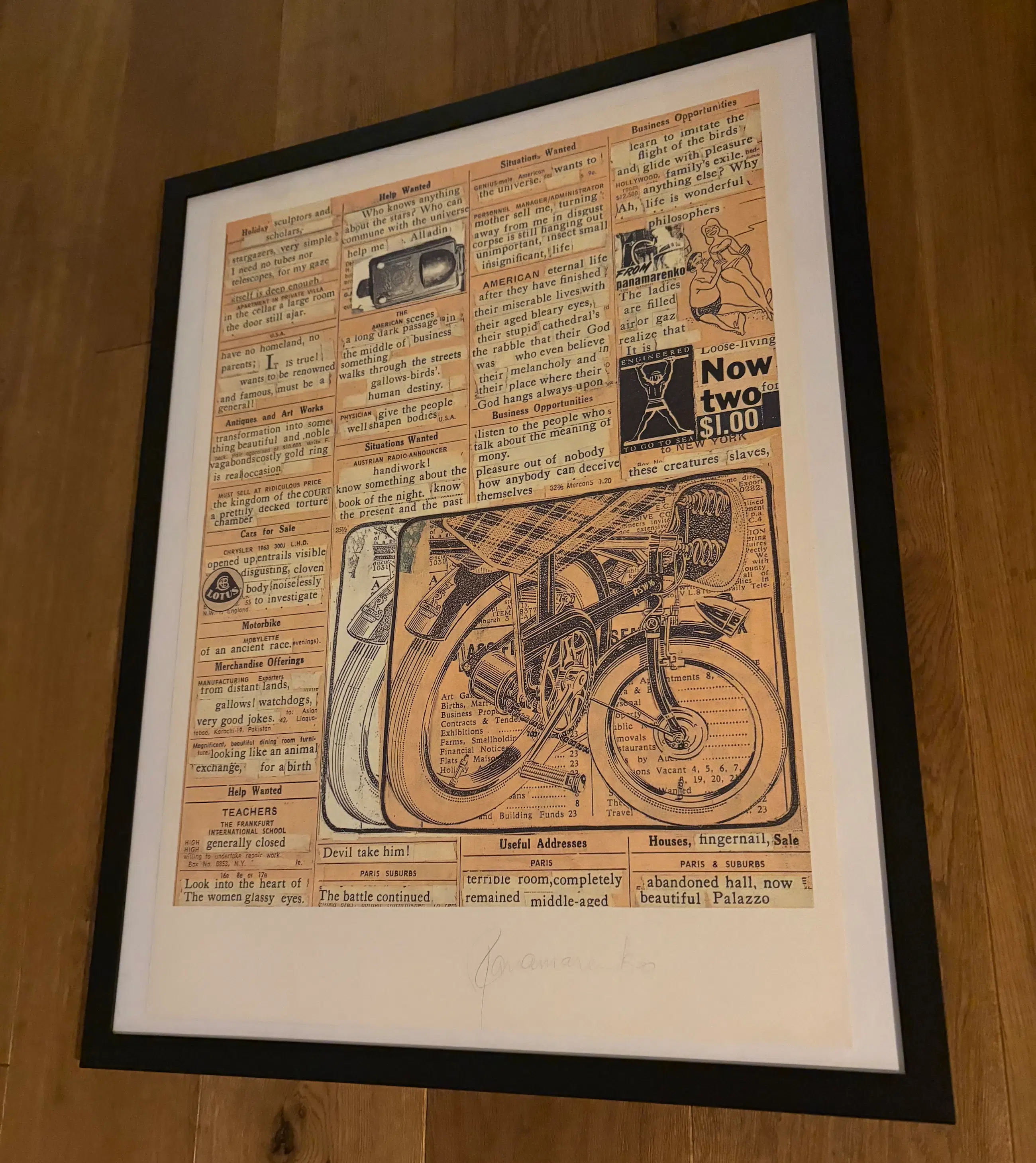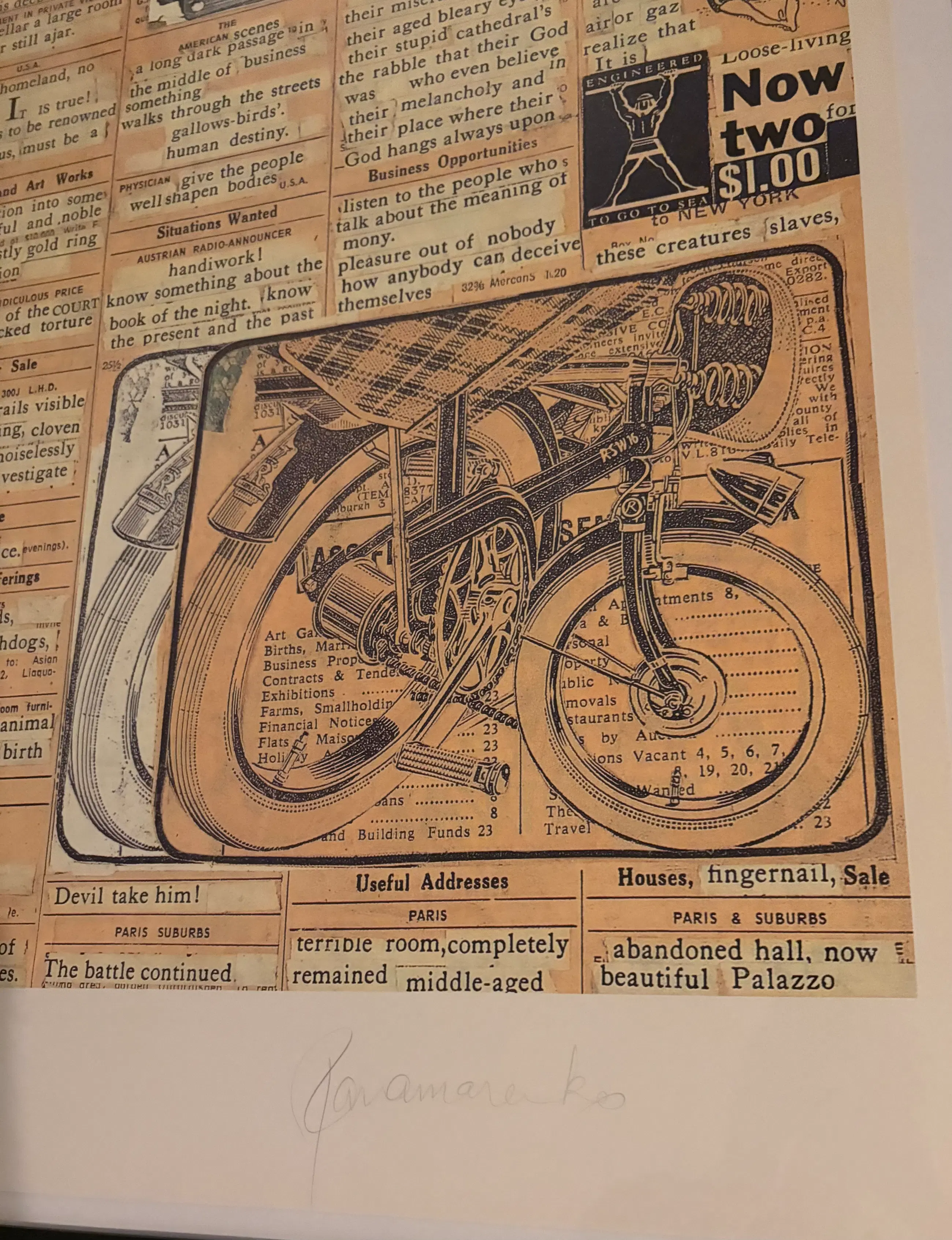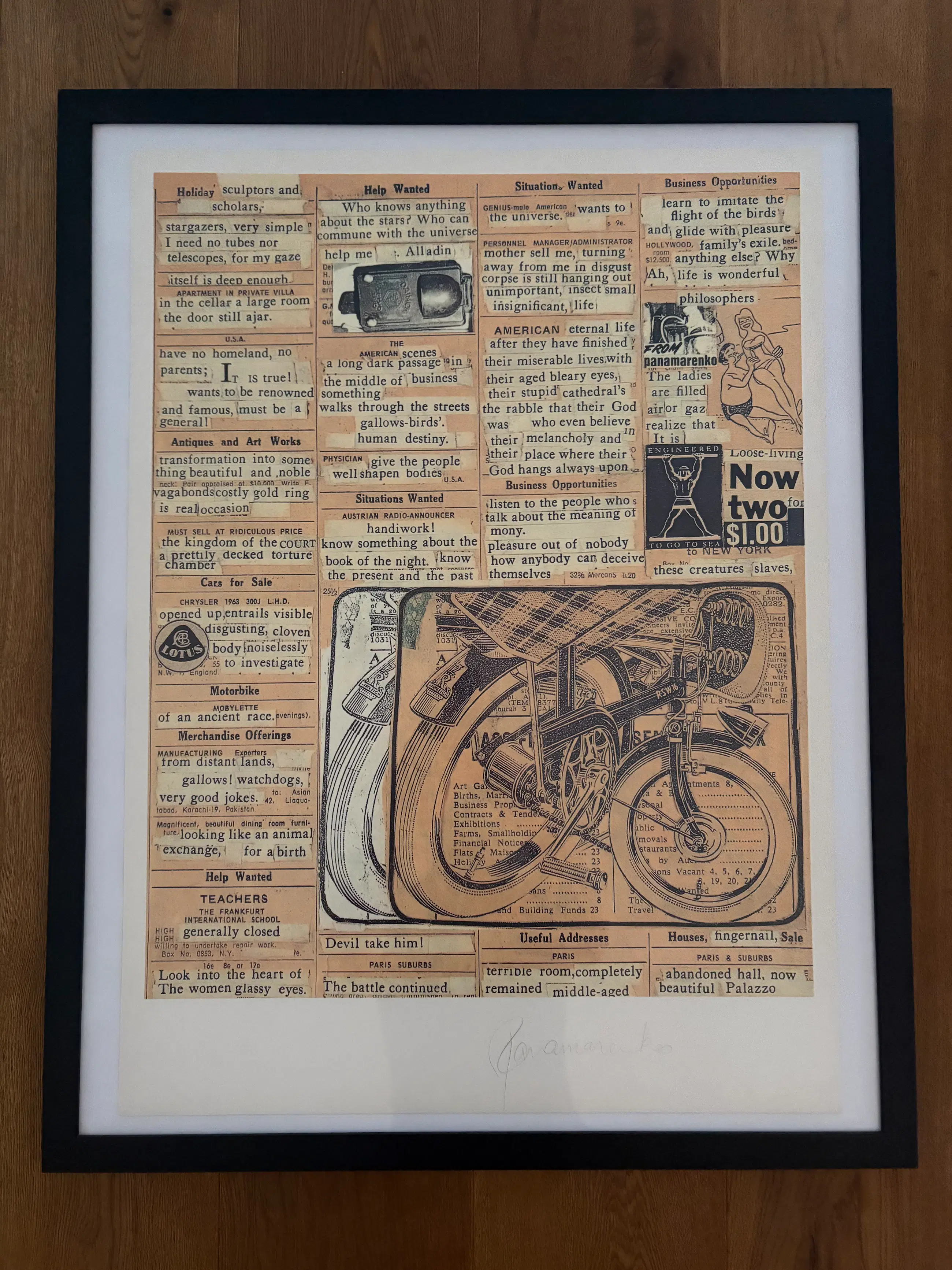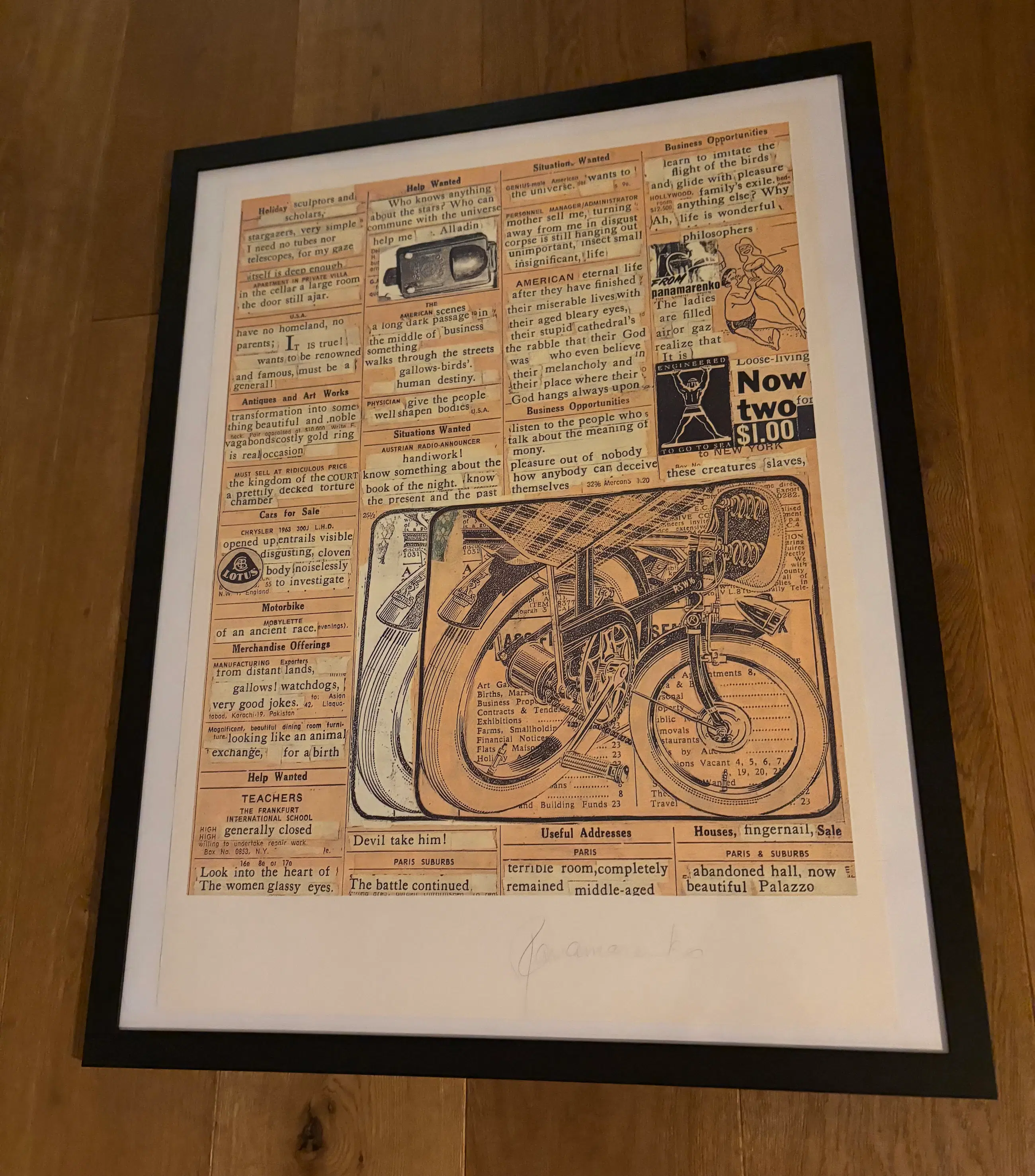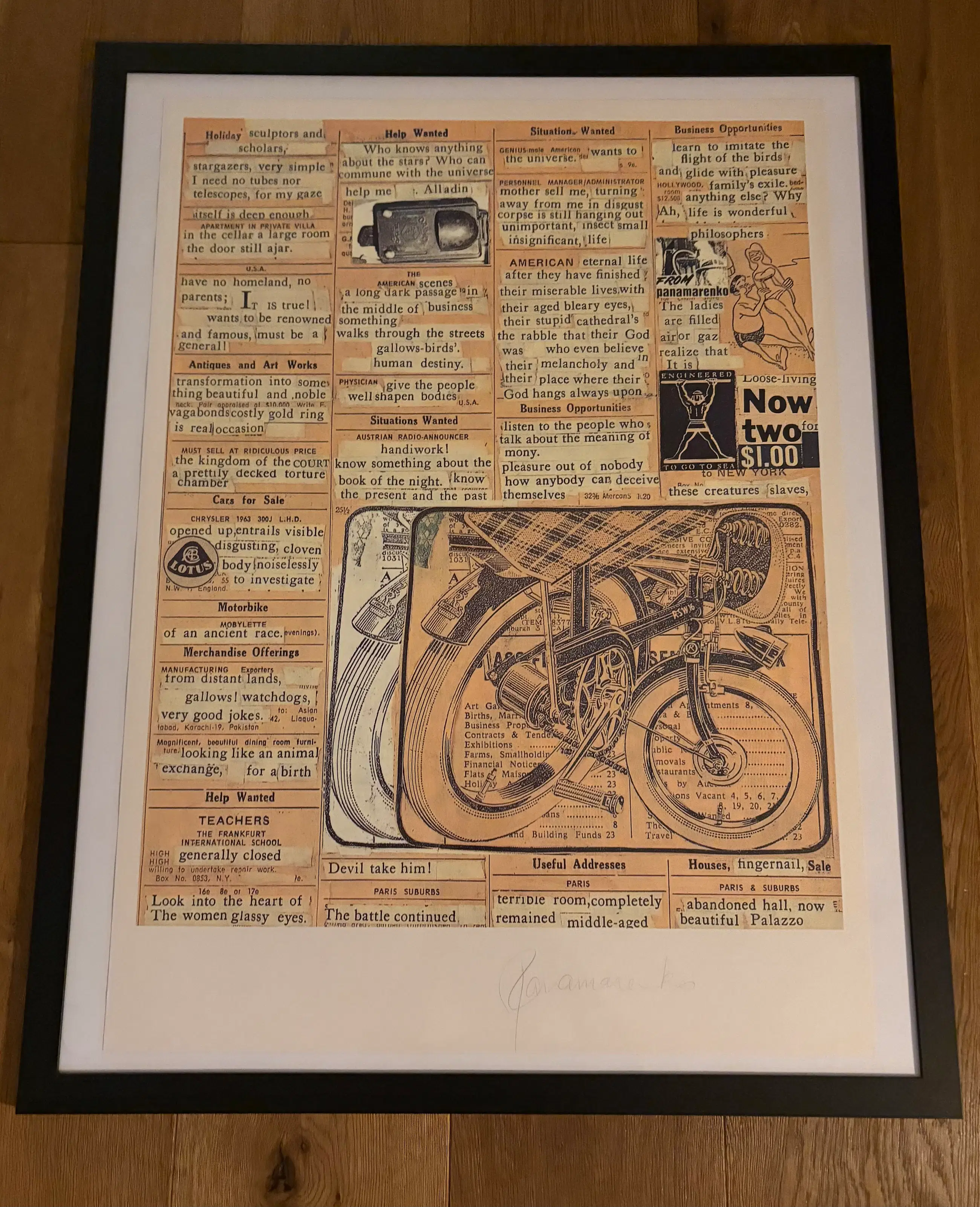 Print/collage van Panamarenko's Milky Way & Happenings reeks uit 2003. Deze prints zijn geinspireerd op collages uit de jaren '60 Is Ingeframed in zwarte kader 90x70 cm Klein plooitje in Li-onderzoek (zie foto 2) Weg te werken mits paspartout, niet storend. Verder prima conditie! Versturen of op te halen in Peer Limburg.
