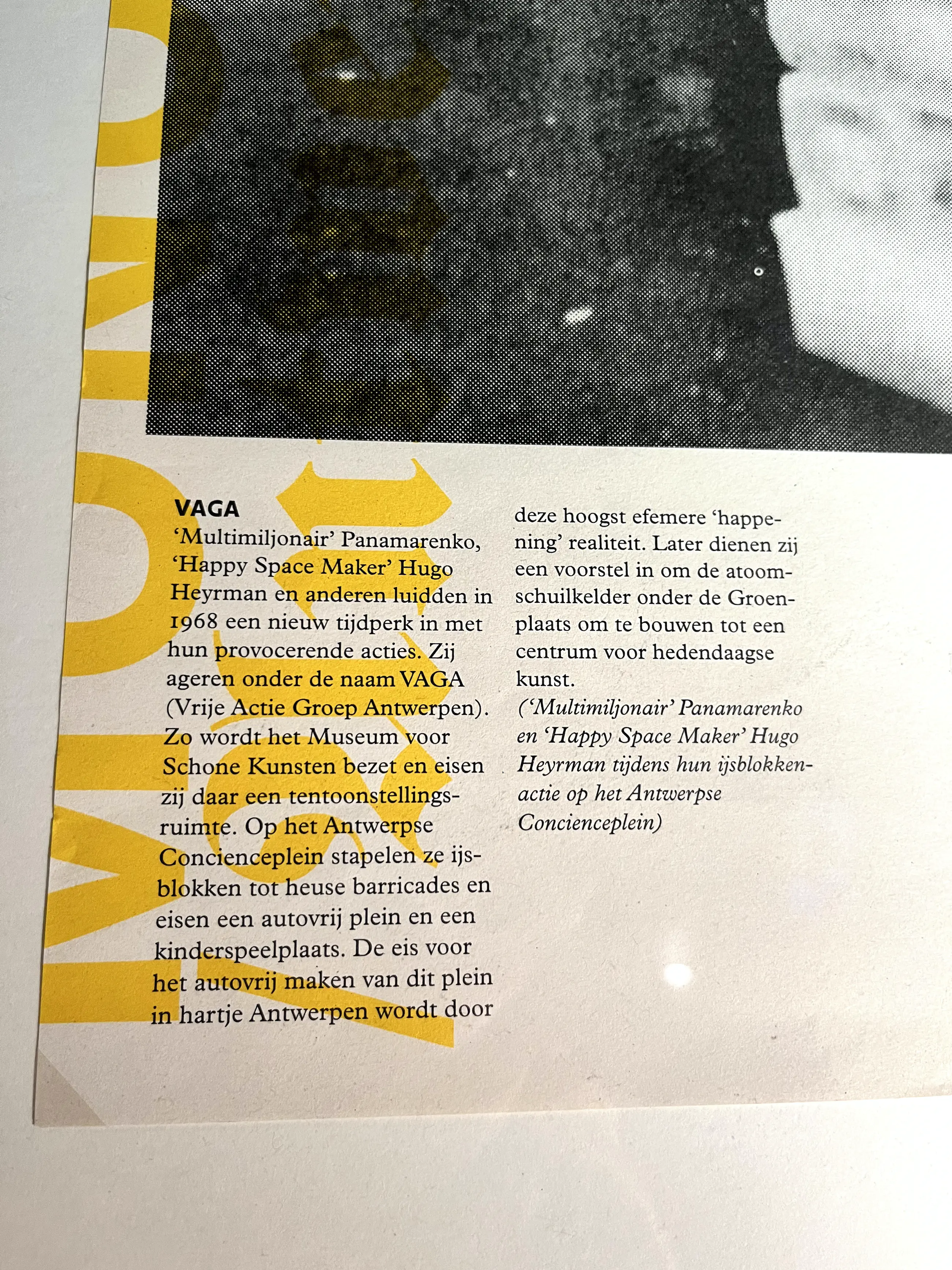 Ijsblokkenactie, Antwerpen 1968VAGA, 'Multimiljonair' Panamarenko, 'Happy Space Maker'Hugo Heyrman en anderen luidden in 1968 een nieuw tijdperk in met hun provocerende acties. Zij ageren onder de naam VAGA (Vrije actie Groep Antwerpen). Zo wordt het Museum voor Schone Kunsten bezet en eisen zij daar een tentoonstellingsruimte. Op het Antwerpse Conscienceplein stapelen ze ijsblokken tot heuse barricades en eisen een autovrij plein en een kinderspeelplaats. De eis voor het autovrij maken van dit pleintje in hartje Antwerpen wordt door deze hoogst efemere 'happening' realiteit. Later dienen zij een voorstel in om de atoomschuilkelder onder de Groenplaats om te bouwen tot een centrum voor hedendaagse kunst.