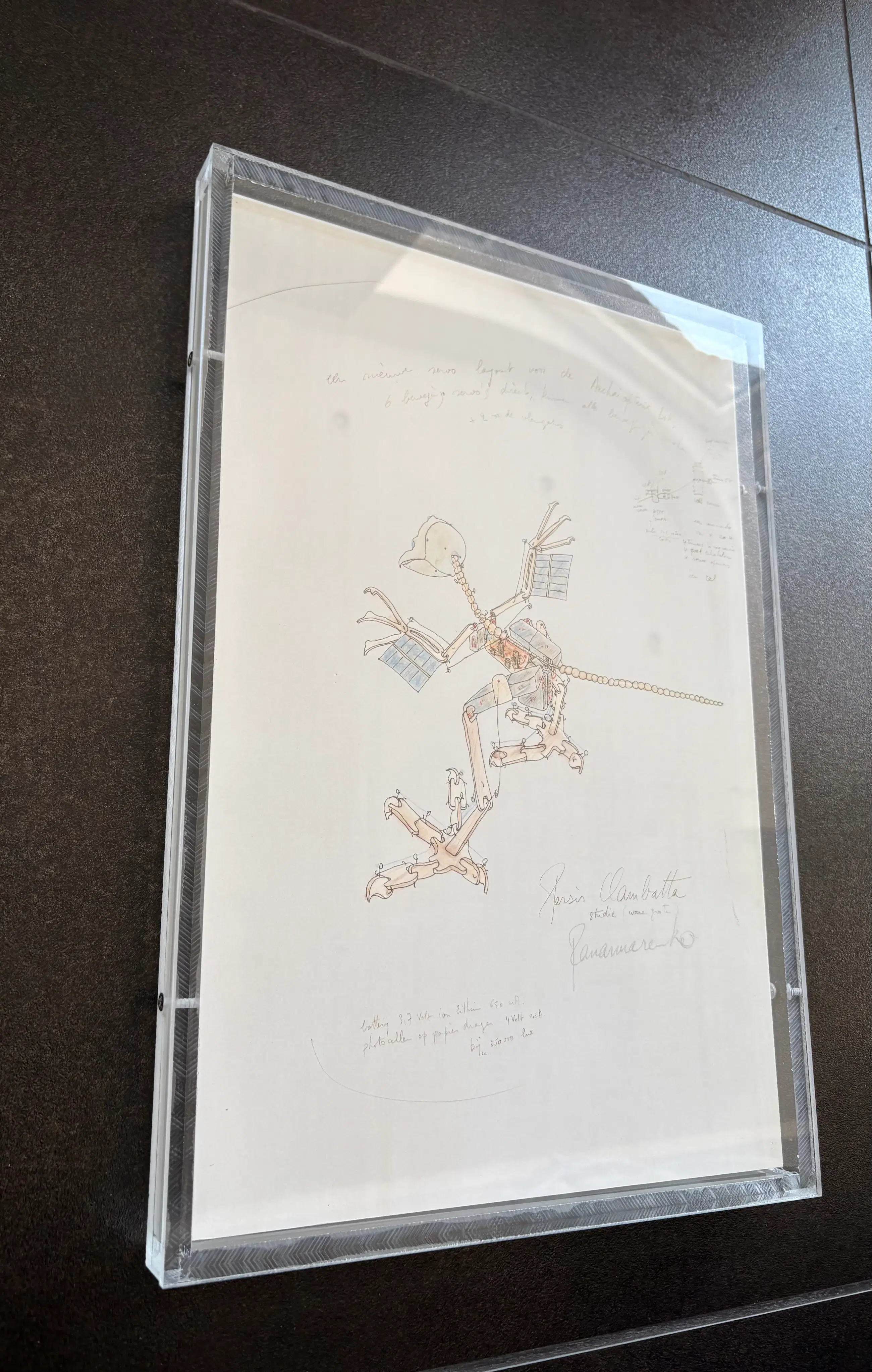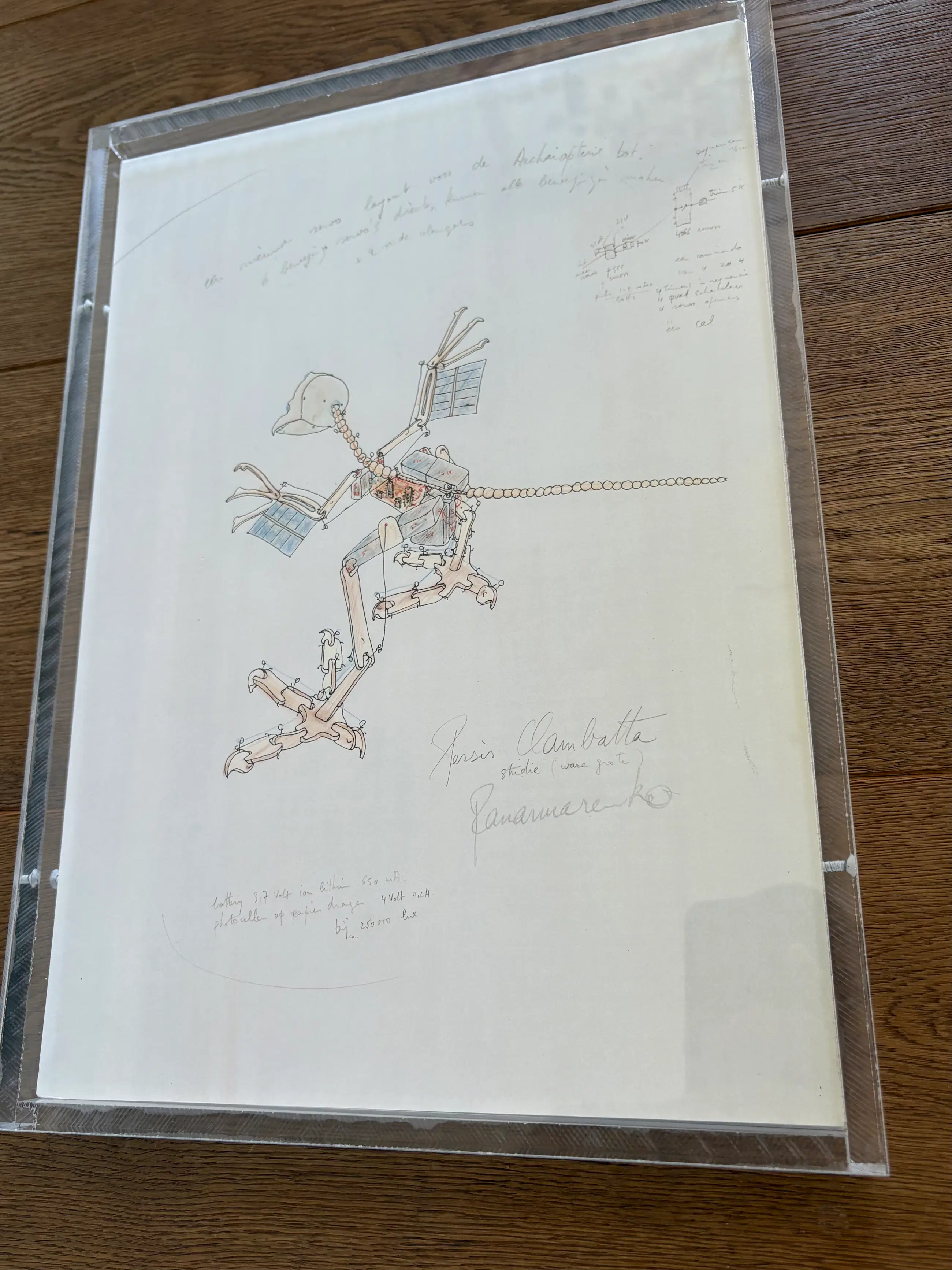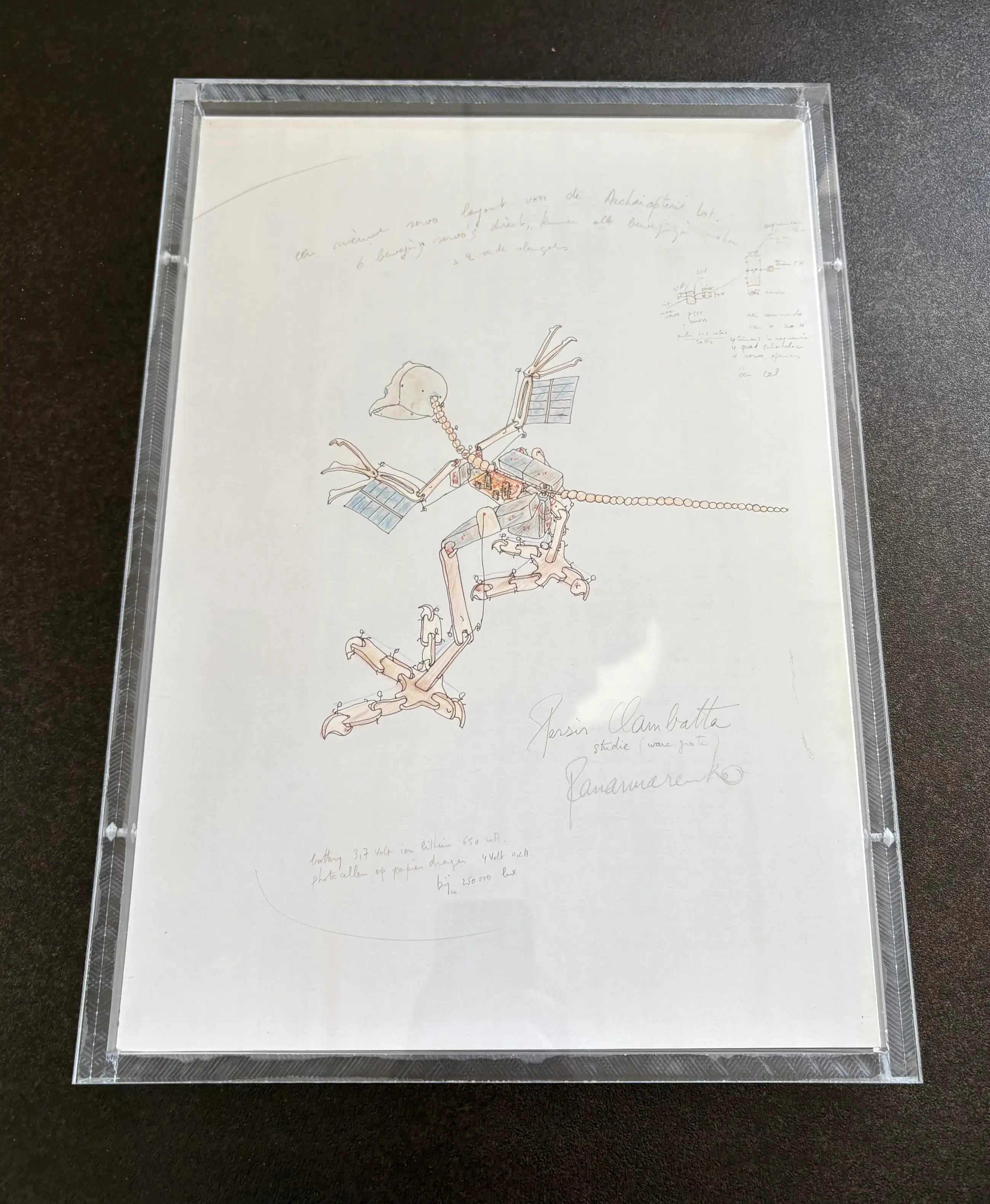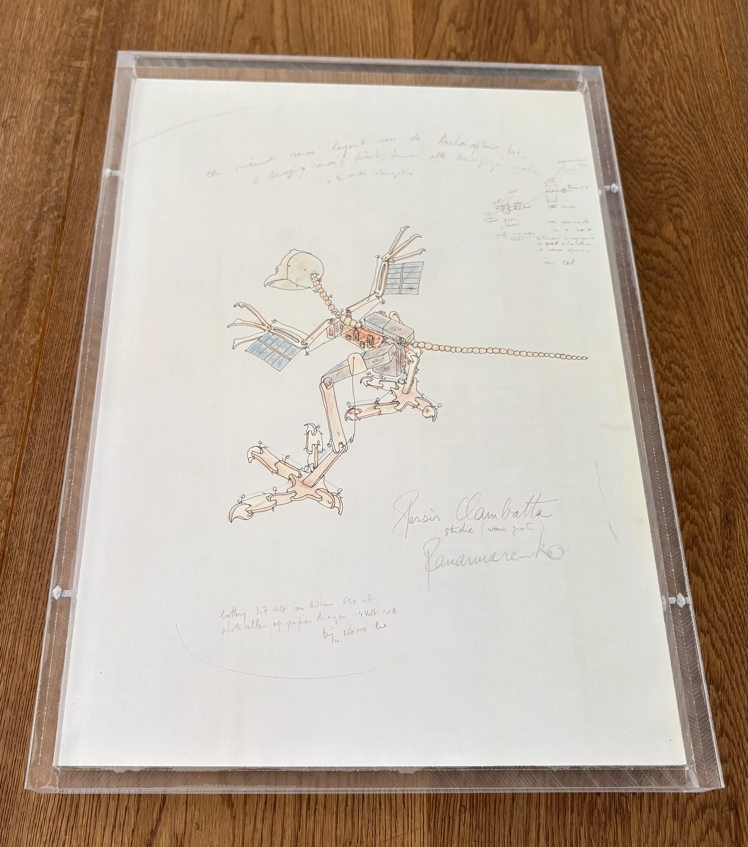 Offsetprint “Persis clambatta” Panamarenko Professioneel Ingeframed in transparante plexibox 34x31 cm Gesigneerd in druk Zeer goede conditie.