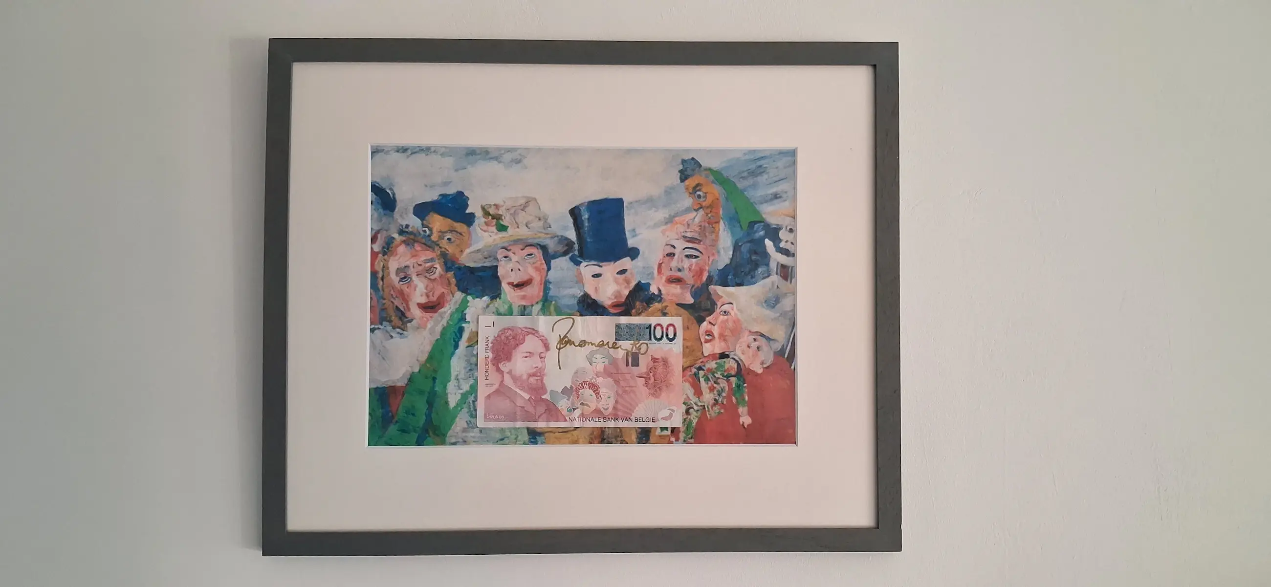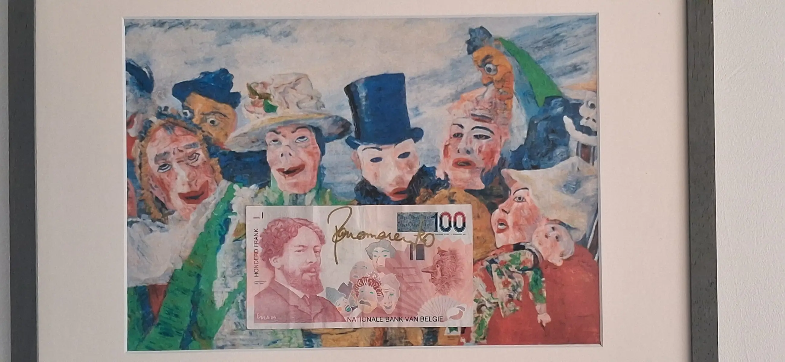 Uniek werk van Panamarenko. Getekend biljet van 100 frank met afbeelding van Ensor op afbeelding van het werk 'De Intrige' van Ensor. Handgesigneerd door Panamarenko. Ontspiegeld glas. Professioneel ingekaderd