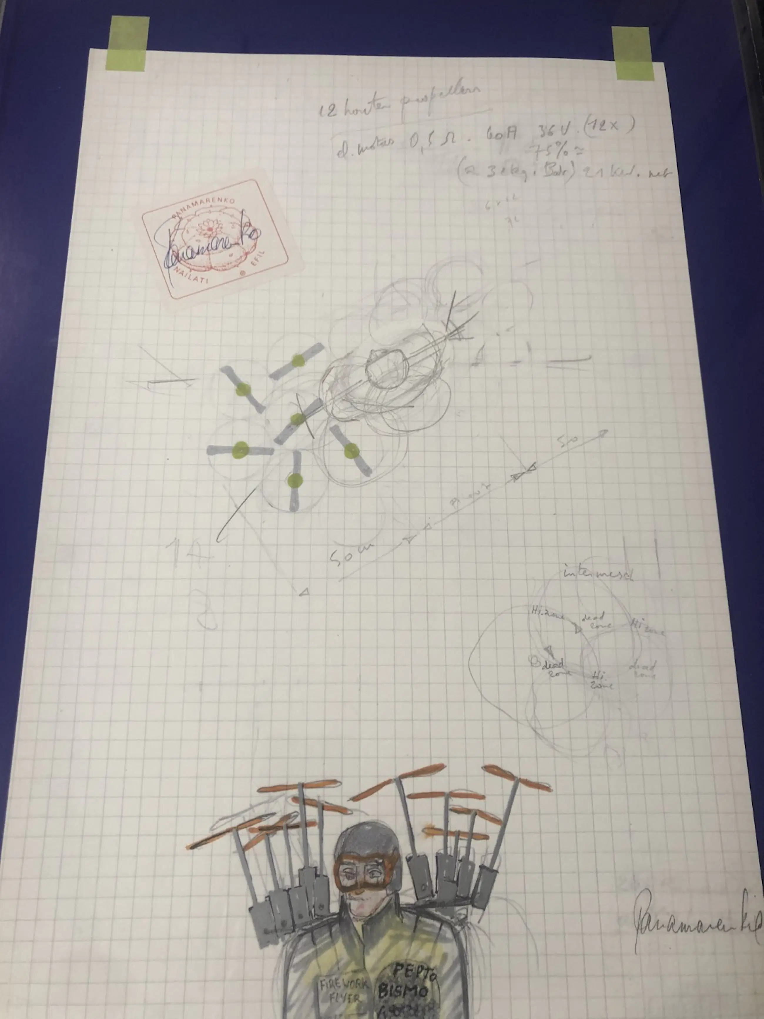 Panamarenko's Pepto Bismo = human helicopter met 12 houten propellers. Benoemd op het werk als de Fire Work Flyer. Zie ook de kenmerkende technische tekeningen en berekeningen, onder andere bovenaanzicht van de 12 propellers.