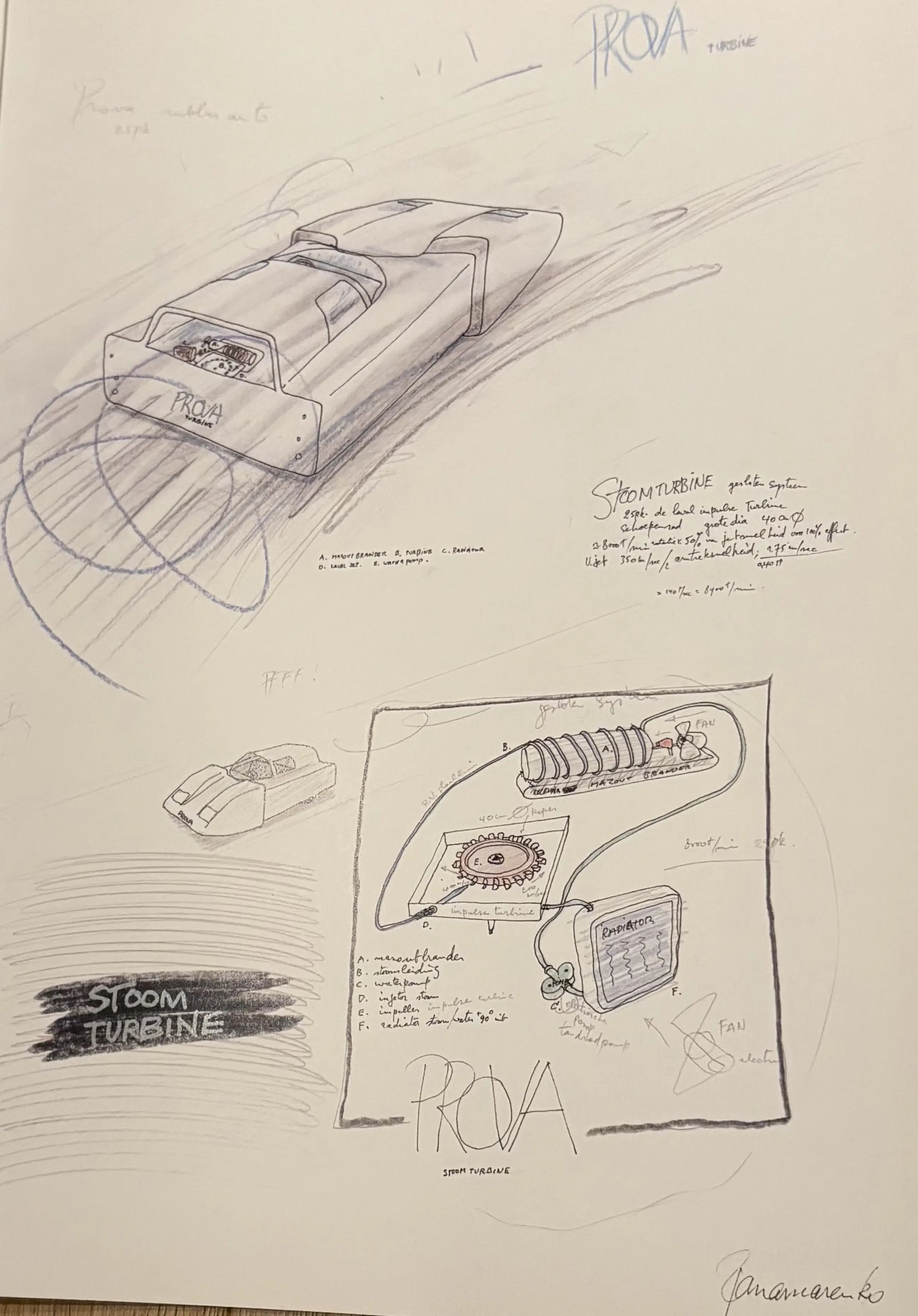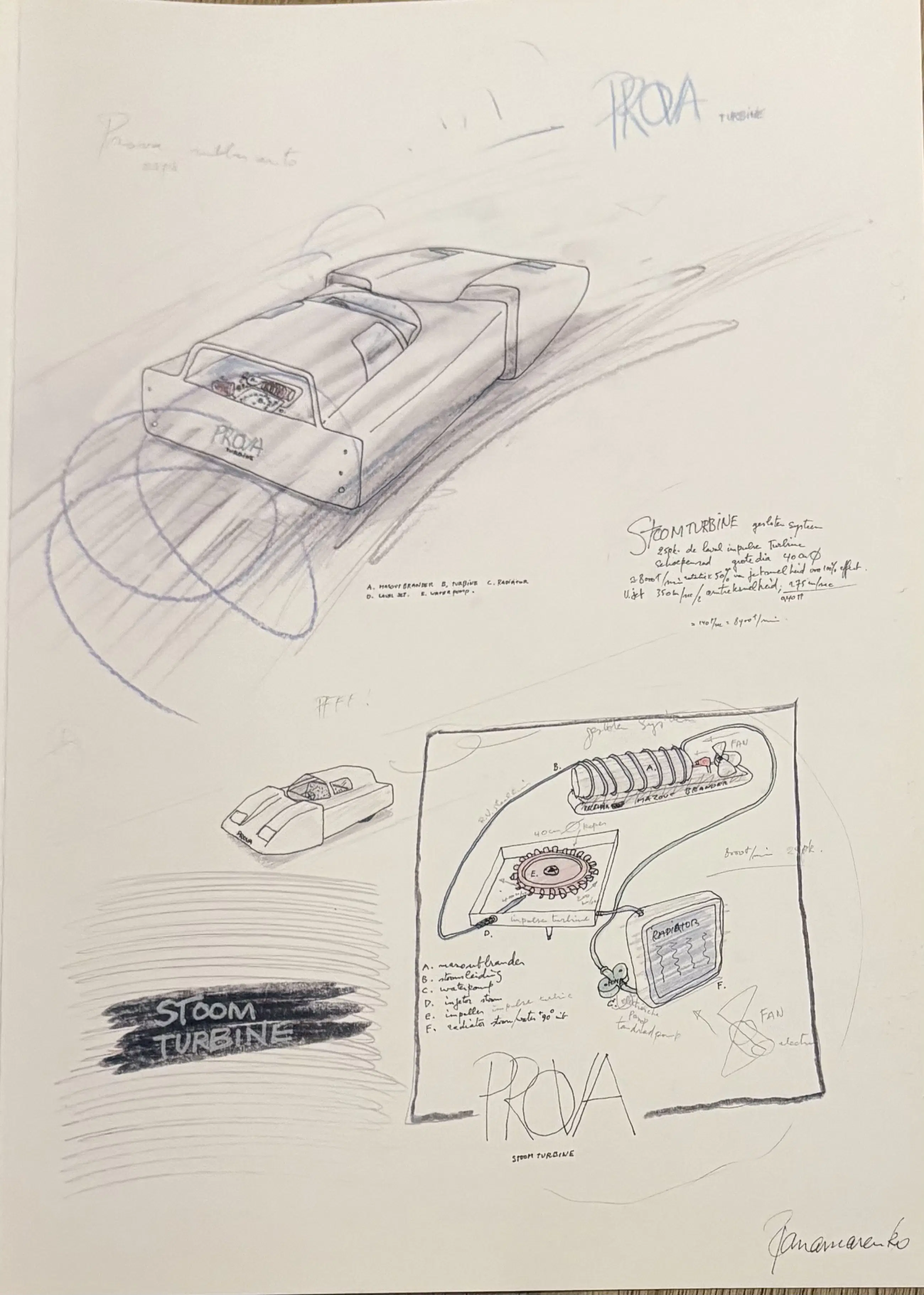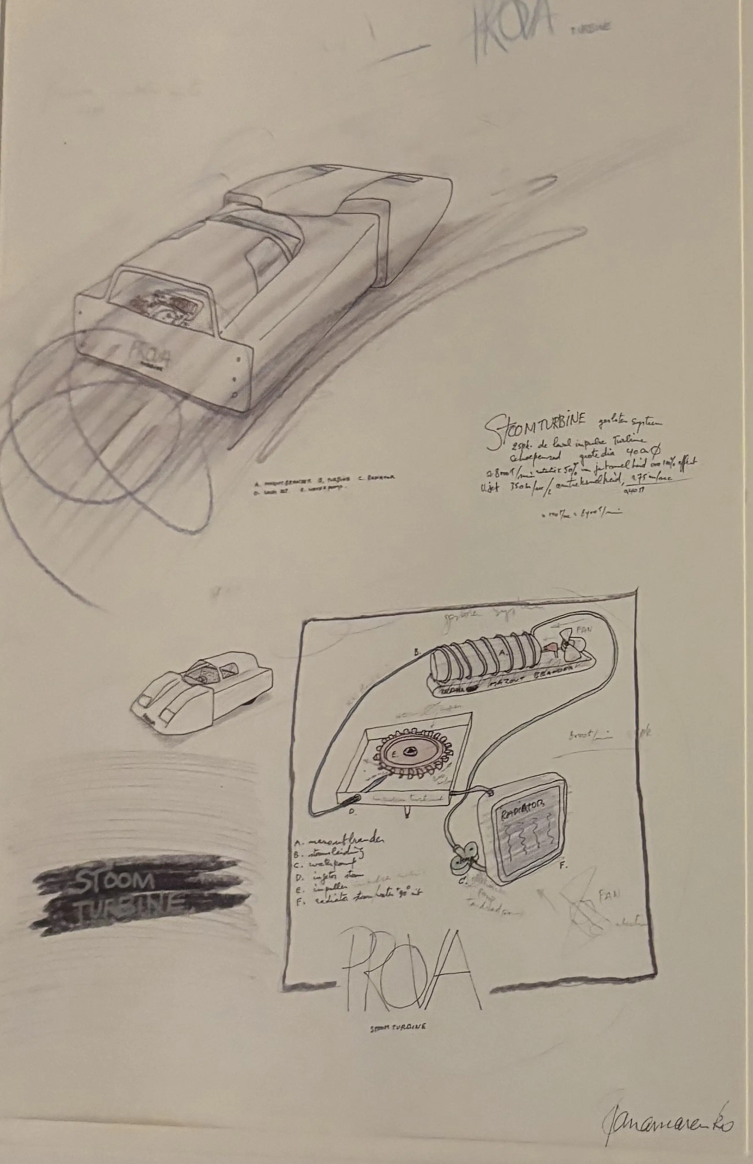 -Offsetlitho met zilverdruk; 1 deel van drieluik- uitnodiging uitgegeven in 2004 door Van De Velde Ronny ter promotie van de werken prova car , arlikoop en vliegend eiland in de Antwerpse luchtschipbouw Borgerhout. Prova Car is geen performante bolide; de uiterlijke suggestie ervan is des te overtuigender.